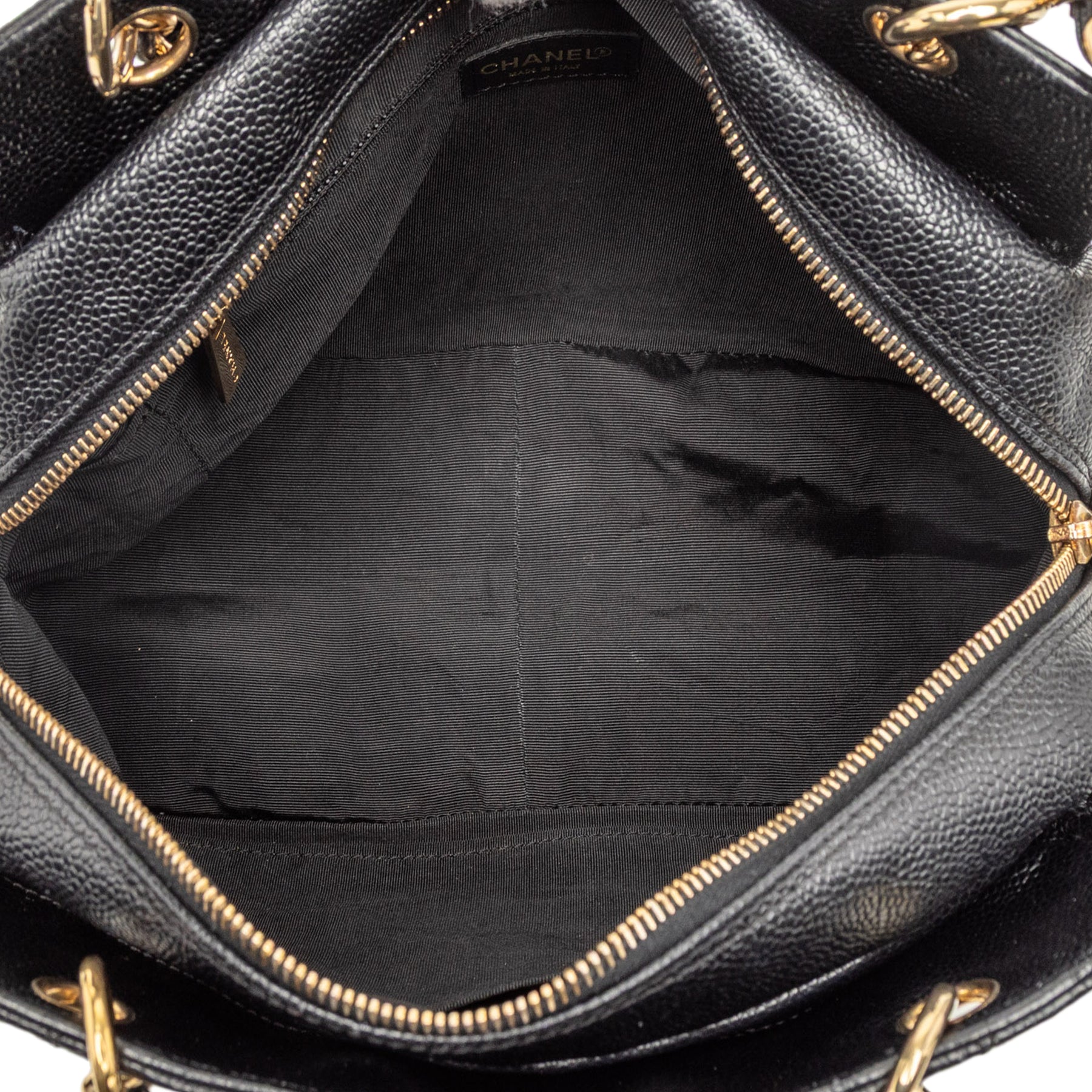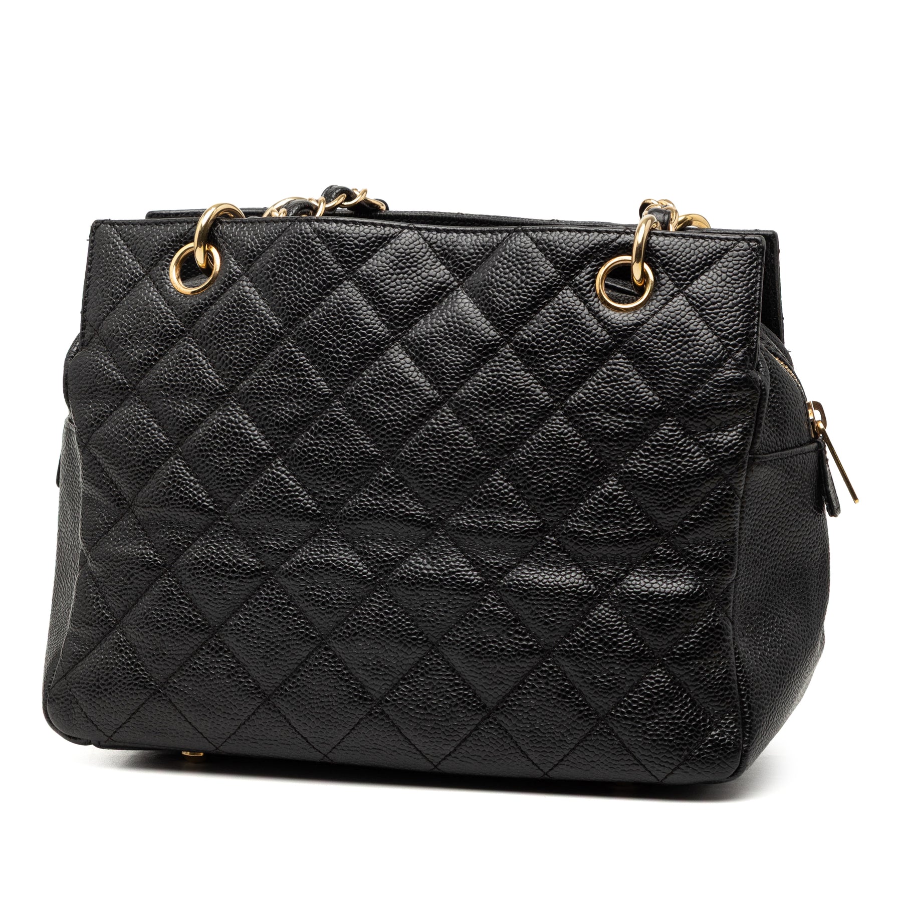 Le petit sac cabas Shopping Tote est confectionné en cuir caviar, avec des anses en chaîne tressée de cuir, une fermeture zippée sur le dessus et des poches intérieures zippées et plaquées. Il est en bon état.