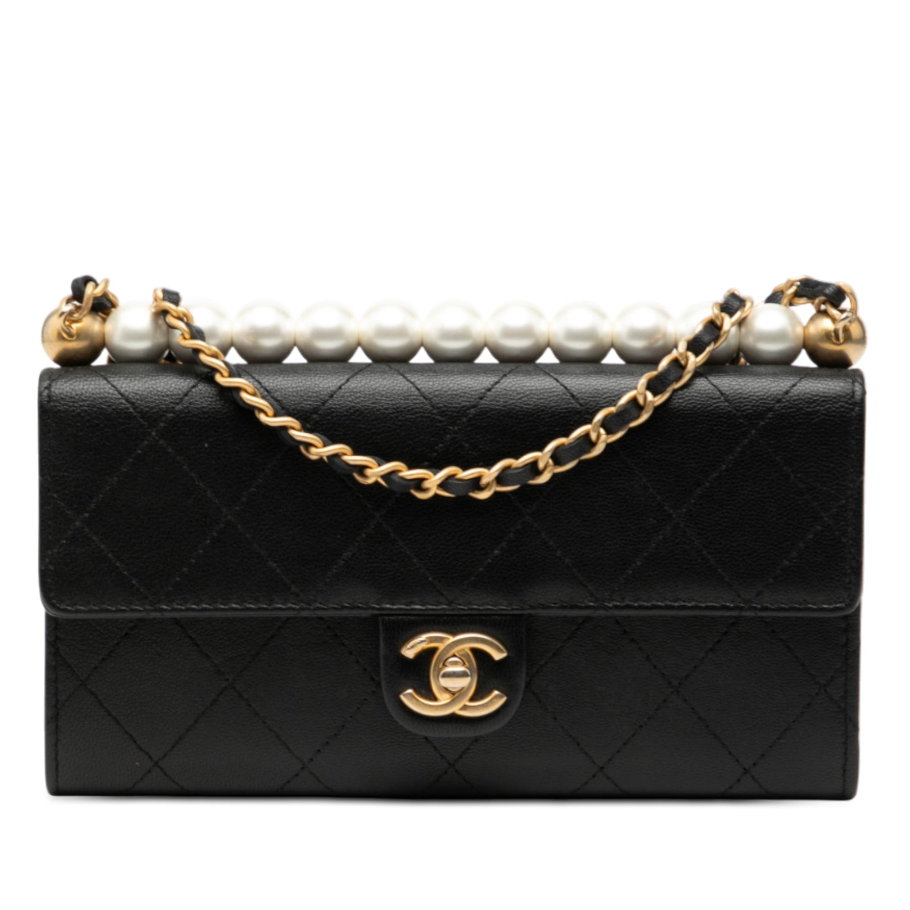 Ce sac bandoulière est confectionné en cuir de chèvre matelassé orné de fausses perles, et possède une bandoulière en chaîne tressée, un rabat avant avec fermoir CC, ainsi que des poches intérieures zippées et plaquées. Il est en bon état.