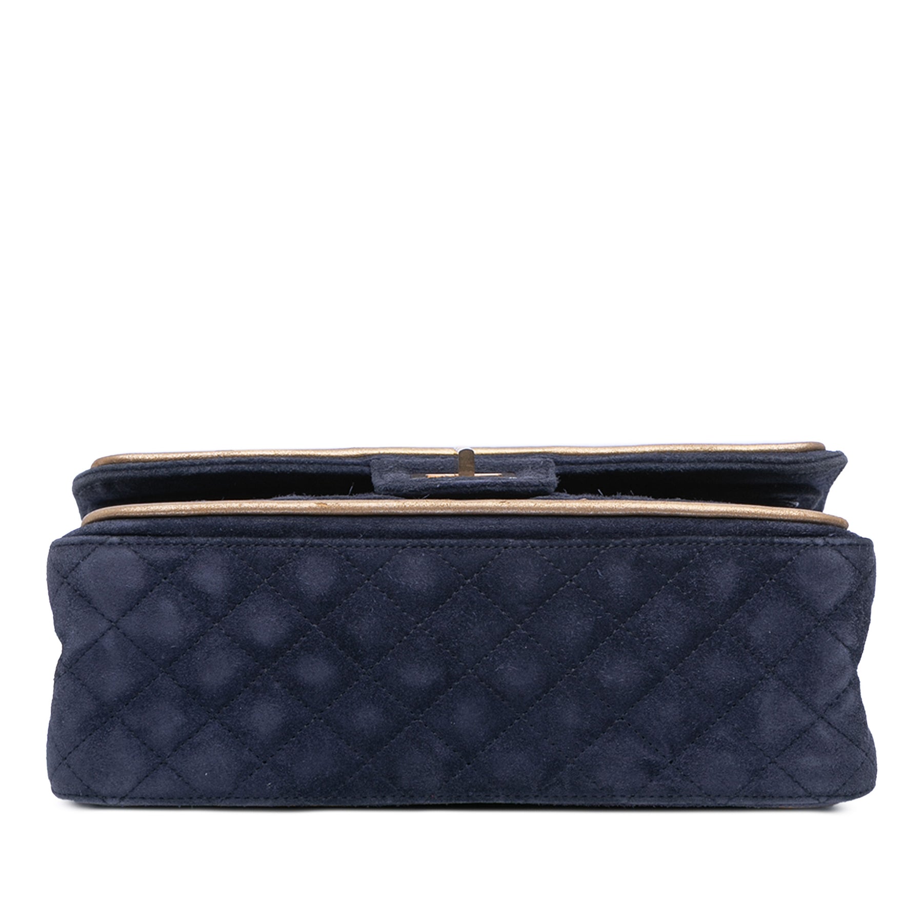 Ce sac à rabat est en daim matelassé avec des finitions en cuir métallisé, une chaînette, un double rabat avant avec fermeture à tourniquet, ainsi que des poches intérieures zippées et plaquées. Il est en bon état.