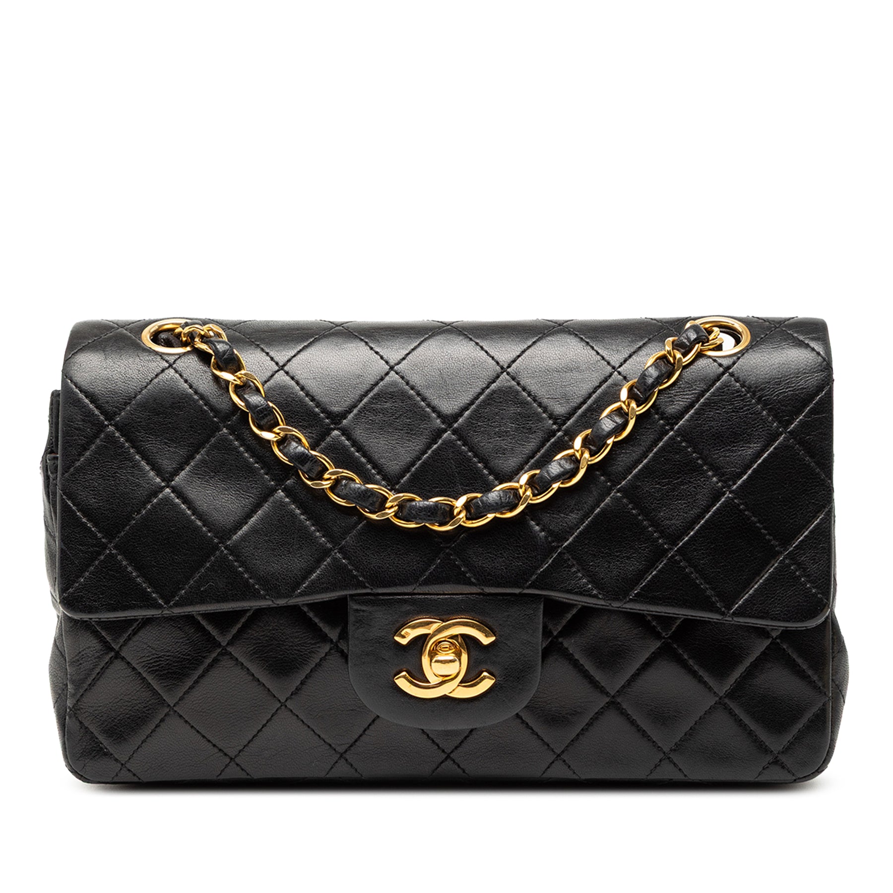 Ce sac bandoulière est confectionné en cuir d'agneau matelassé et possède une bandoulière en chaîne tressée de cuir, un double rabat avant orné du double C entrelacé et d'une fermeture à tourniquet, une poche plaquée extérieure au dos et des poches plaquées intérieures. Il est en bon état.