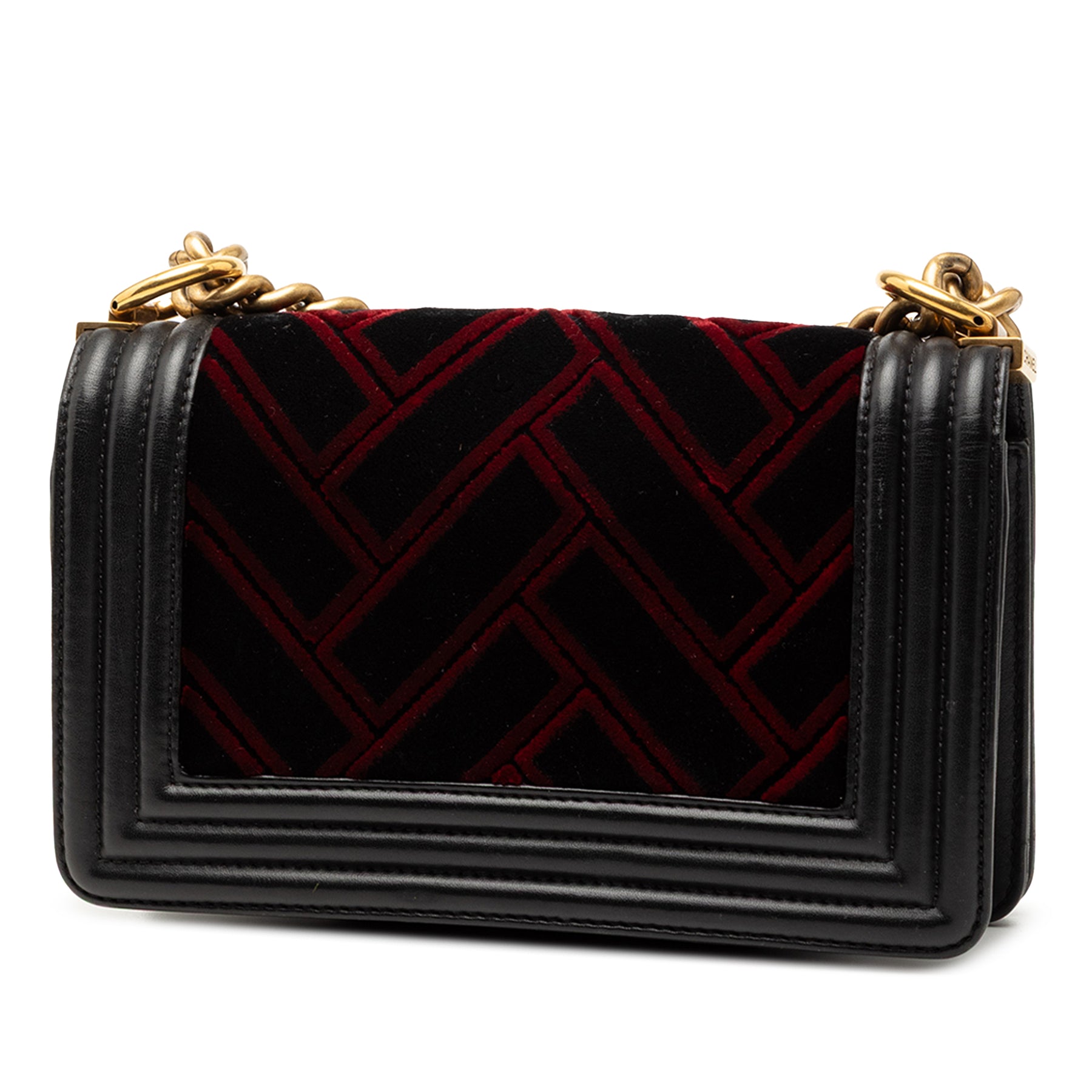 Le sac Boy Flap est confectionné en velours et cuir, possède une bandoulière chaîne gourmette avec protection en cuir, un rabat avant à fermeture poussoir et une poche intérieure plaquée. Il est en bon état.