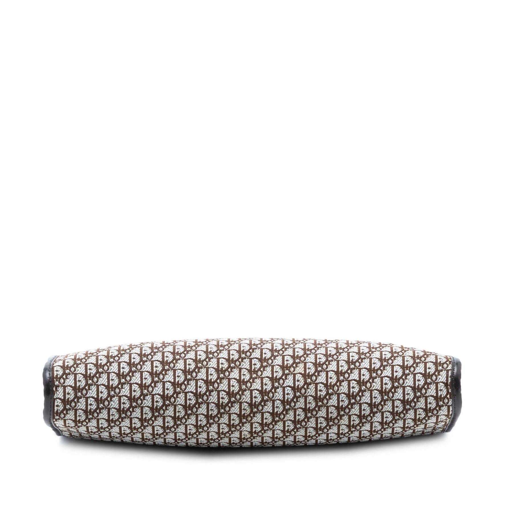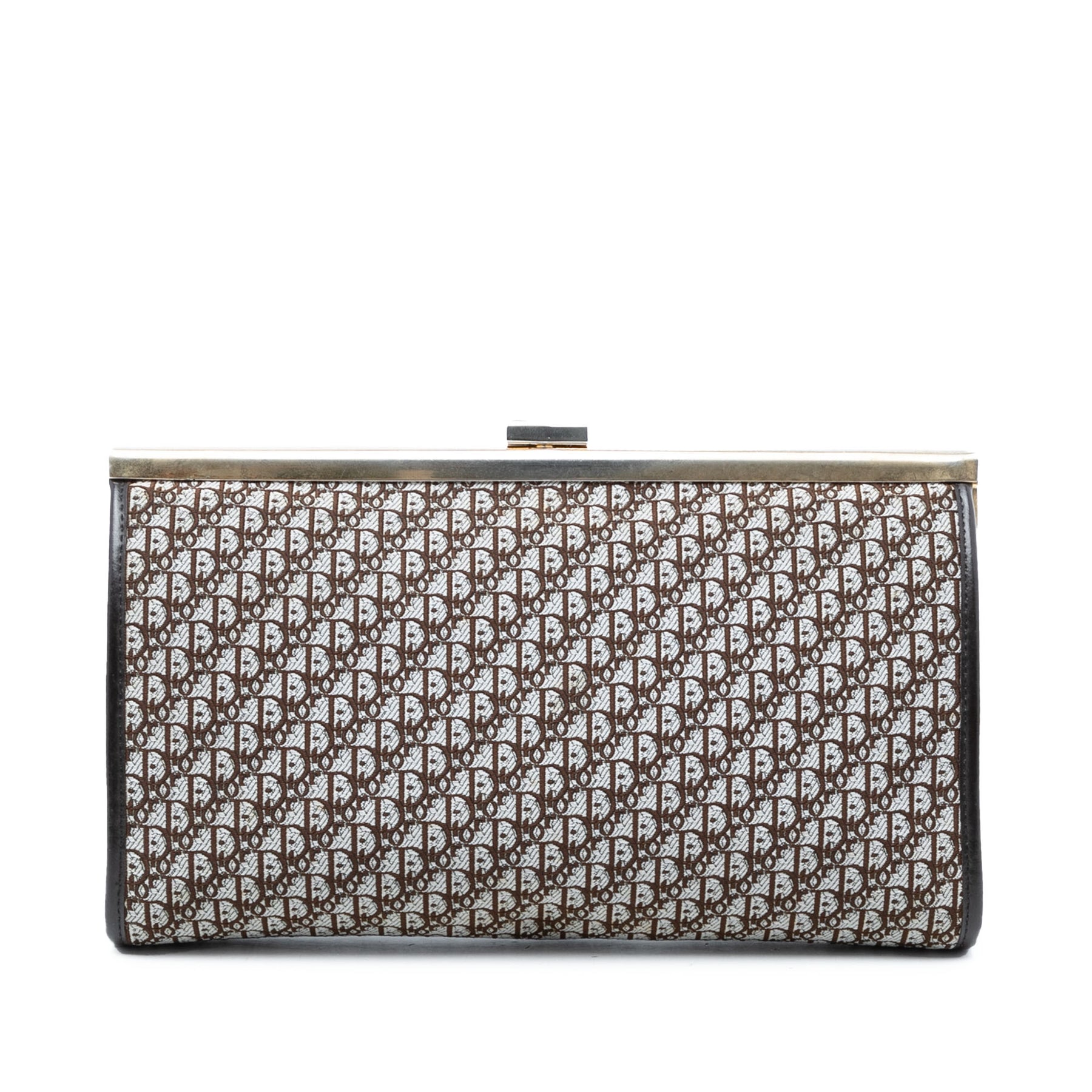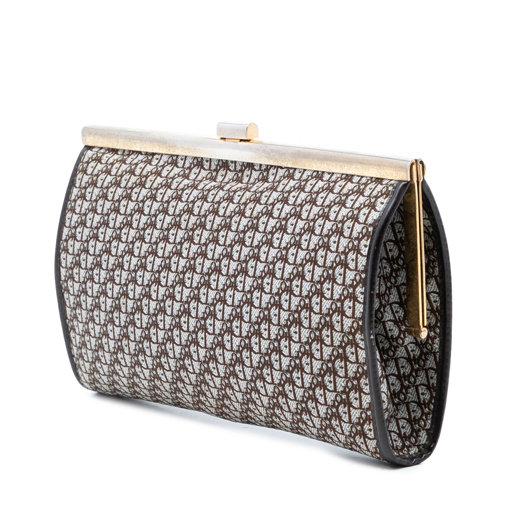 Cette pochette est en toile avec des finitions en cuir et une fermeture à fermoir sur le dessus. Elle est en excellent état.
