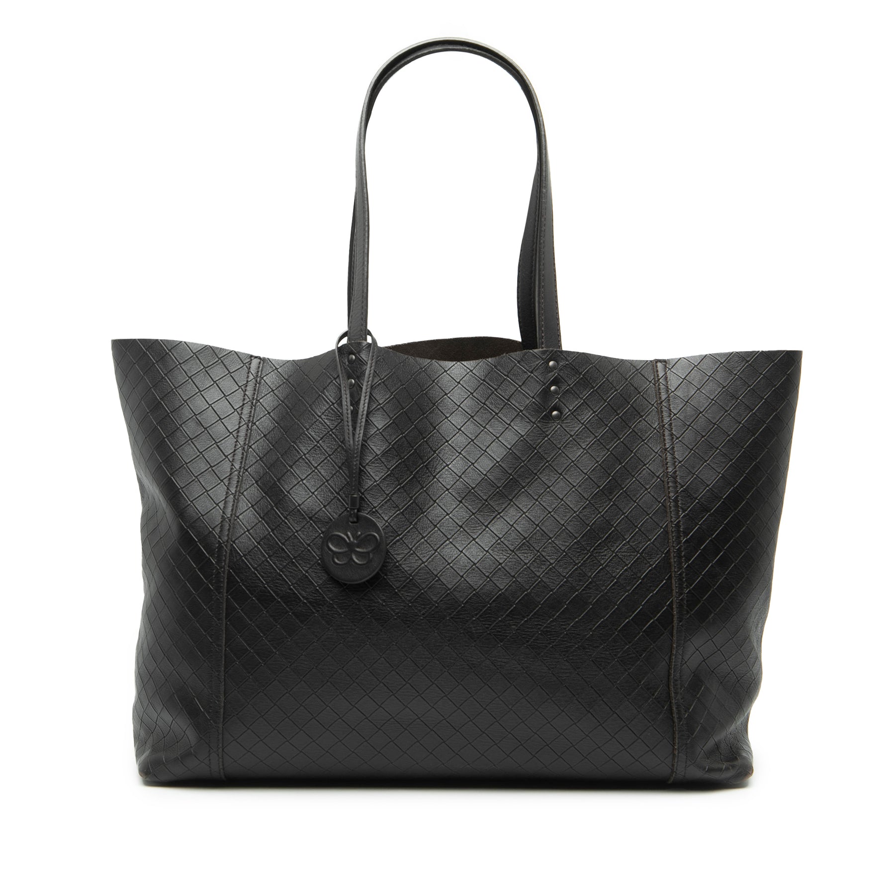 Ce sac cabas est en cuir gaufré, possède des bandoulières plates en cuir et une ouverture sur le dessus. Il est en bon état.