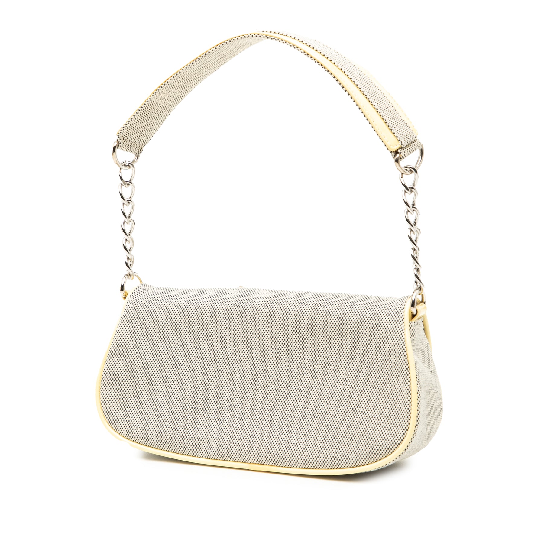 Le sac bandoulière n° 5 est confectionné en toile avec des finitions en cuir verni, une bandoulière chaîne gourmette avec une protection plate en cuir et toile, un rabat avant à fermeture magnétique et une poche intérieure plaquée. Il est en excellent état.