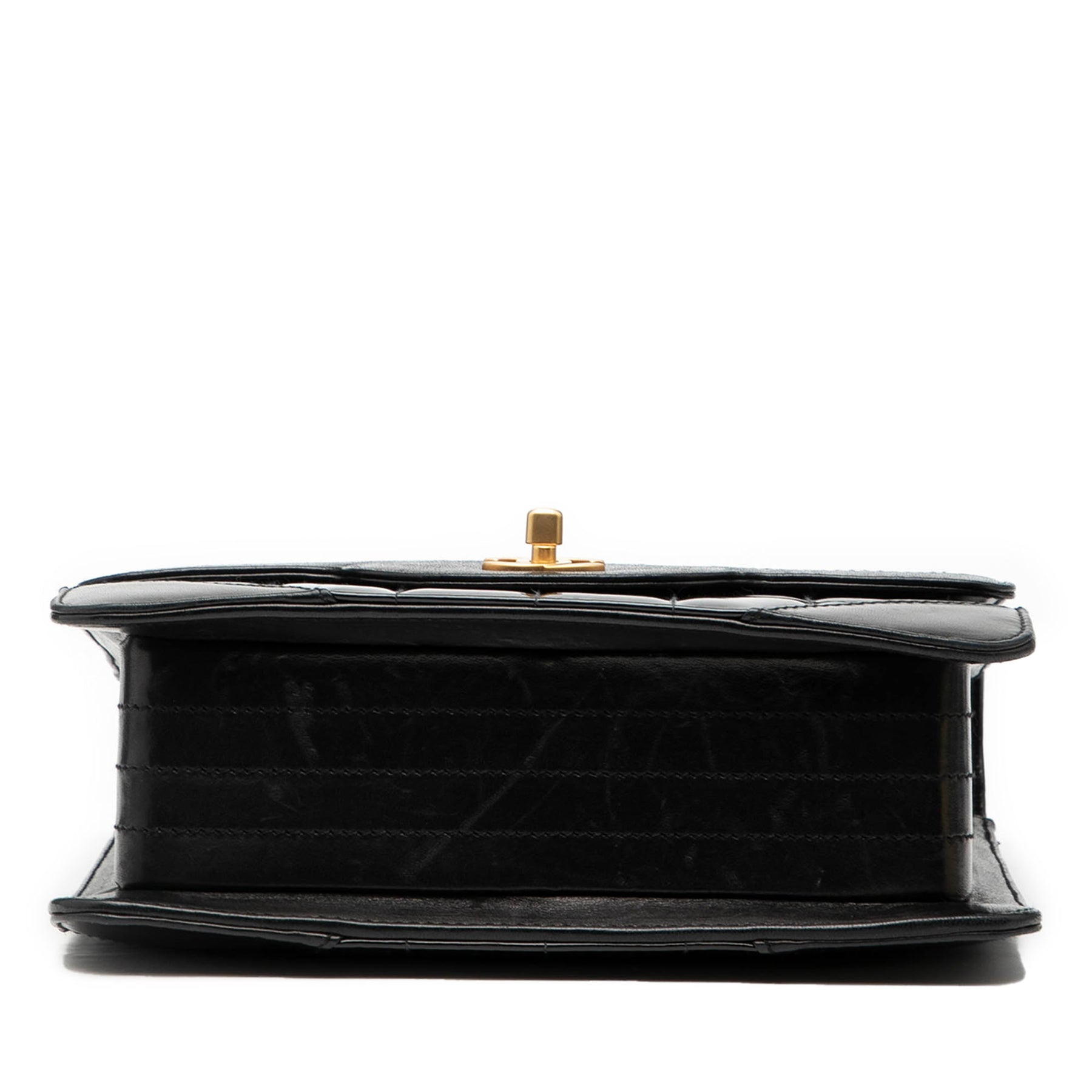 Ce sac bandoulière est confectionné en cuir verni et agneau, avec une bandoulière en chaîne tressée de cuir, un rabat avant à fermoir tourniquet, une poche plaquée extérieure au dos et des poches intérieures zippées et plaquées. Il est en bon état.