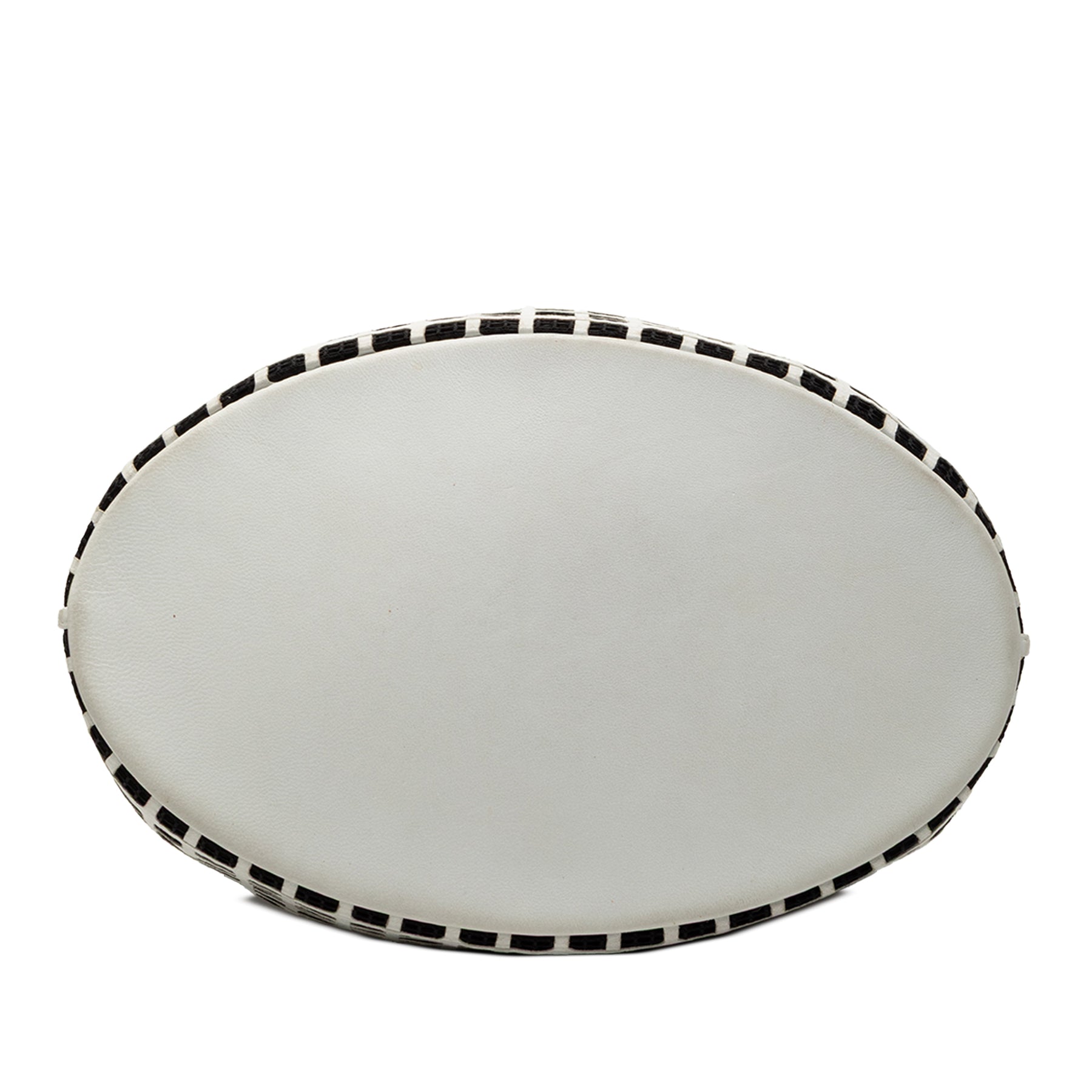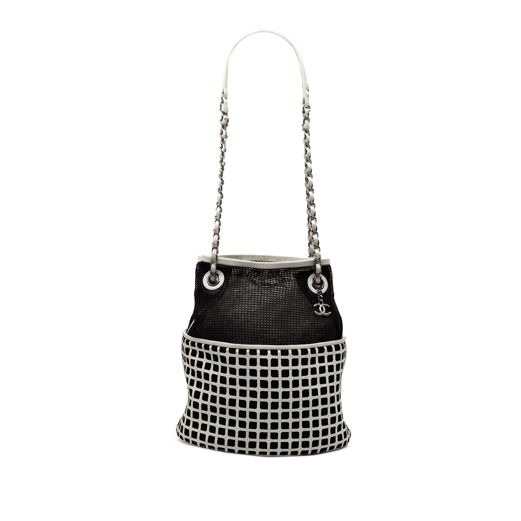 Ce sac seau est confectionné en maille et cuir de veau, possède des bandoulières en chaîne tressée de cuir et une ouverture sur le dessus. Il est en bon état.