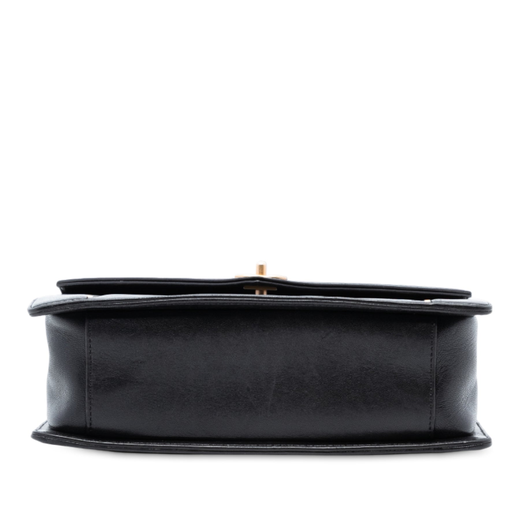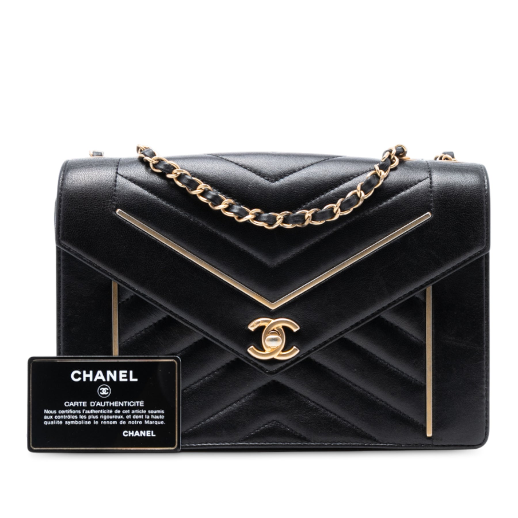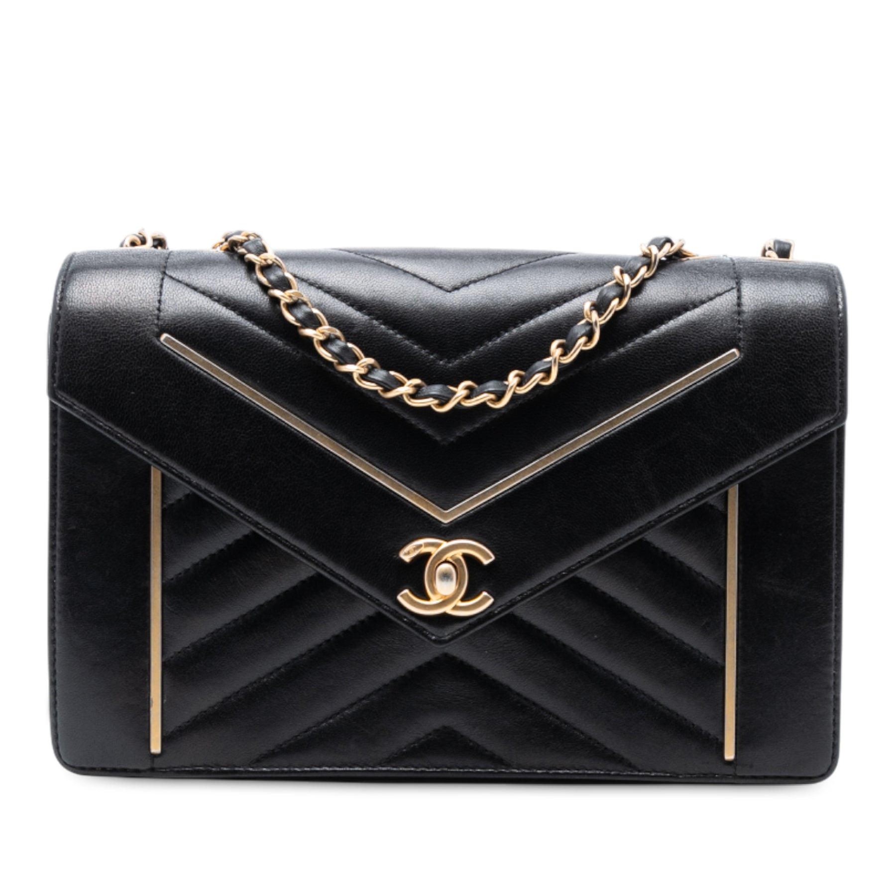 Ce sac bandoulière est confectionné en cuir matelassé à chevrons et possède une bandoulière en chaîne tressée avec une protection d'épaule en cuir. Il est doté d'un rabat avant orné du double C entrelacé et d'une fermeture à tourniquet, ainsi que de poches intérieures zippées et plaquées. Son état est bon.