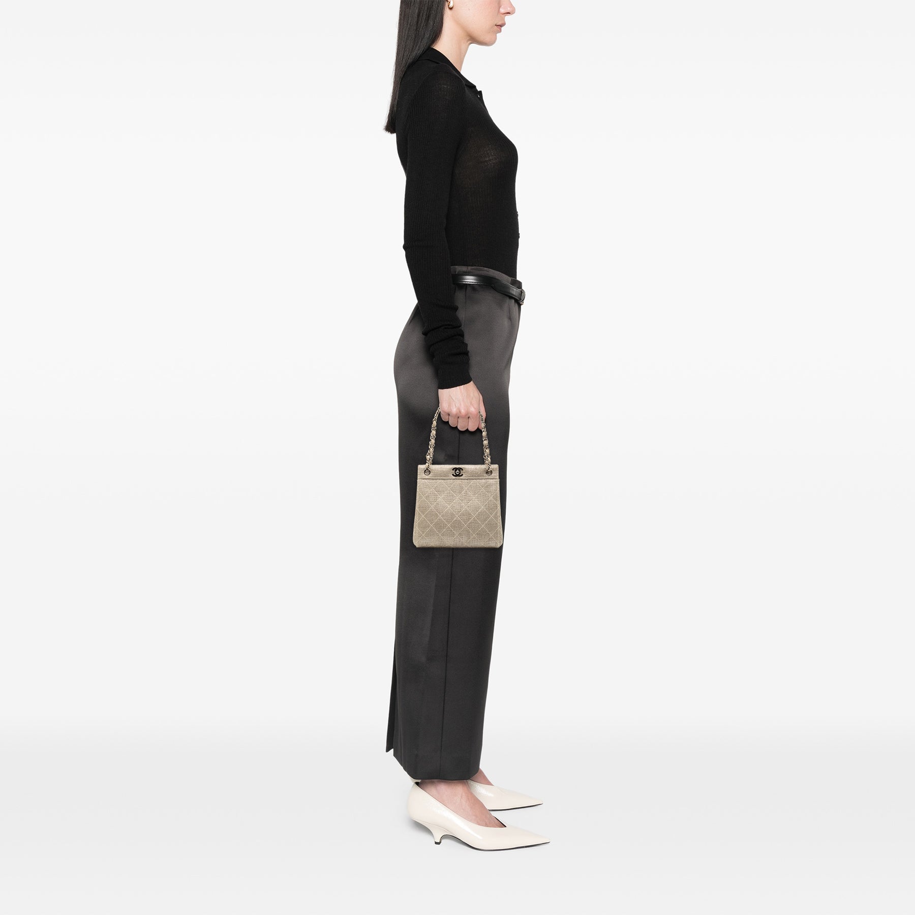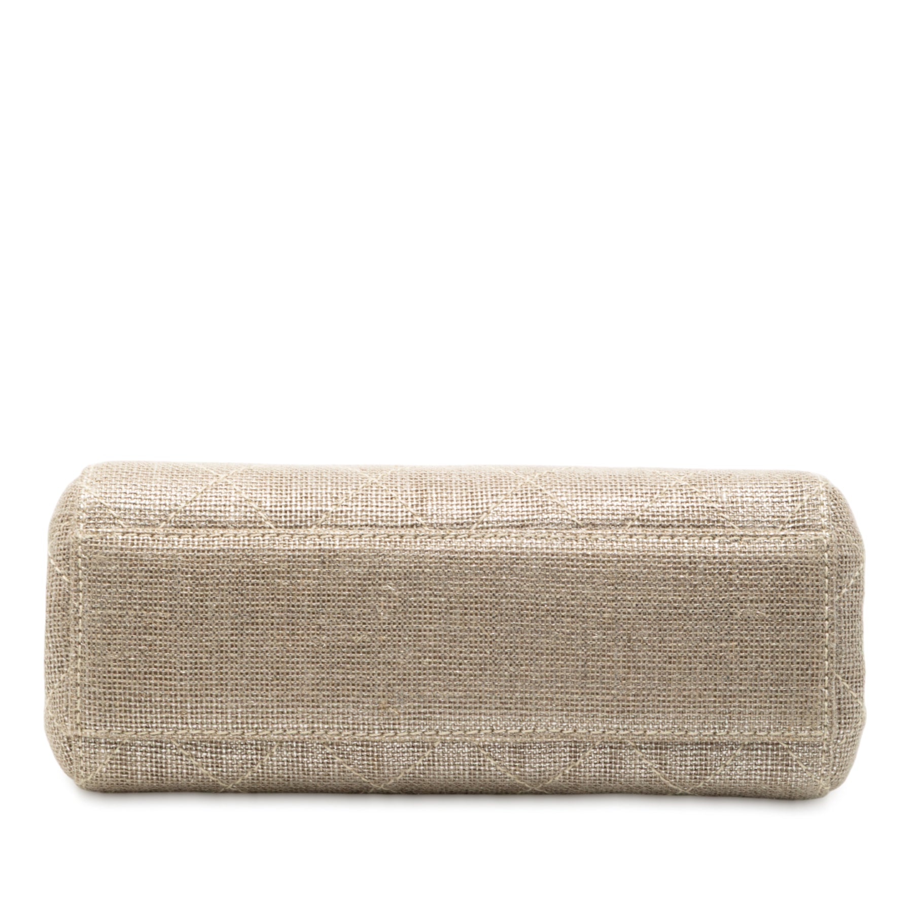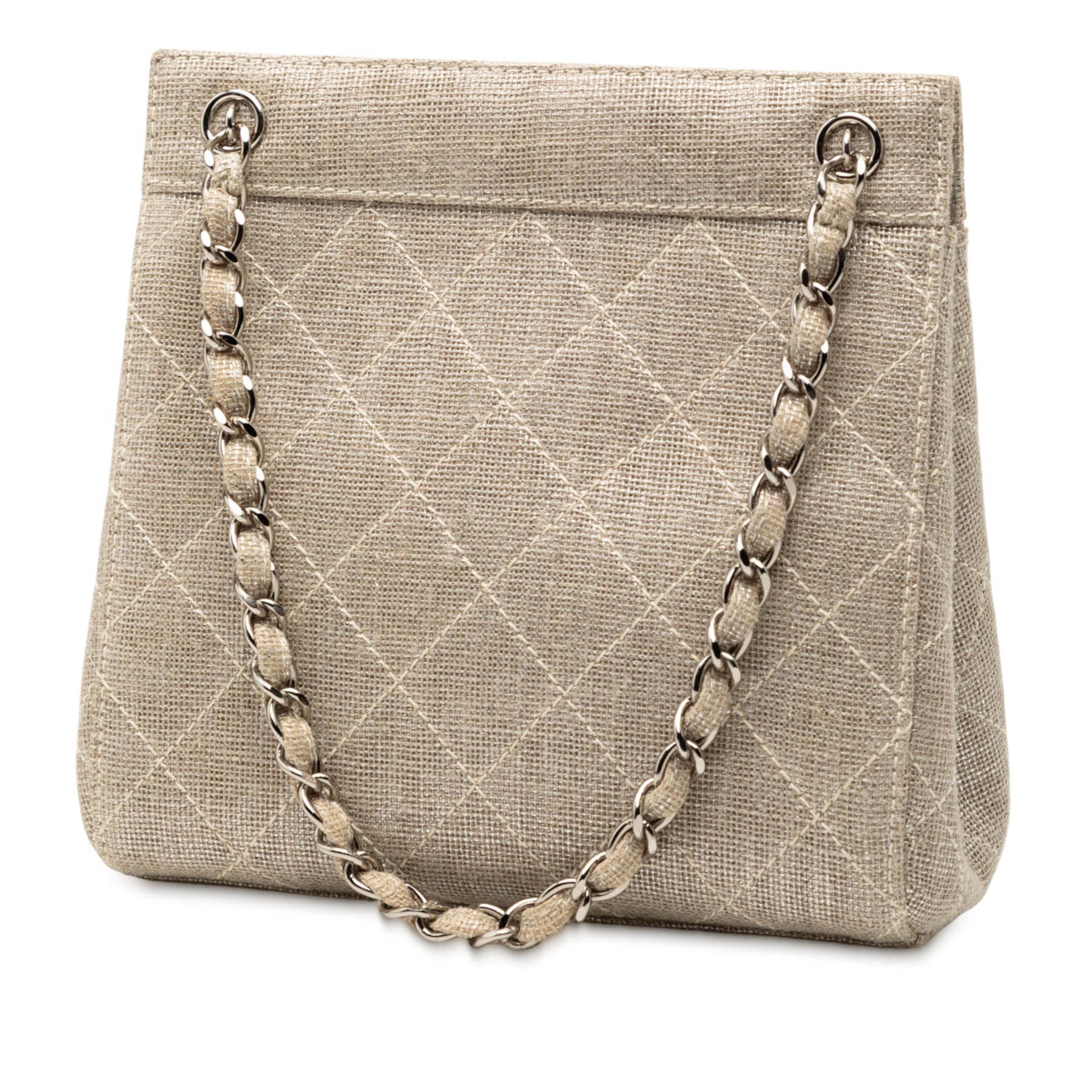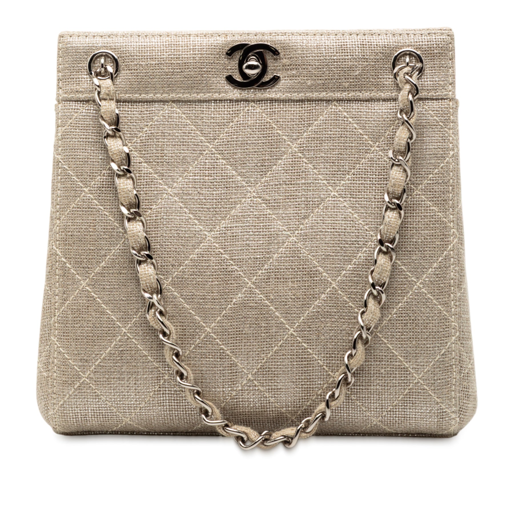 Ce sac cabas est confectionné en lin cousu, possède des anses en chaîne tressée de lin, une fermeture à tourniquet CC sur le dessus, ainsi que des poches intérieures zippées et plaquées. Il est en excellent état.