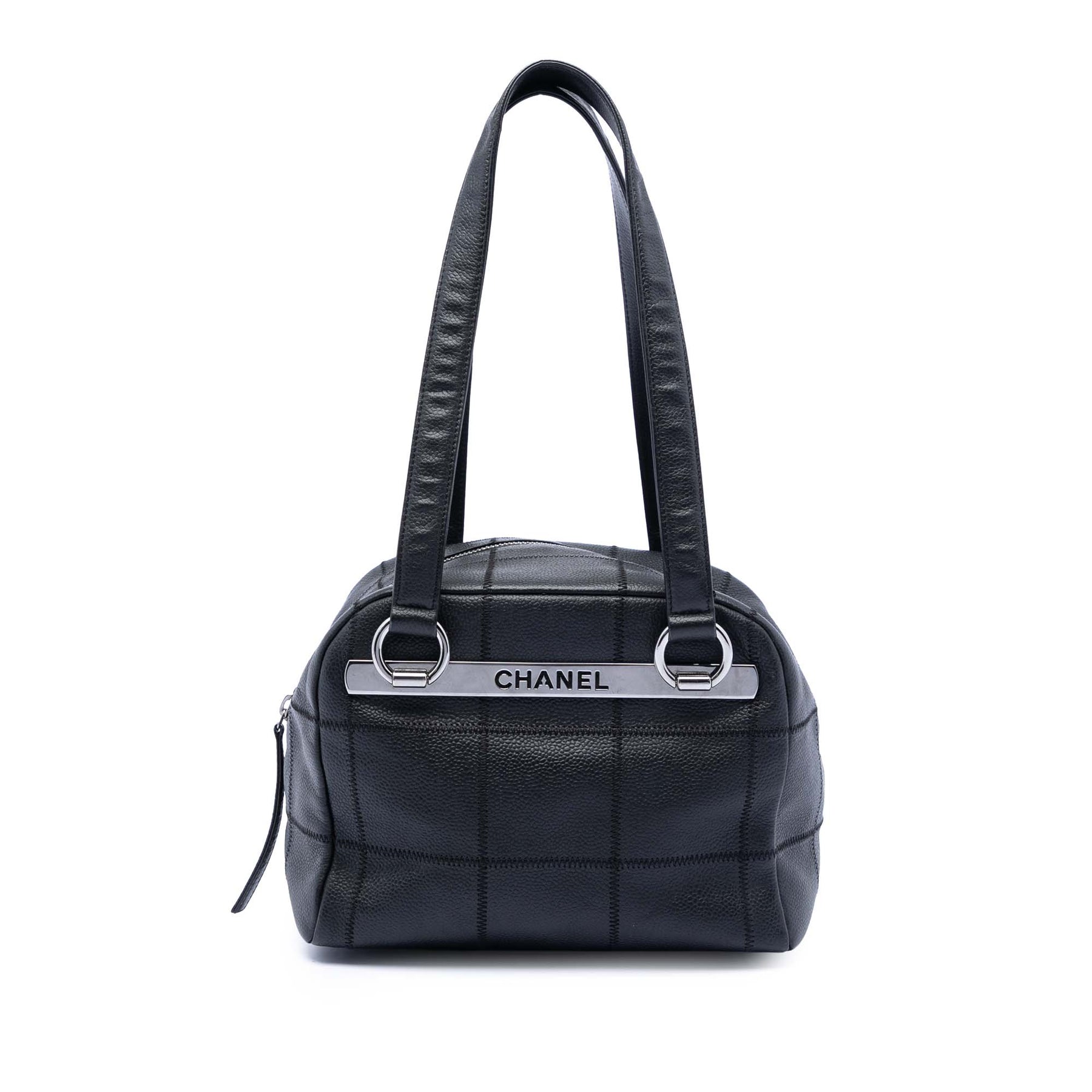 Ce sac bandoulière est confectionné en cuir caviar matelassé et possède des anses plates en cuir, une fermeture zippée sur le dessus, ainsi que des poches intérieures zippées et plaquées. Il est en excellent état.