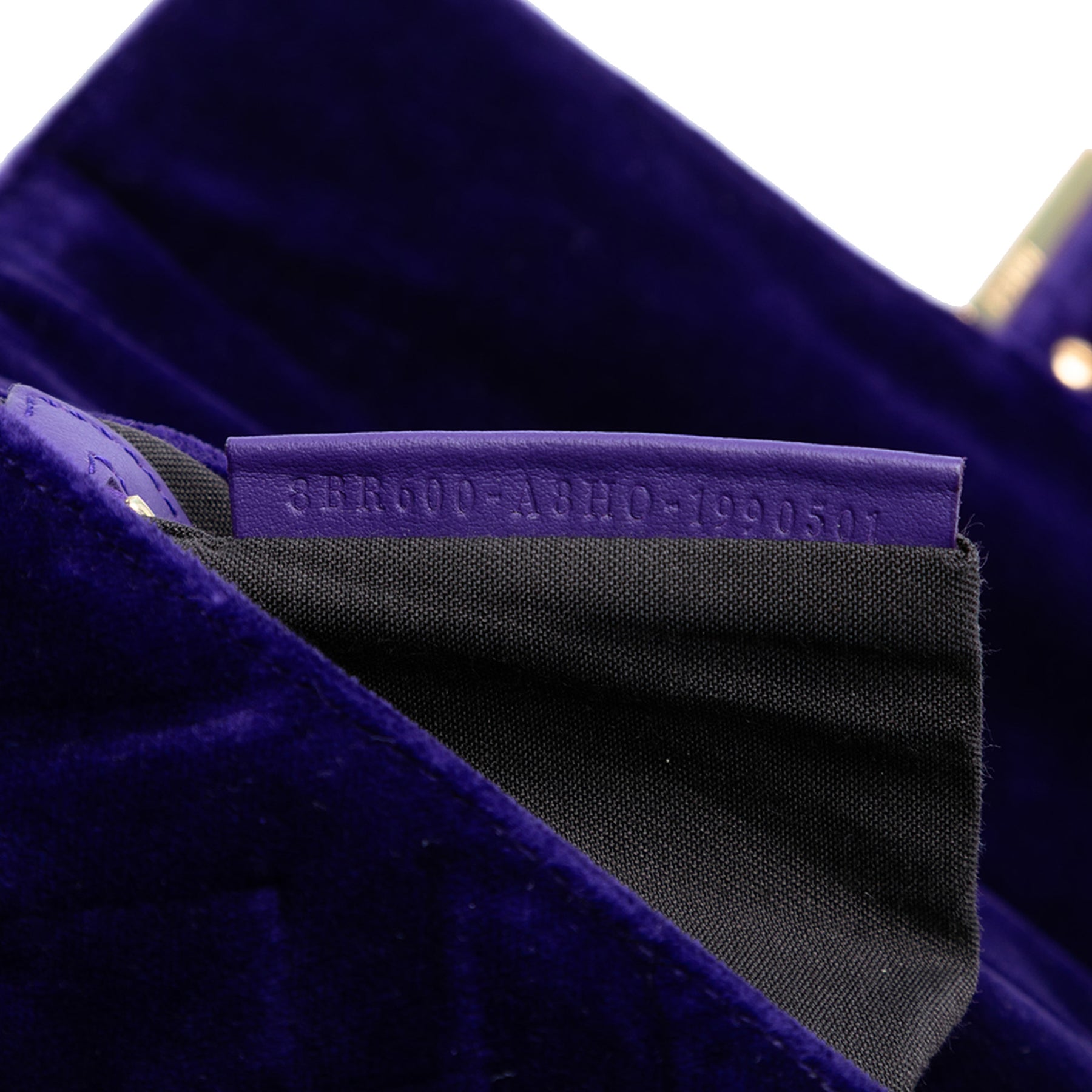 Le sac Baguette est en velours gaufré, possède une poignée amovible, une bandoulière amovible en velours et chaîne, un rabat avant à fermeture magnétique et une poche intérieure zippée. Il est en bon état.