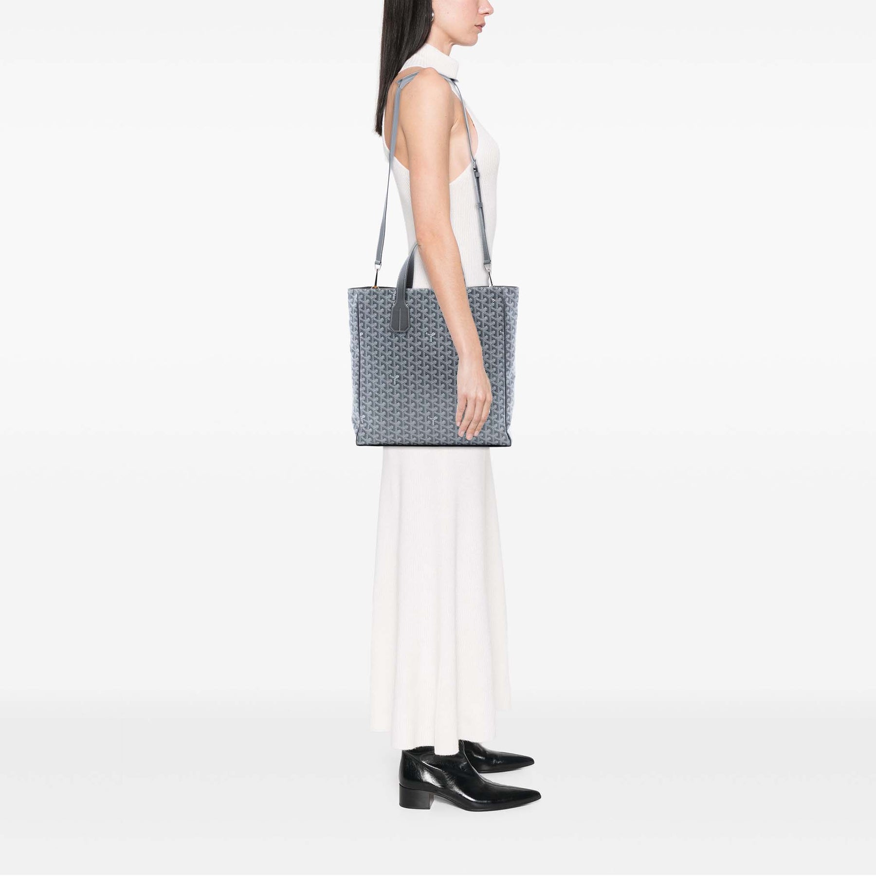 Le sac Voltaire est doté d'un corps en toile enduite, de poignées plates en cuir, d'une bandoulière amovible et d'une ouverture sur le dessus. Il est en bon état.