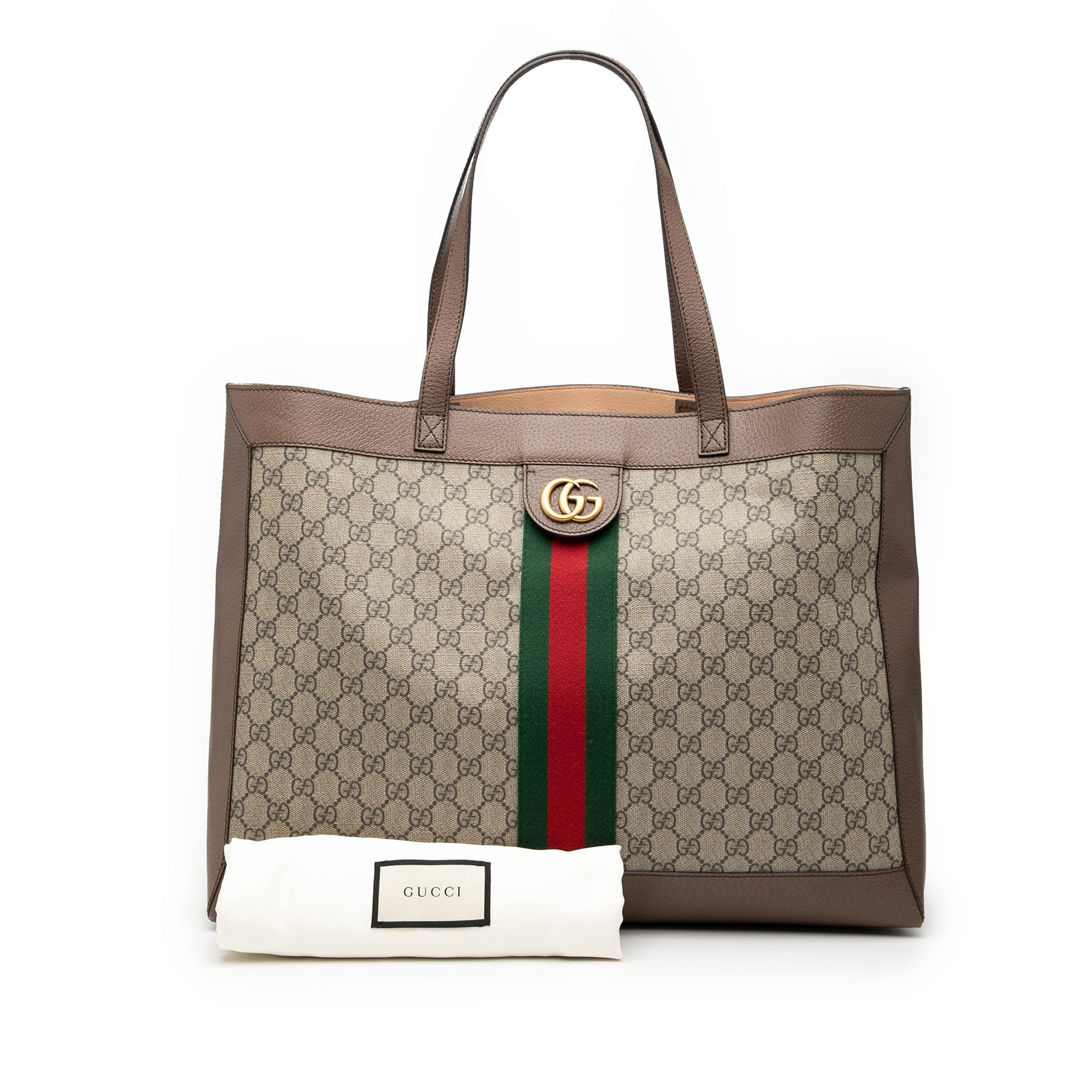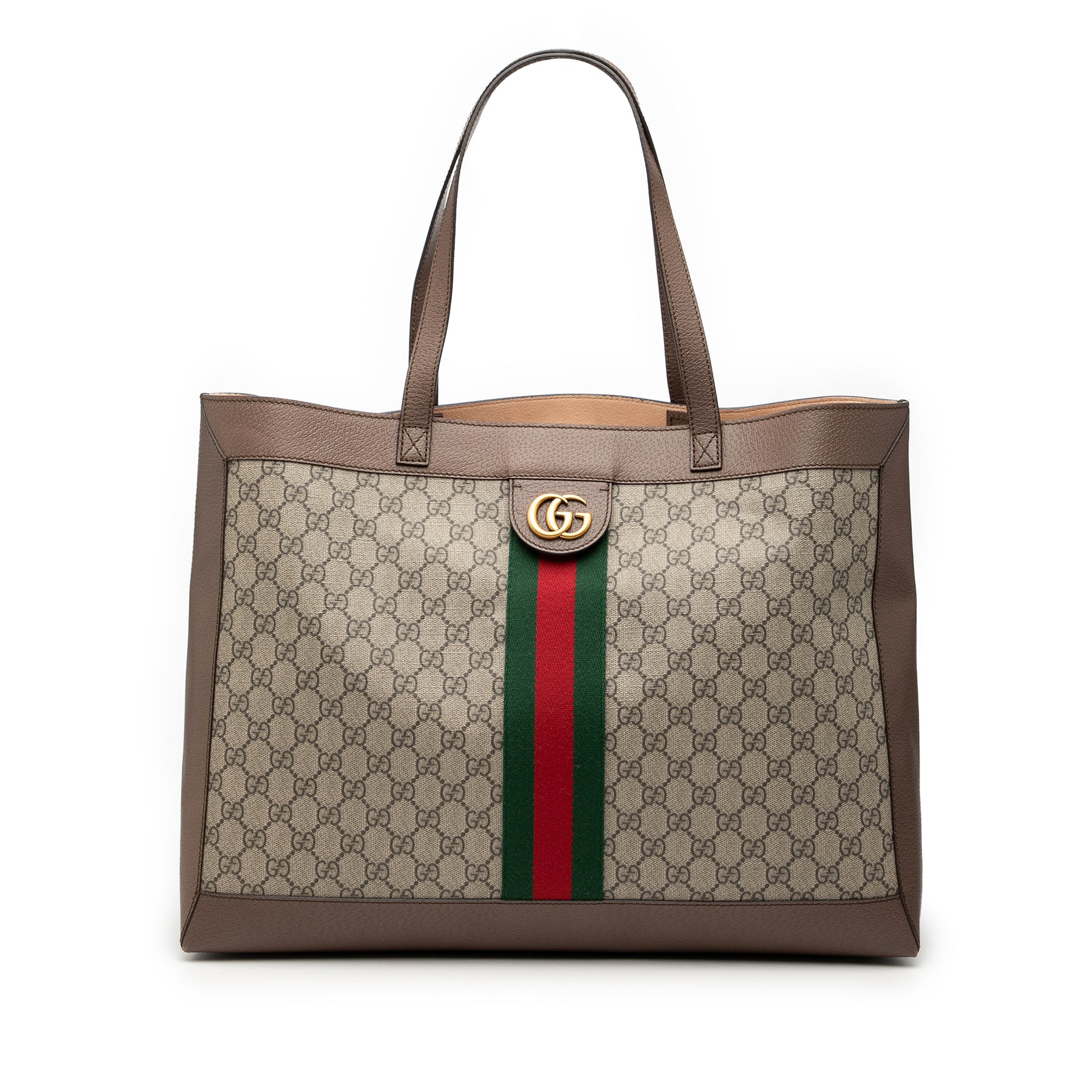 Le sac cabas Ophidia est confectionné en toile enduite avec des finitions en cuir, des anses plates en cuir et une ouverture sur le dessus. Il est en excellent état.