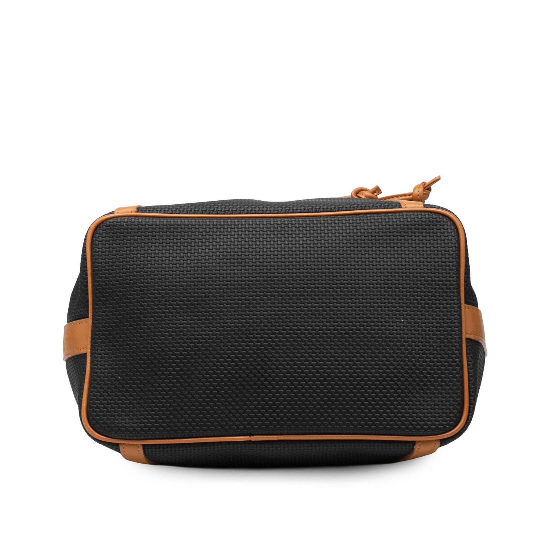 Ce sac seau est en toile enduite avec des finitions en cuir, une bandoulière plate en cuir, une fermeture à cordon et une poche intérieure plaquée. Il est en bon état.