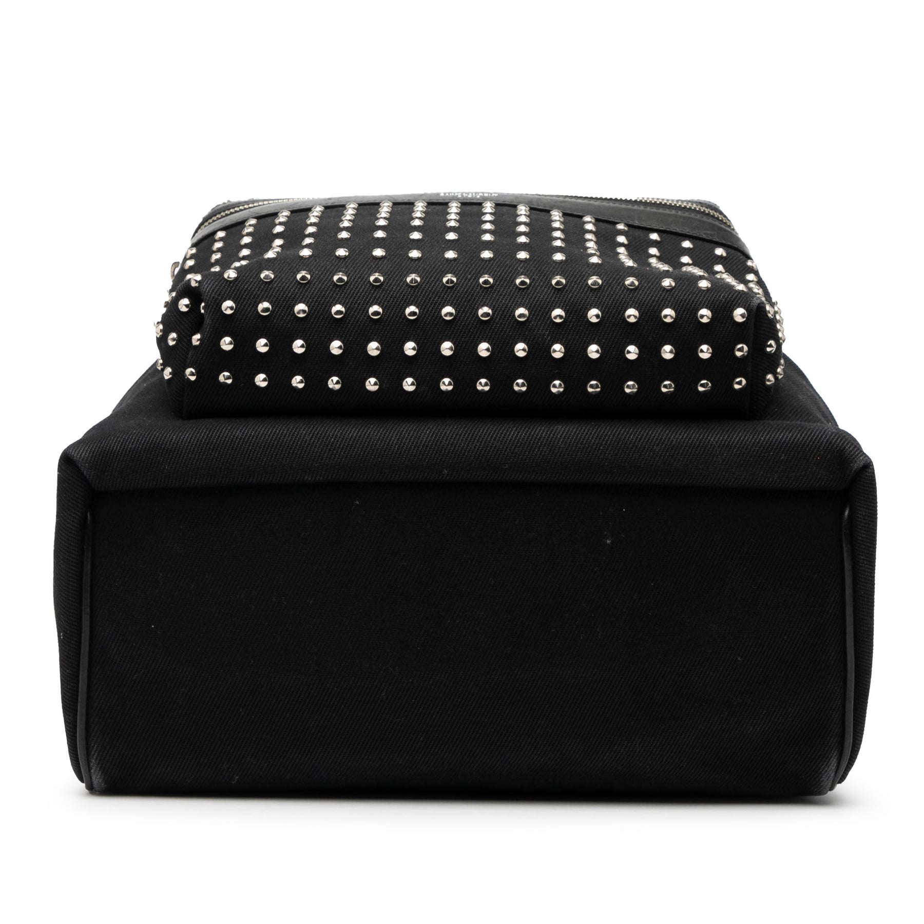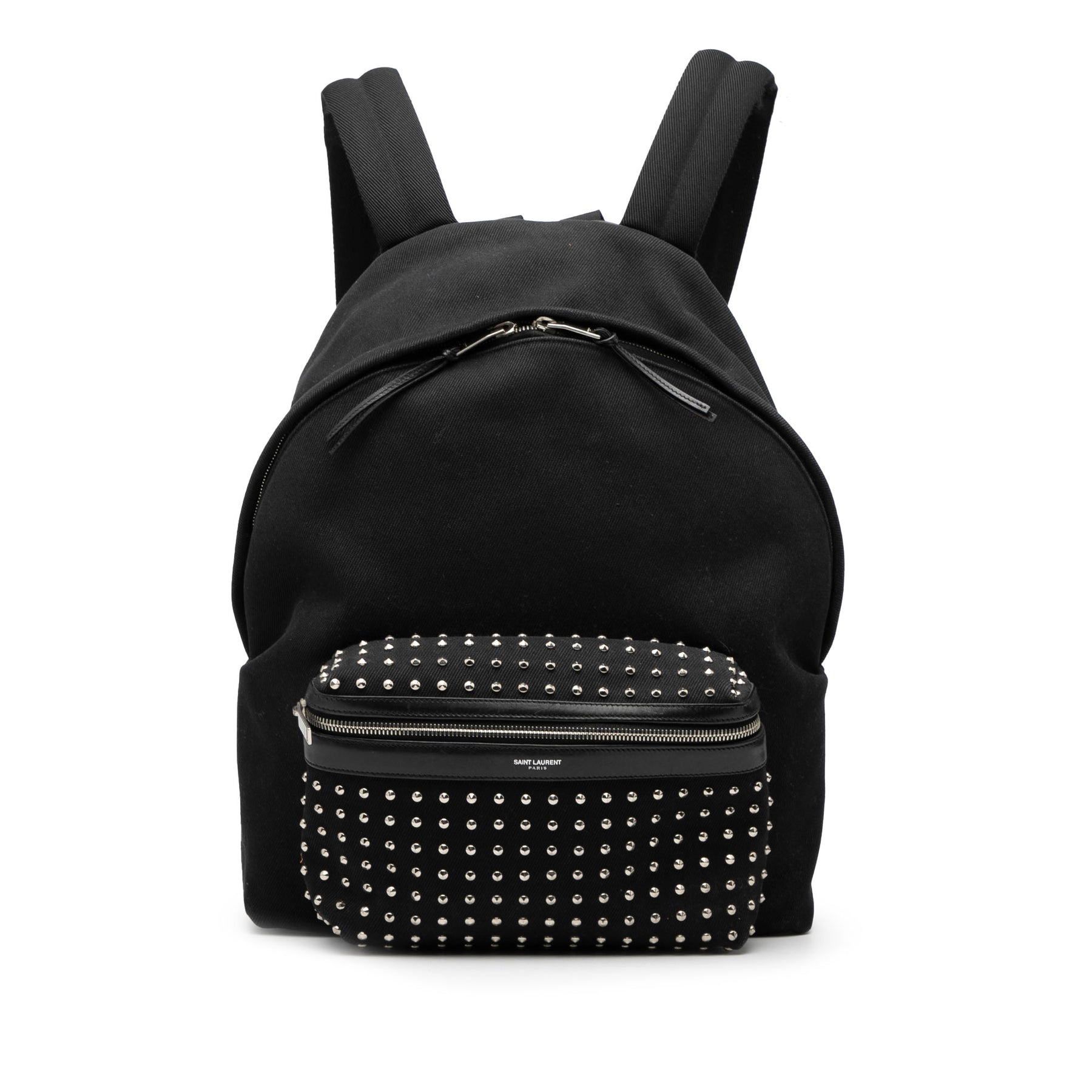 Le sac à dos City est confectionné en toile cloutée avec des finitions en cuir. Il est doté d'une poignée supérieure plate, de bretelles plates, d'une fermeture éclair sur le dessus, d'une poche extérieure zippée à l'avant et de poches intérieures zippées et plaquées. Il est en bon état.