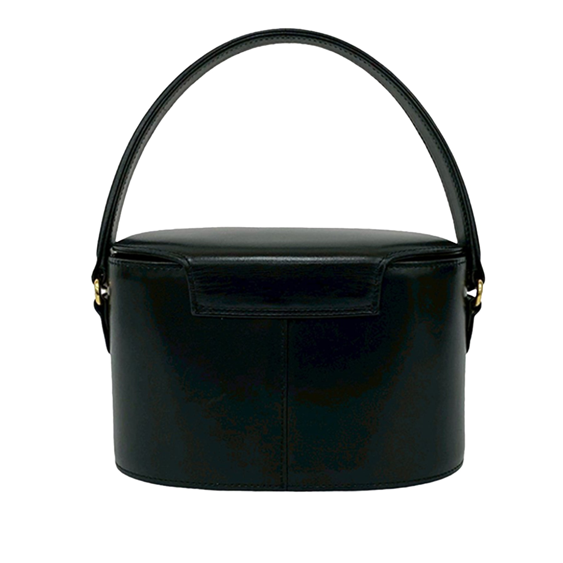 Ce sac vanity est en cuir, avec une anse plate en cuir, un rabat supérieur à fermeture magnétique et une poche intérieure zippée. Il est en excellent état.