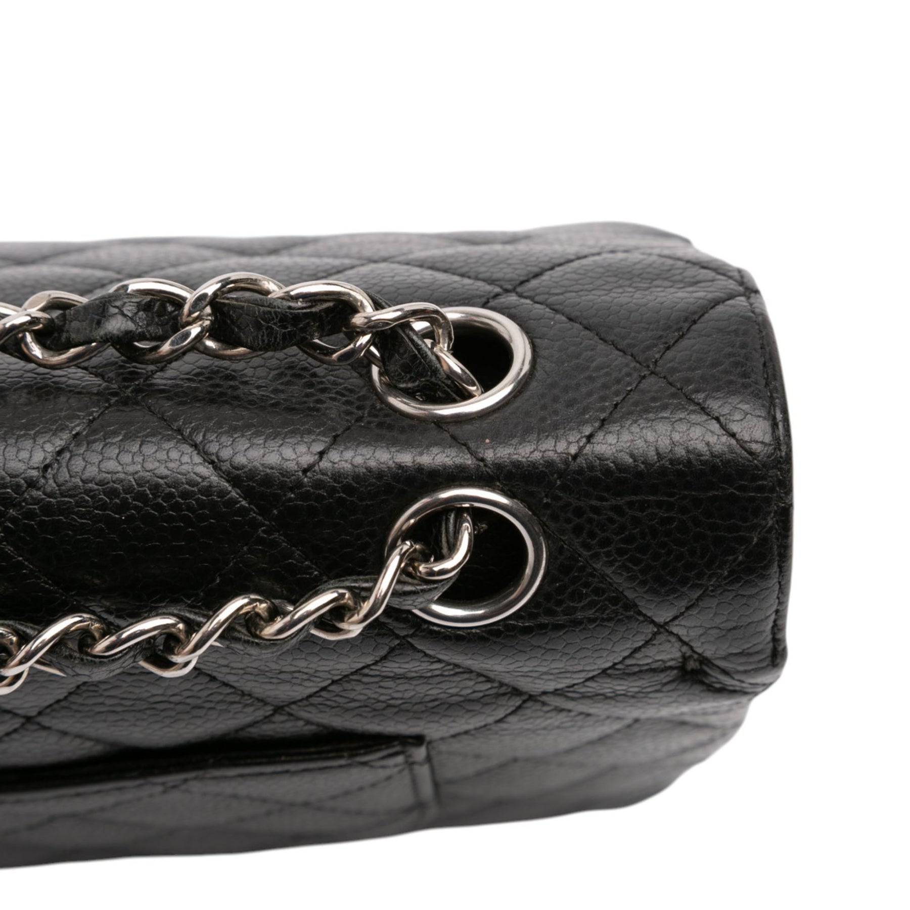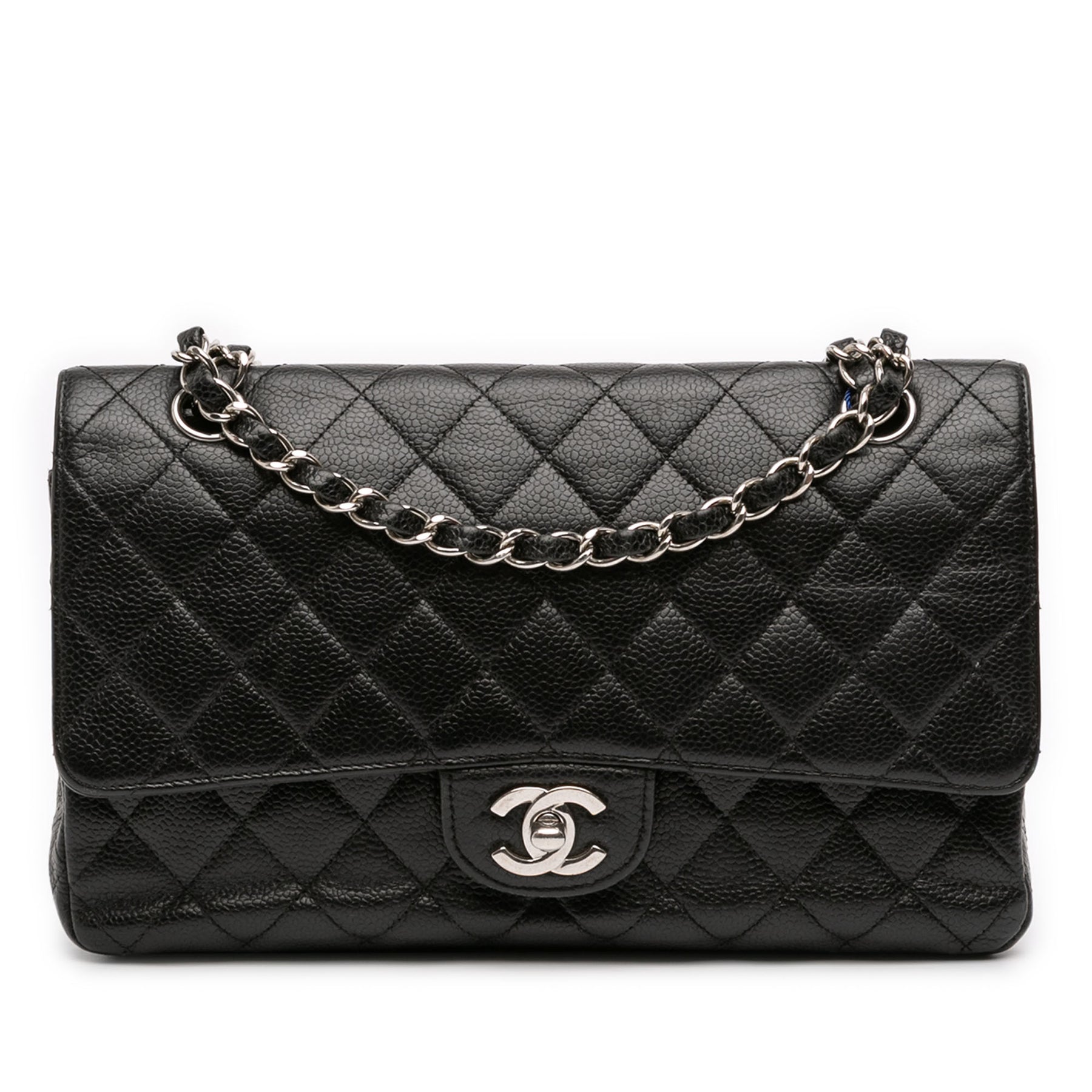 Ce sac bandoulière est confectionné en cuir caviar matelassé et possède des bandoulières en chaîne tressée de cuir, un double rabat avant orné du double C entrelacé et d'une fermeture à tourniquet, une poche plaquée extérieure au dos, ainsi que des poches intérieures zippées et plaquées. Il est en bon état.