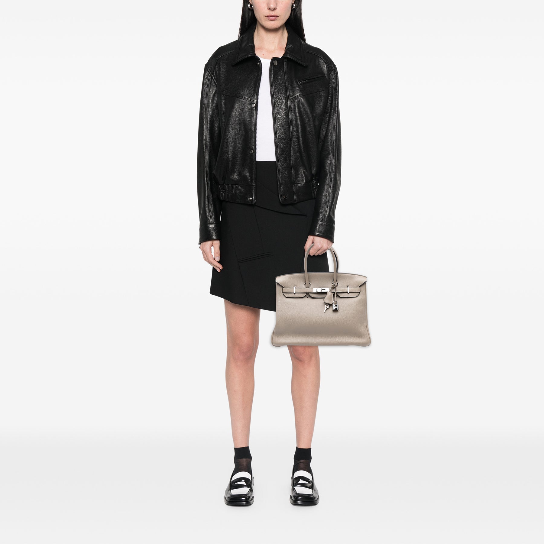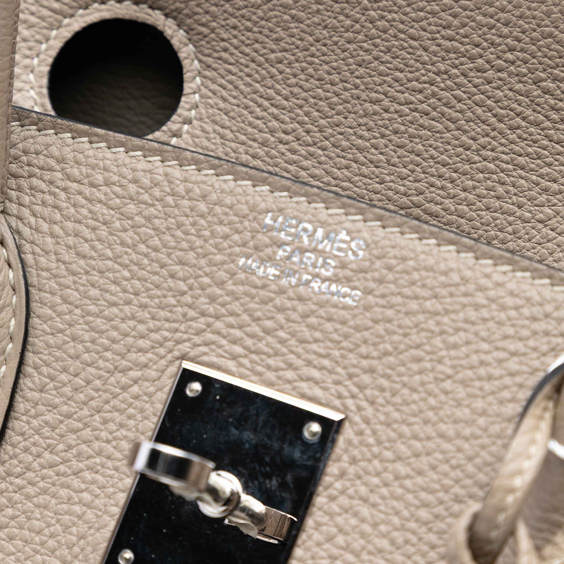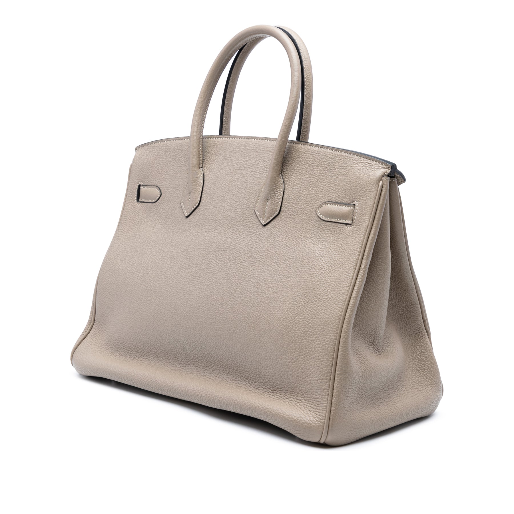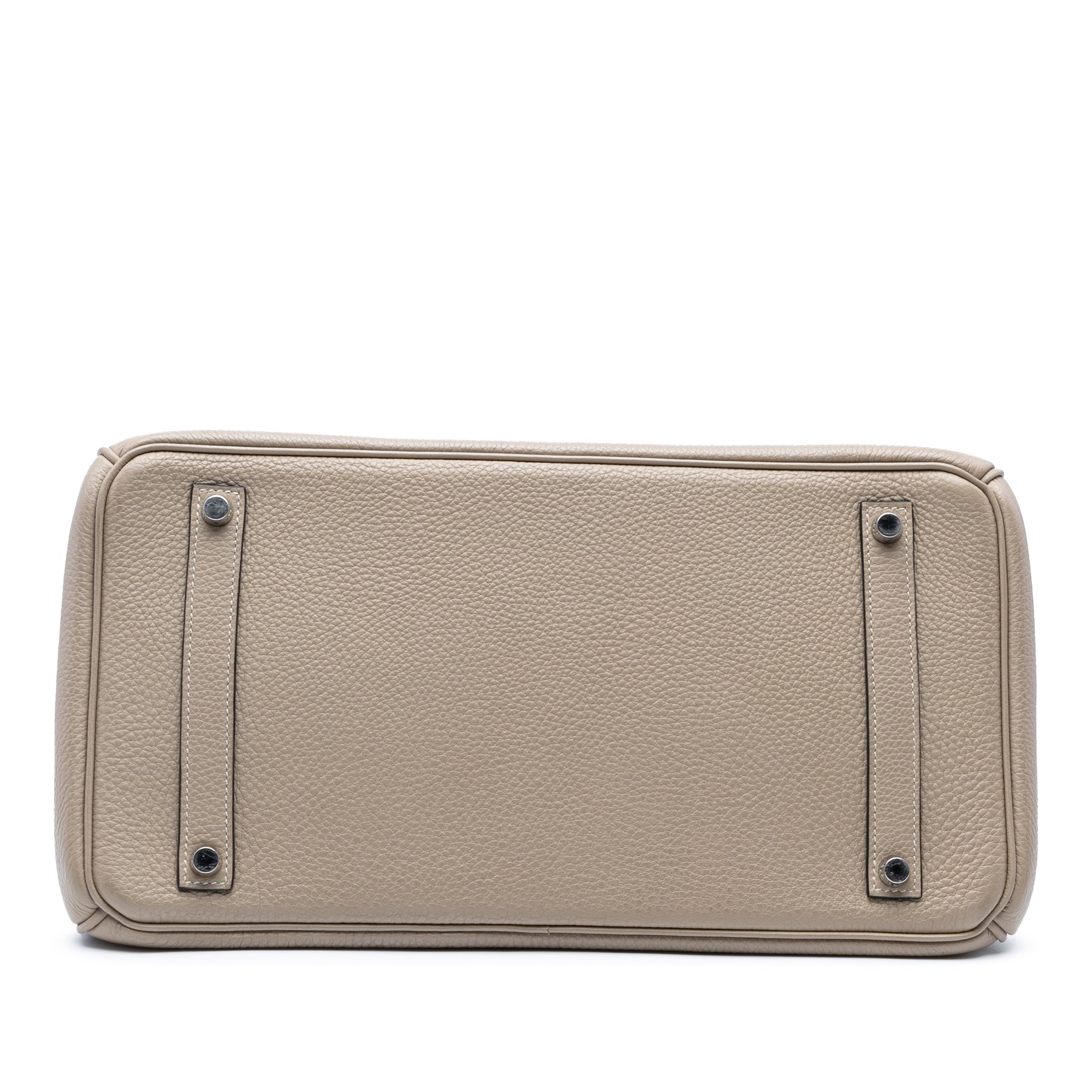 Ce Birkin 35 est doté d'un corps en cuir Togo couleur Gris Asphalte, de poignées en cuir roulé, d'un rabat avant avec fermoir à tourniquet et de poches intérieures plaquées et zippées. Il est en excellent état.