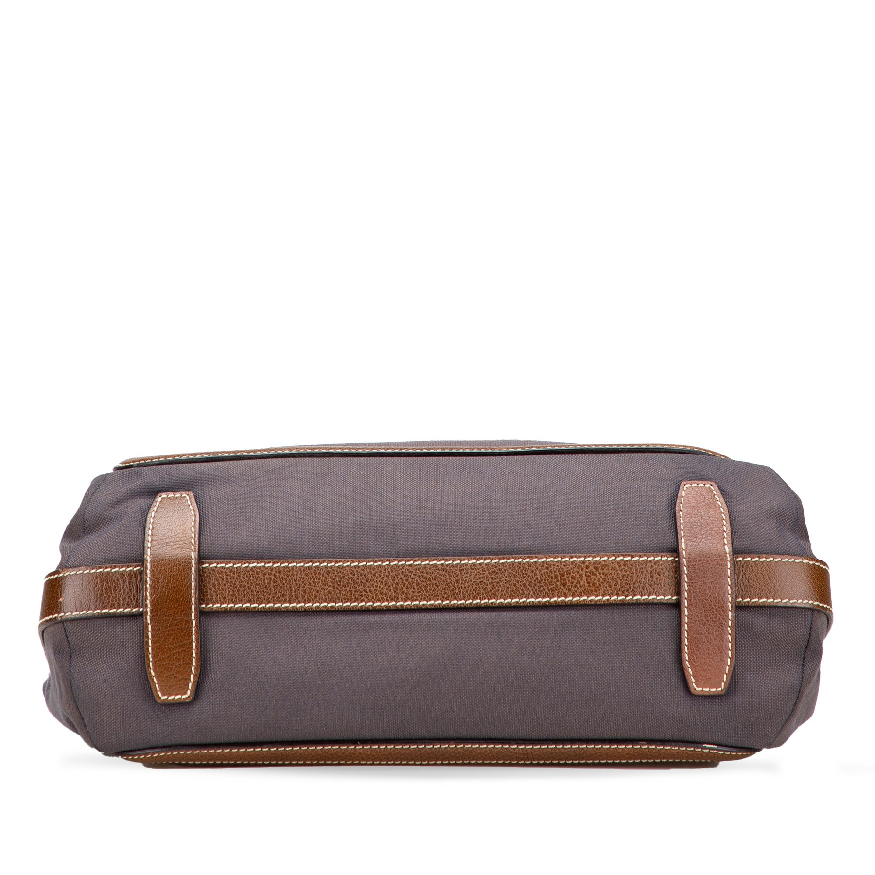 Ce sac cabas est en toile avec des finitions en cuir, des anses plates en cuir, une ouverture sur le dessus avec fermeture à fermoir et des poches intérieures zippées et plaquées. Il est en bon état.