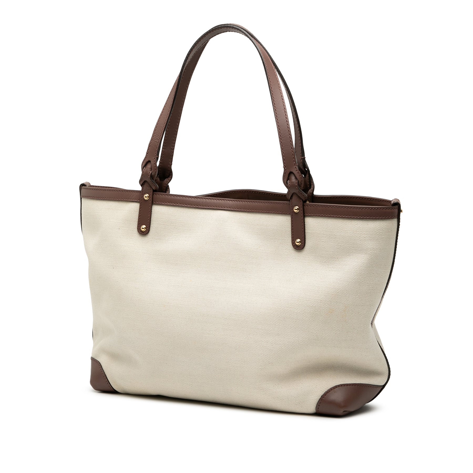 Le sac cabas Craft est en toile avec finitions en cuir, anses plates en cuir, ouverture sur le dessus avec fermeture à mousqueton, poches intérieures zippées et plaquées, et comprend une pochette. Il est en bon état.