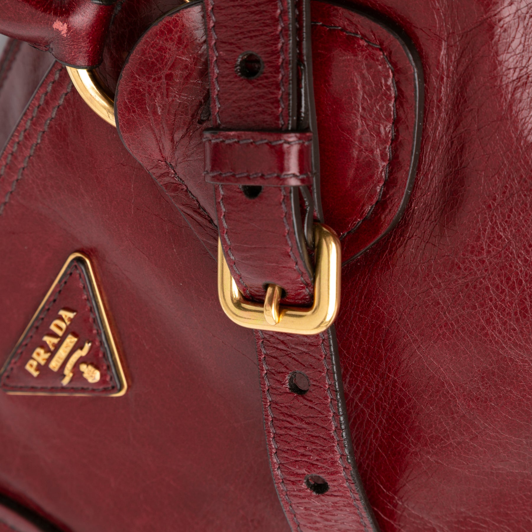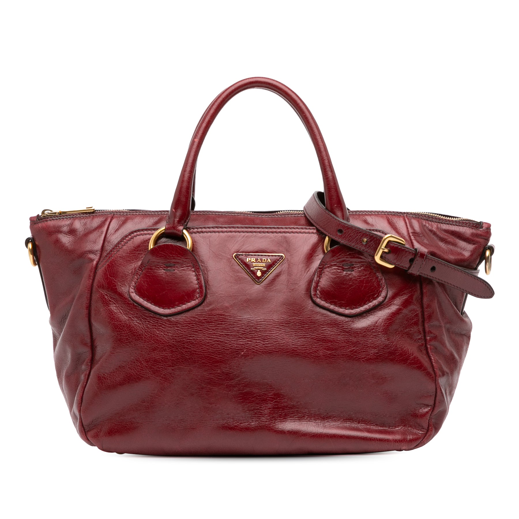 Ce sac à main est en cuir, avec des anses roulées en cuir, une bandoulière plate amovible en cuir, une fermeture zippée sur le dessus, des poches extérieures plaquées à l'avant et à l'arrière, ainsi que des poches intérieures zippées et plaquées. Il est en bon état.