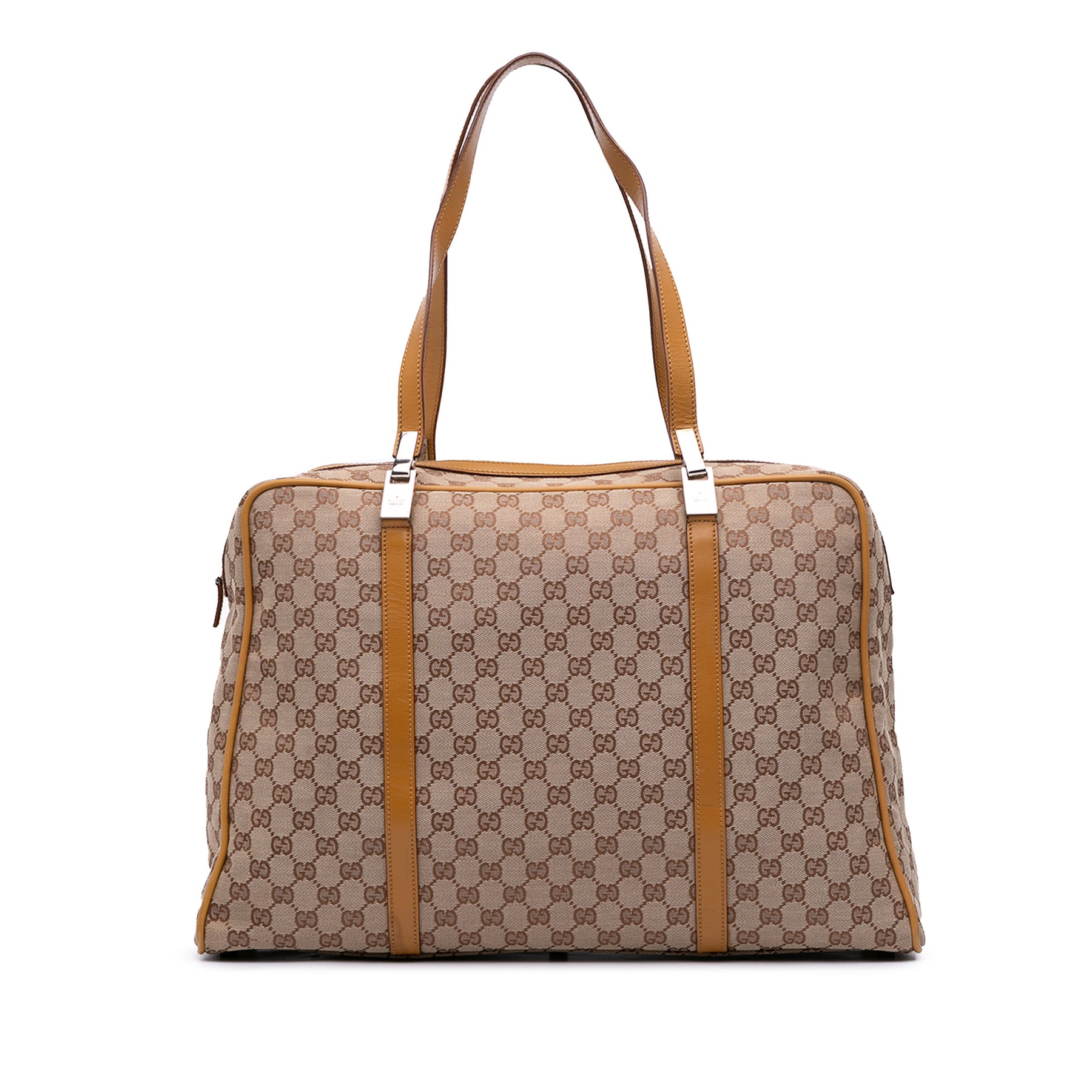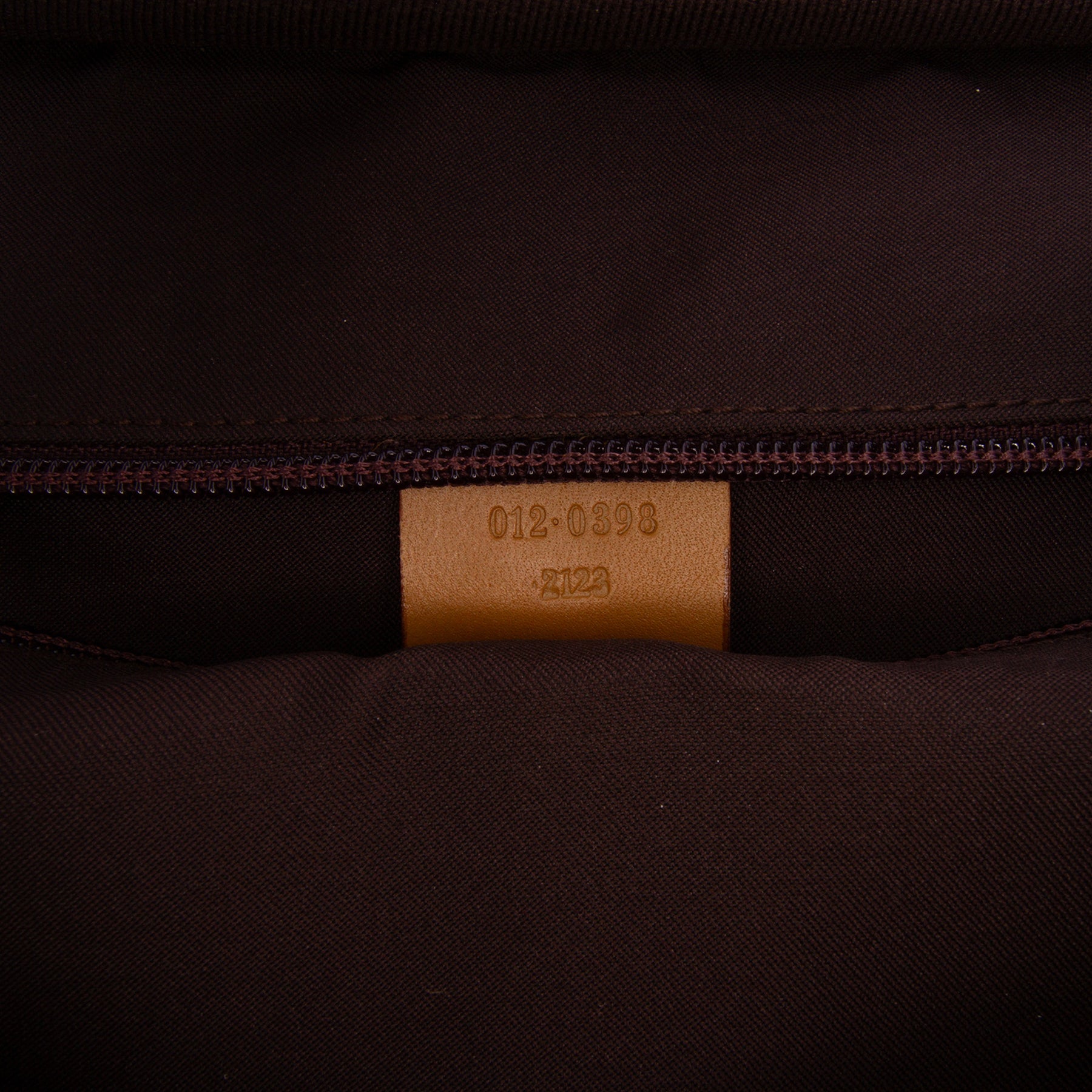 Ce sac de voyage est en toile avec des finitions en cuir, des anses plates en cuir, une fermeture éclair sur le dessus et une poche intérieure zippée. Les anses ont été repeintes. Il est en bon état.