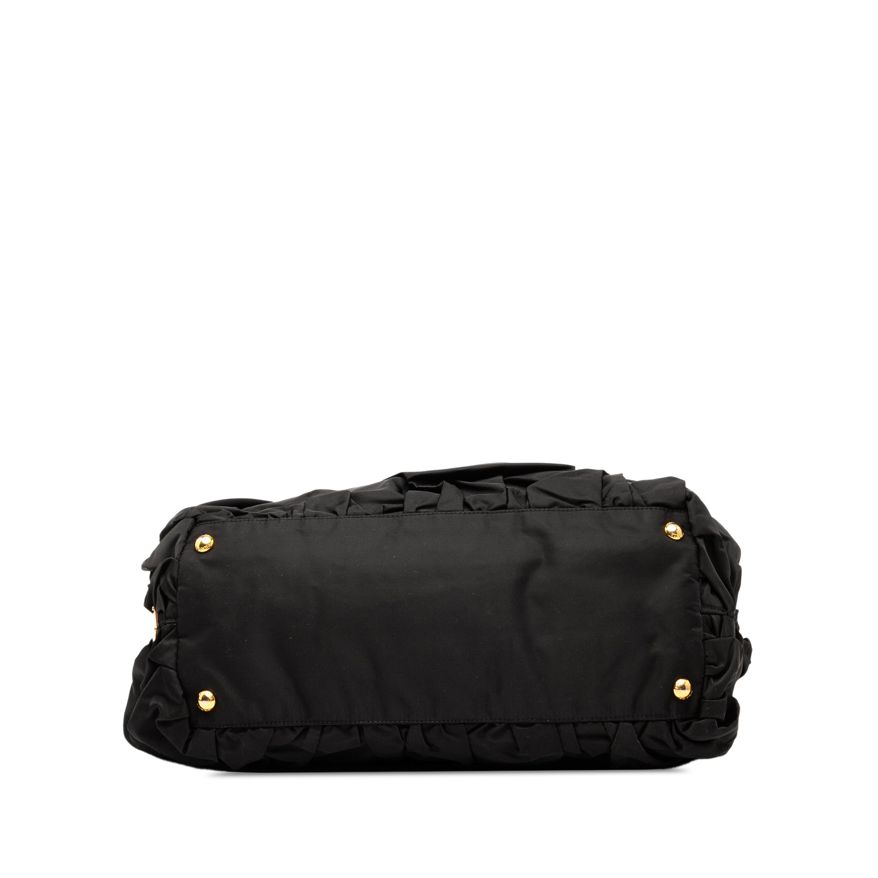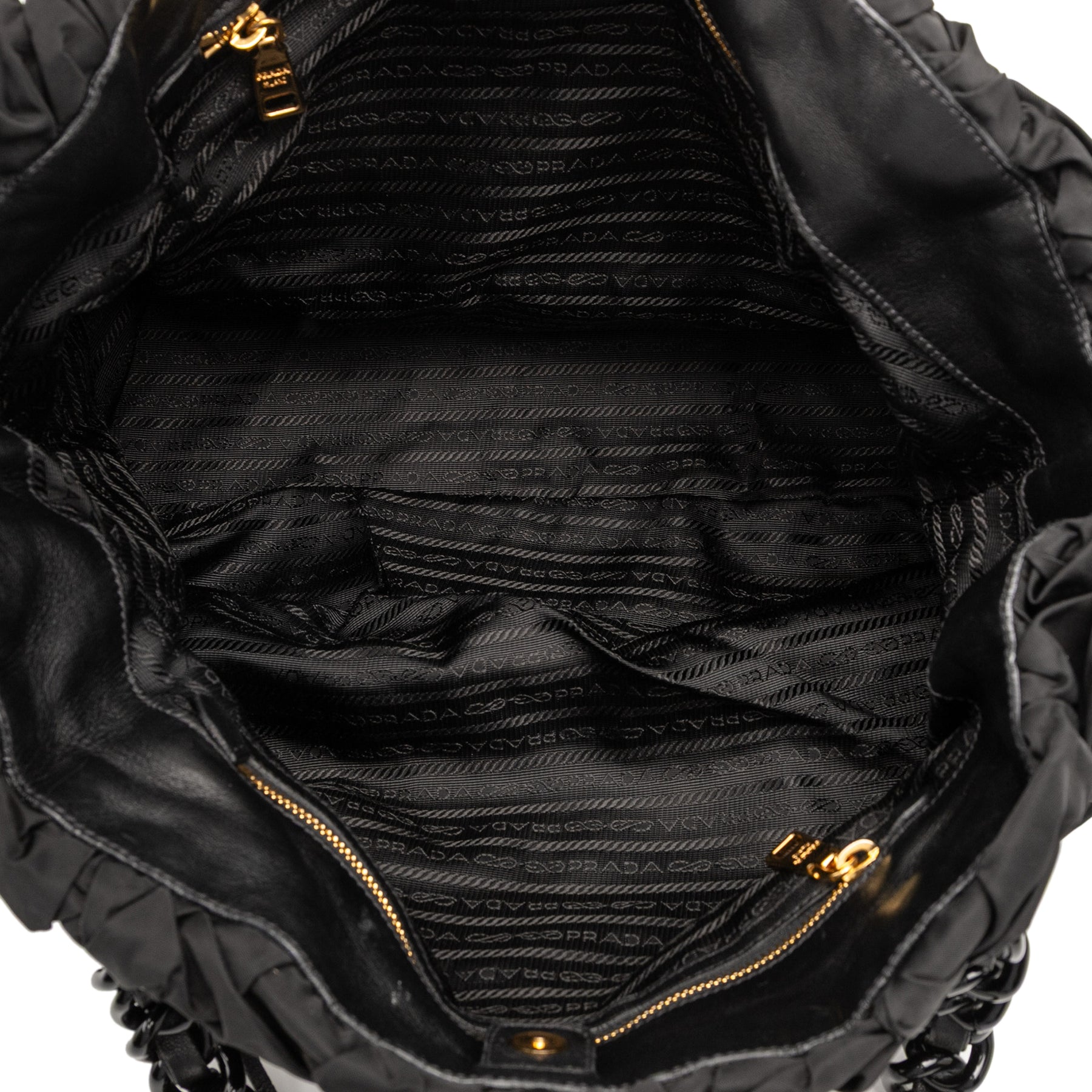 Ce sac cabas est en nylon plissé, possède des bandoulières en cuir et chaîne, une ouverture sur le dessus avec fermeture magnétique et des poches intérieures zippées. Il est en bon état.
