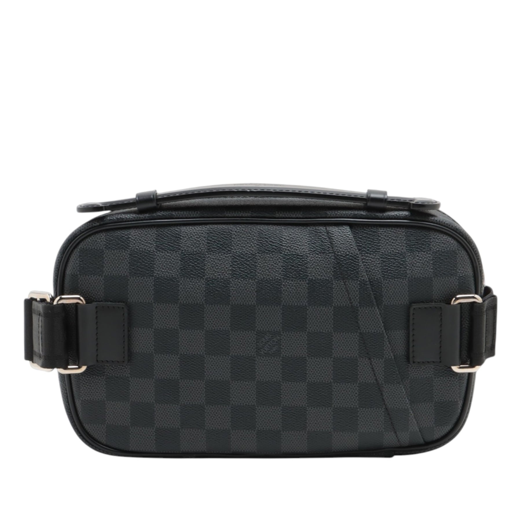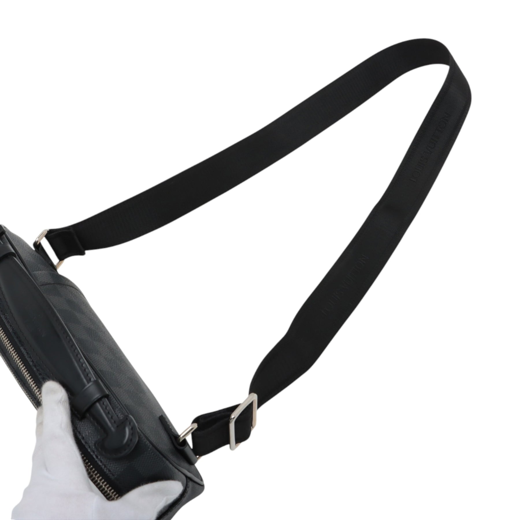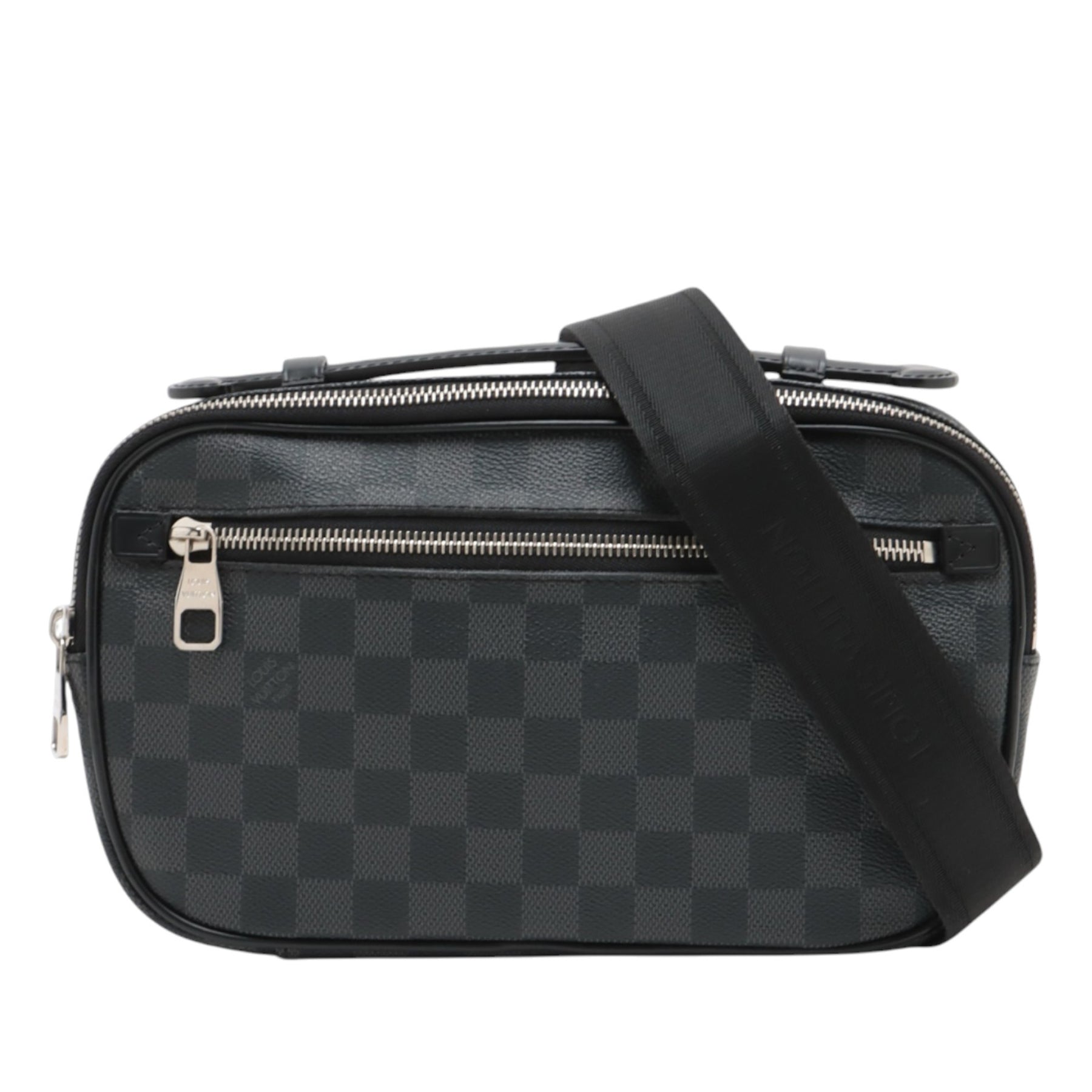 Le sac Ambler est confectionné en toile Damier Graphite avec des finitions en cuir, une poignée supérieure plate en cuir, une ceinture ventrale plate réglable en cuir, une fermeture zippée sur le dessus, une poche zippée extérieure à l'avant, des poches plaquées à l'arrière et une poche plaquée intérieure. Il est en excellent état.