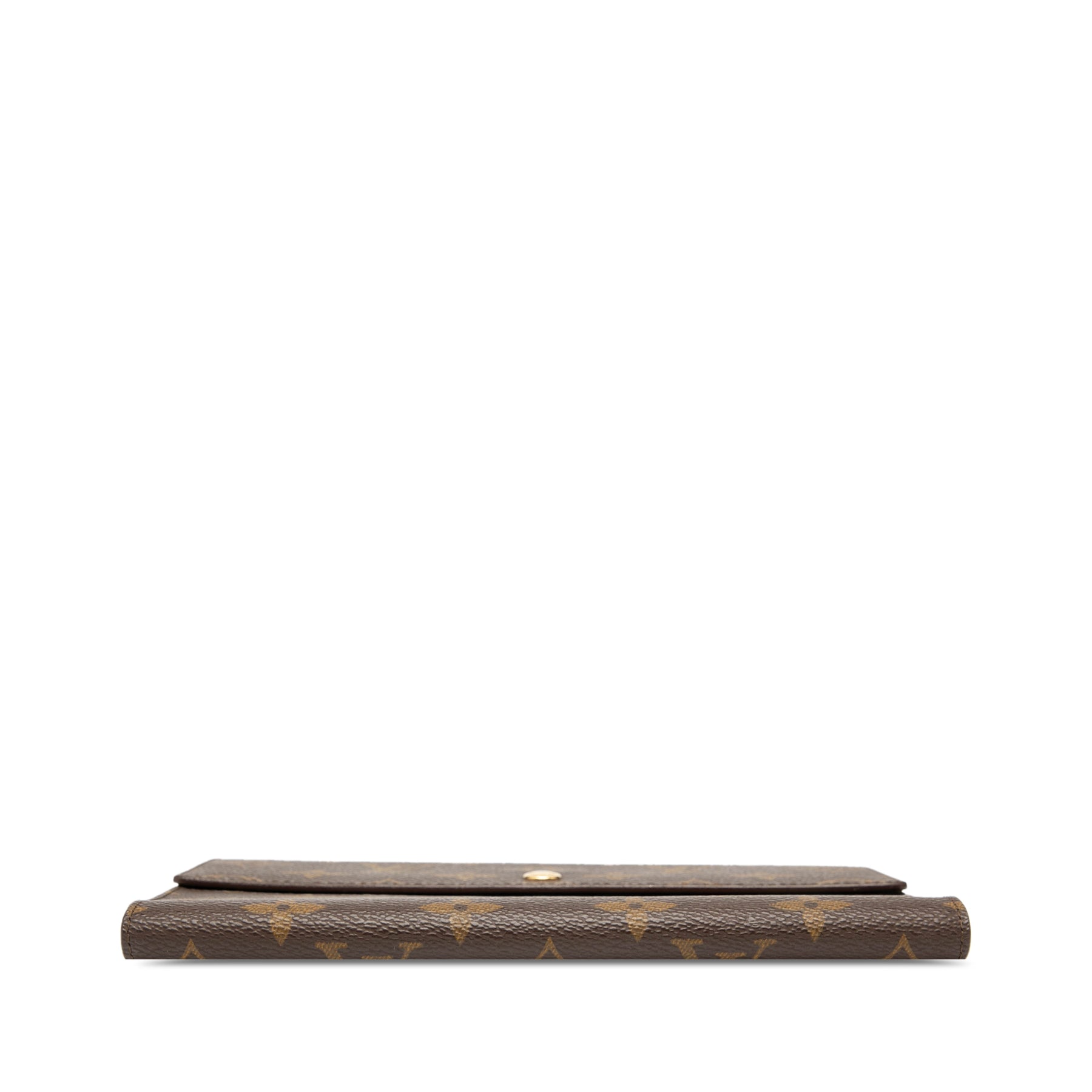 Ce portefeuille est en toile monogrammée, possède un rabat à fermeture pression et des compartiments intérieurs zippés et plaqués. Il est en excellent état.