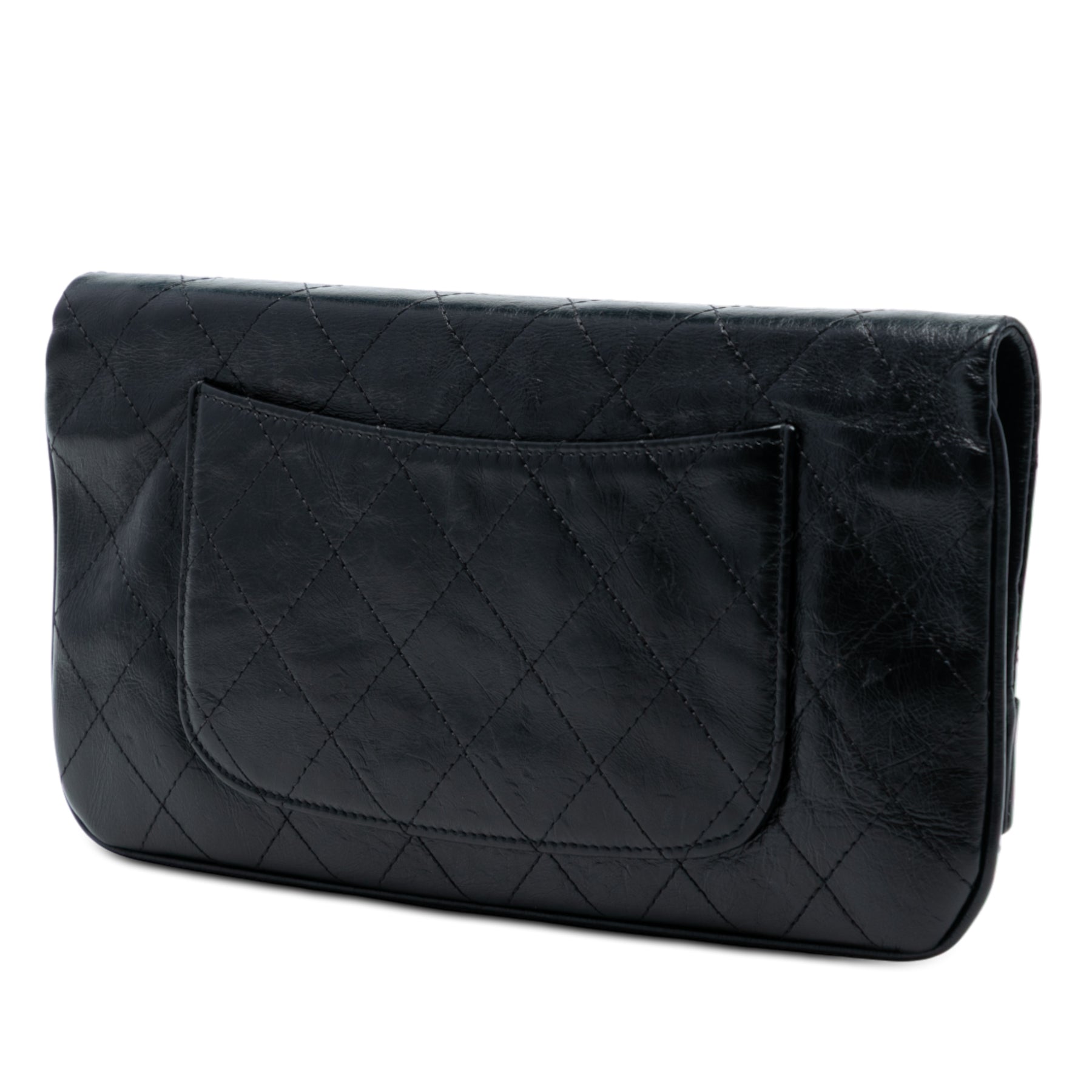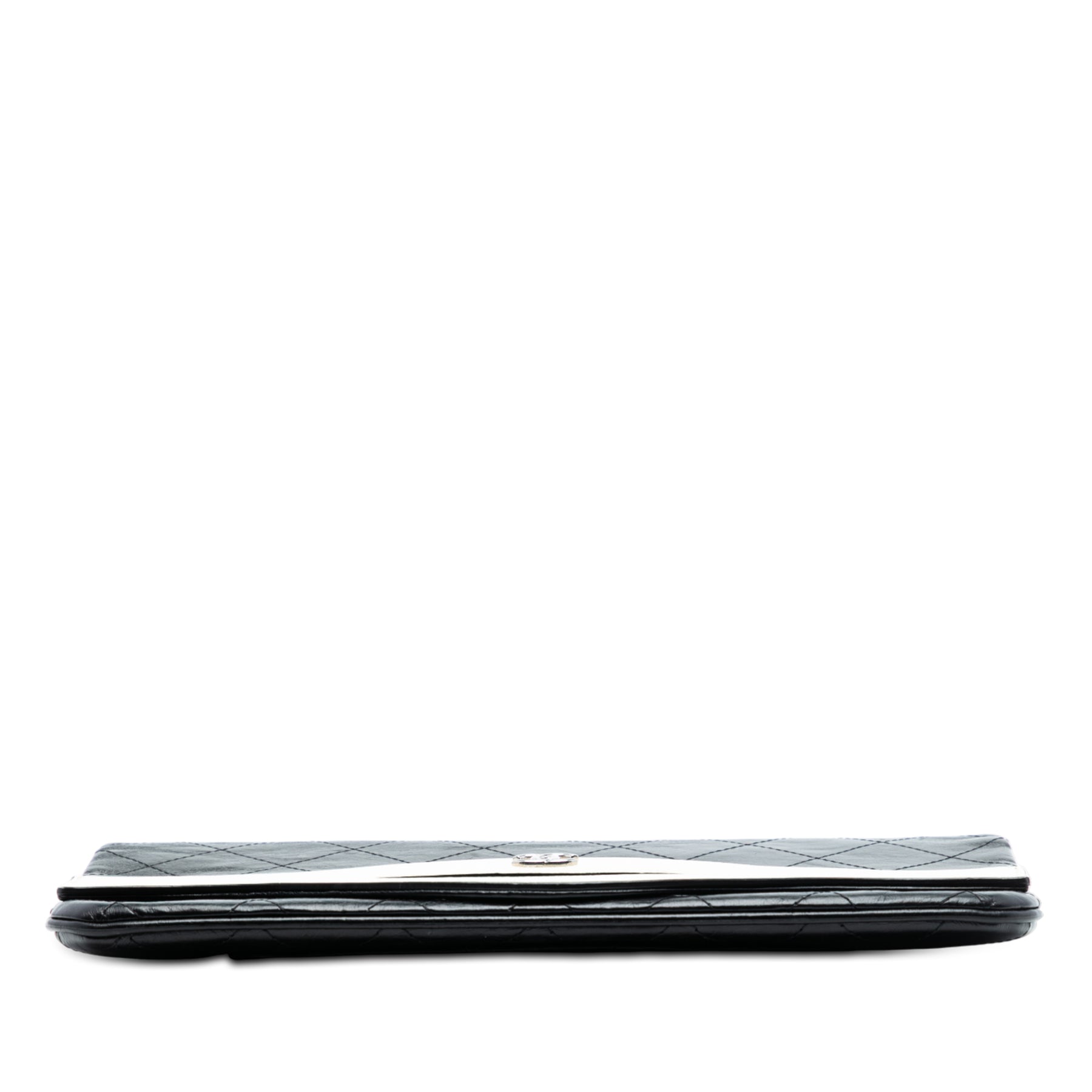 Cette pochette en cuir matelassé est dotée d'un rabat avant, d'une fermeture éclair sous le rabat, d'une poche plaquée extérieure au dos et de poches intérieures zippées et plaquées. Elle est en excellent état.