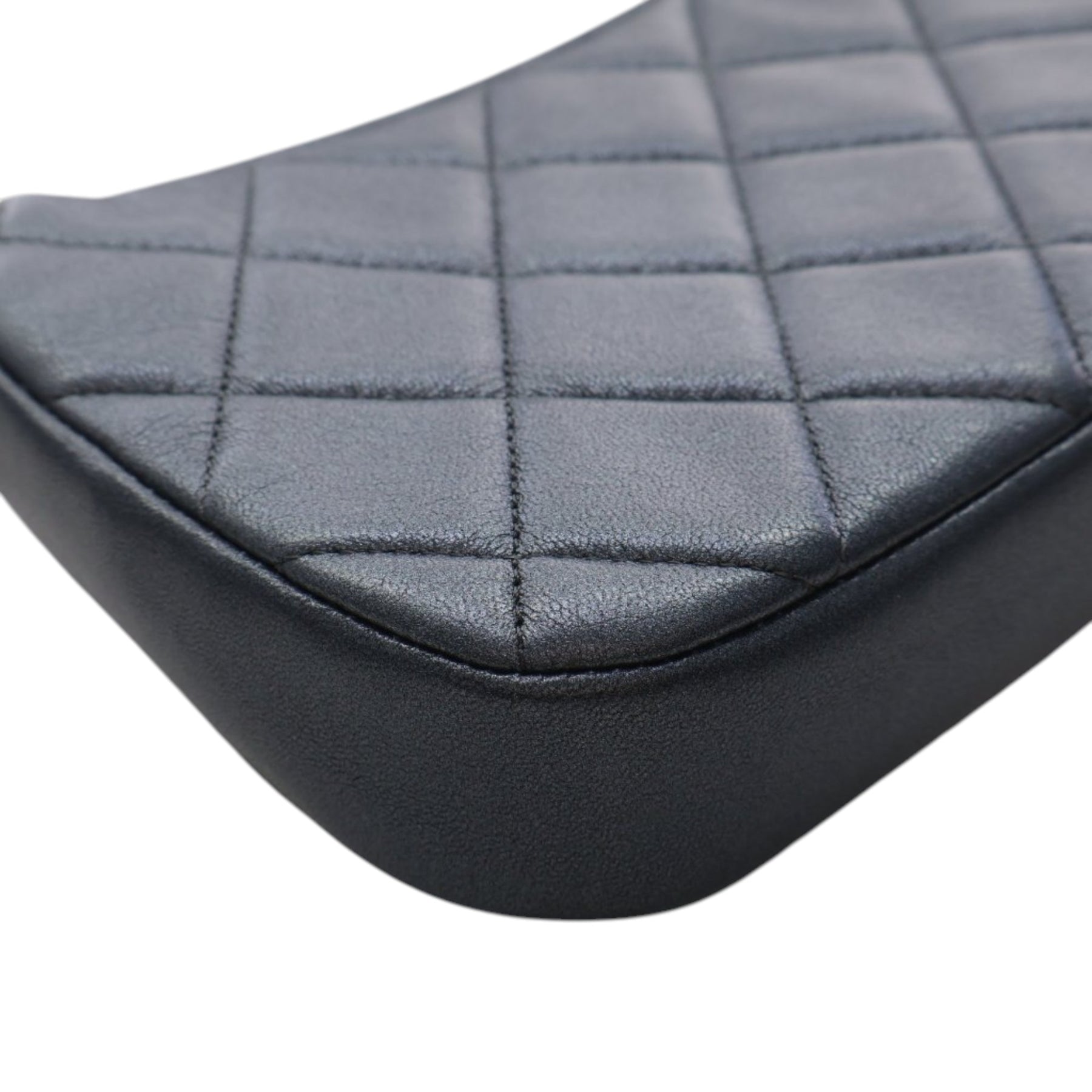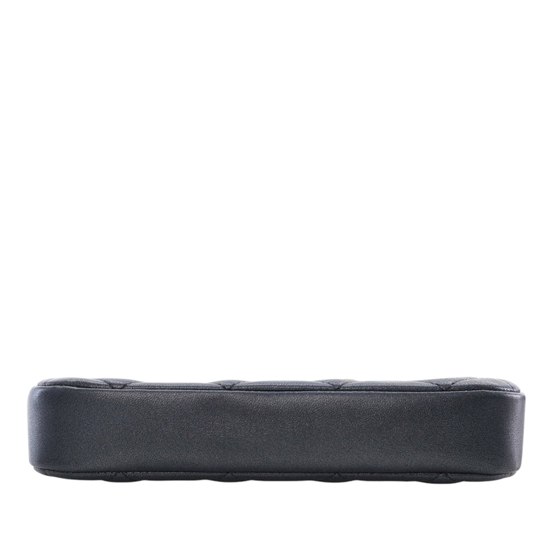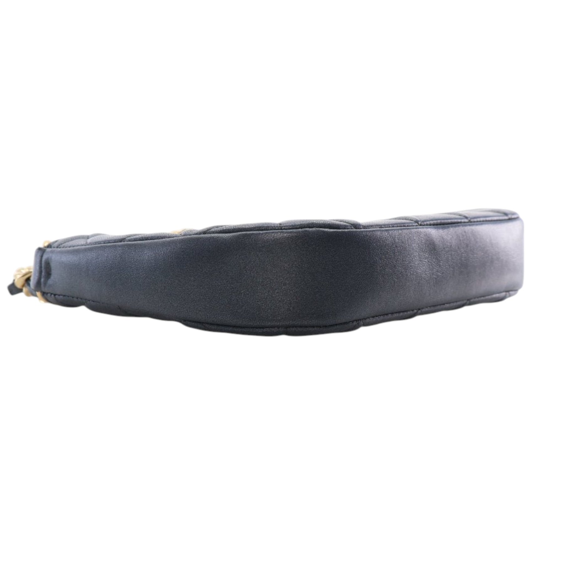 Ce sac bandoulière est confectionné en cuir d'agneau matelassé et possède une bandoulière en chaîne tressée de cuir, une fermeture zippée sur le dessus ainsi que des poches intérieures zippées et plaquées. Il est en excellent état.