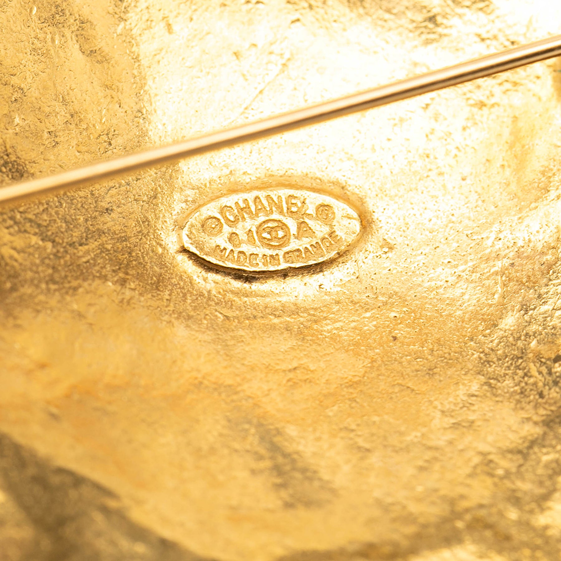 Cette broche est en métal plaqué or et se ferme par une épingle. Elle est en excellent état.