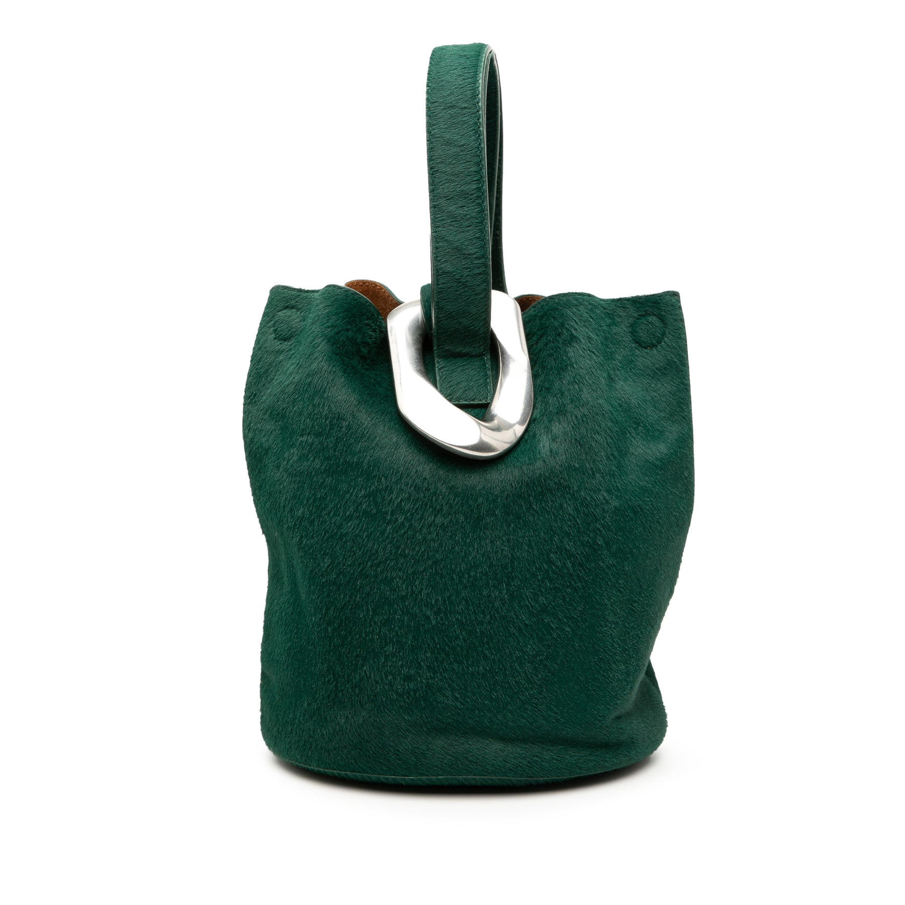 Le sac seau Drop est confectionné en poil de poney et possède une bandoulière plate, une ouverture sur le dessus avec fermeture magnétique et une poche intérieure plaquée. Il est en excellent état.