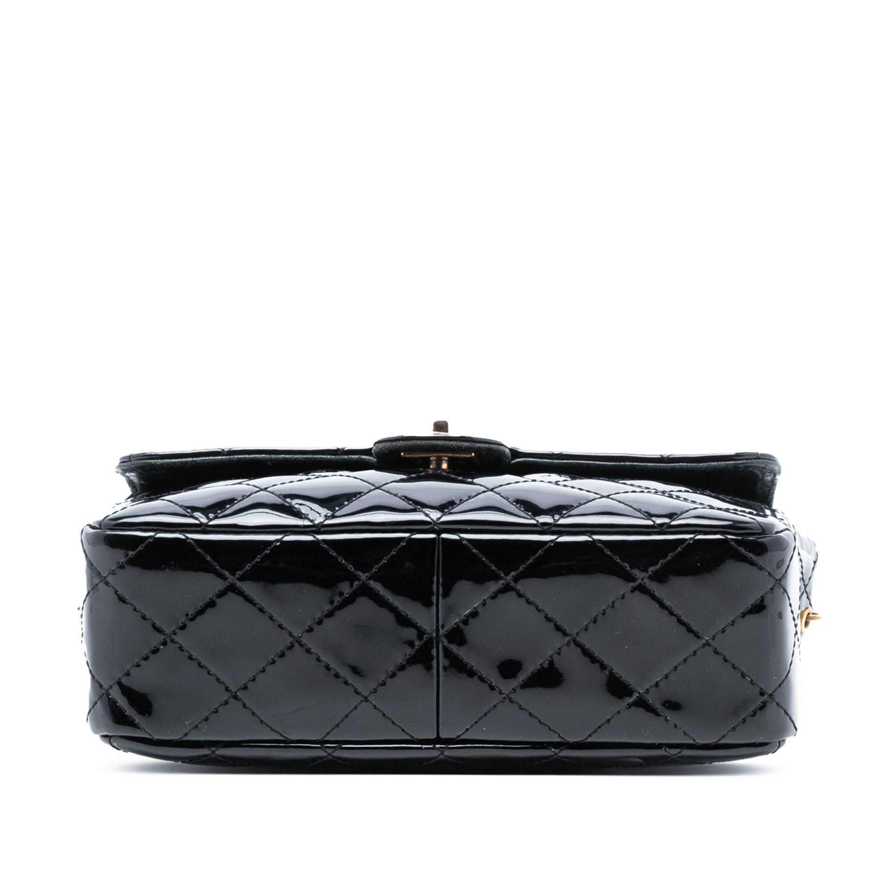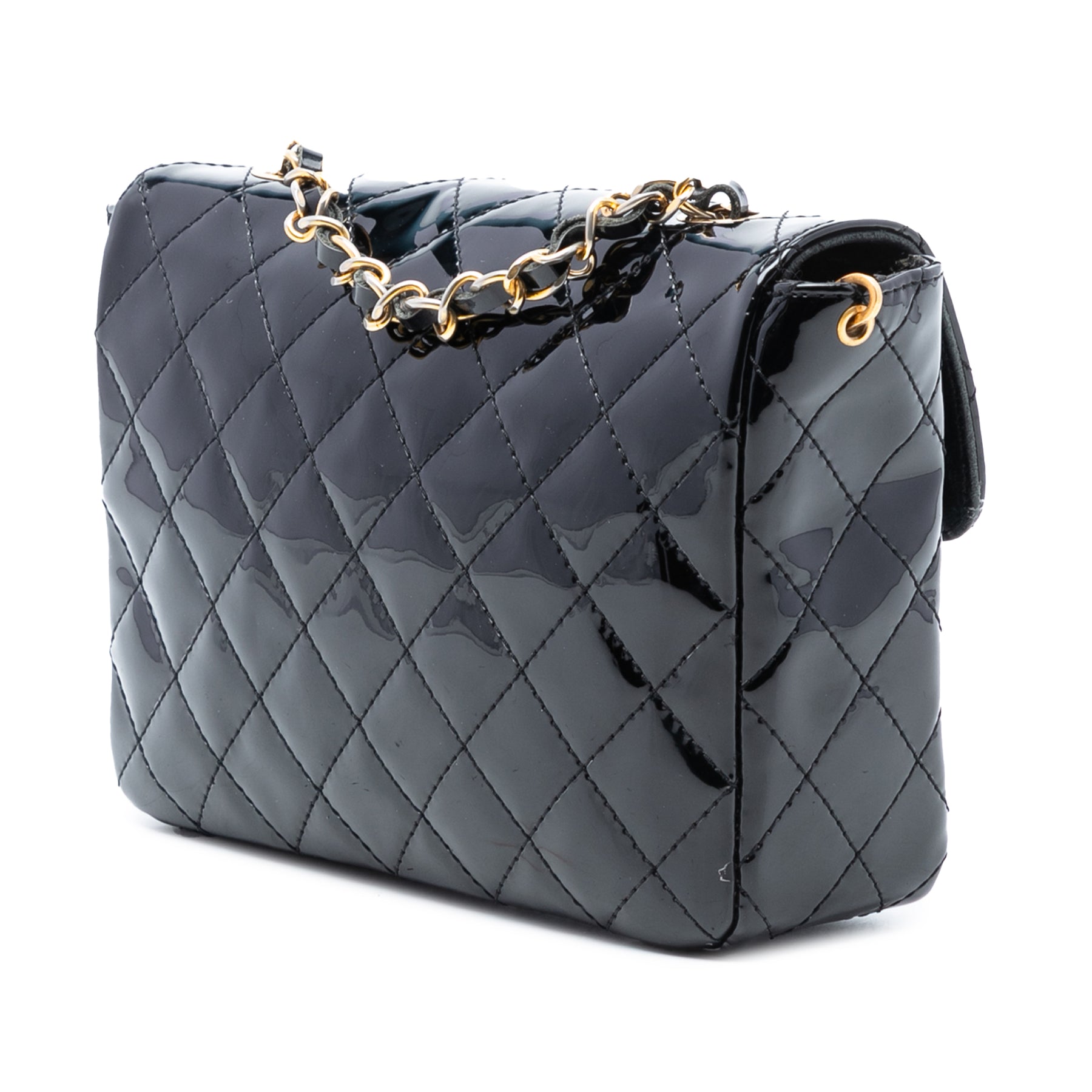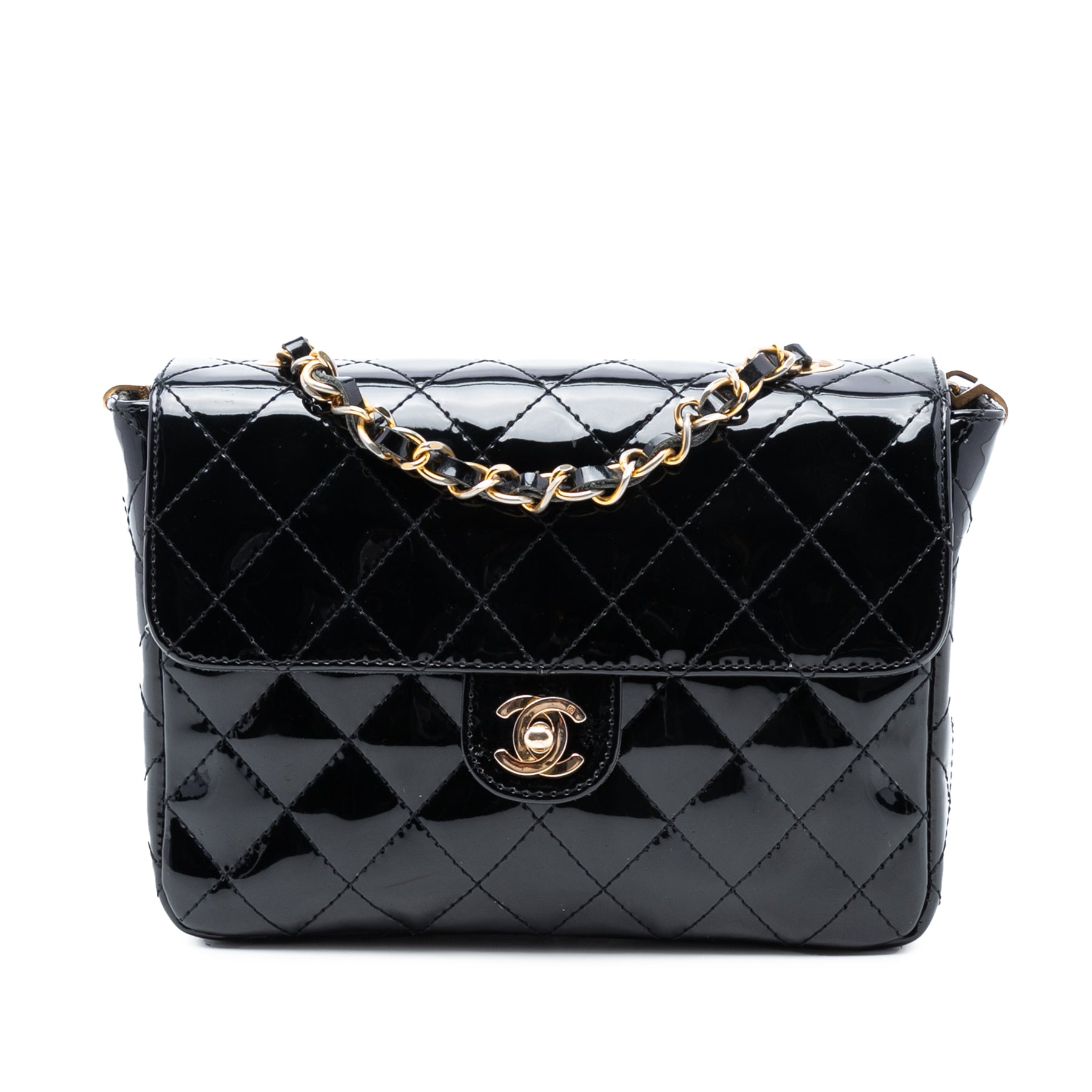 Ce sac bandoulière est en cuir verni matelassé, avec une bandoulière en chaîne tressée de cuir, un rabat avant à fermoir CC et des poches intérieures plaquées. Il est en bon état.