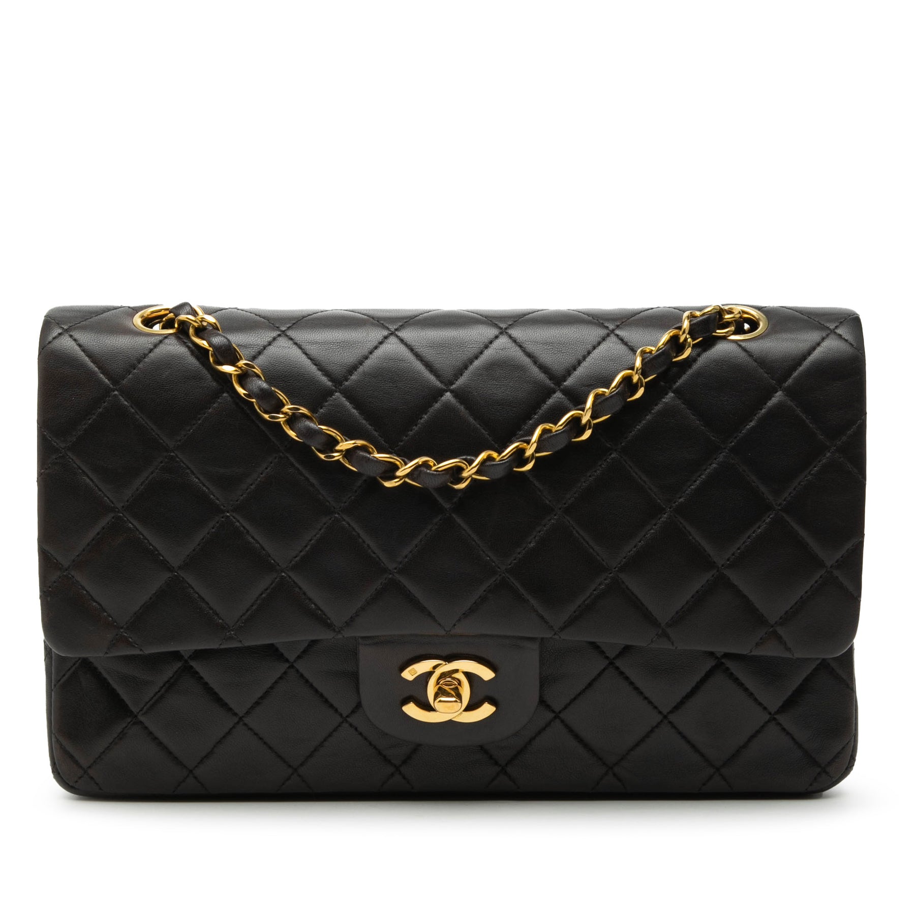 Ce sac bandoulière est confectionné en cuir d'agneau matelassé et présente une poche plaquée extérieure au dos, des bandoulières en chaîne tressée de cuir, un double rabat avant orné du double C entrelacé et d'une fermeture à tourniquet, ainsi que des poches intérieures zippées et plaquées. Il est en bon état.