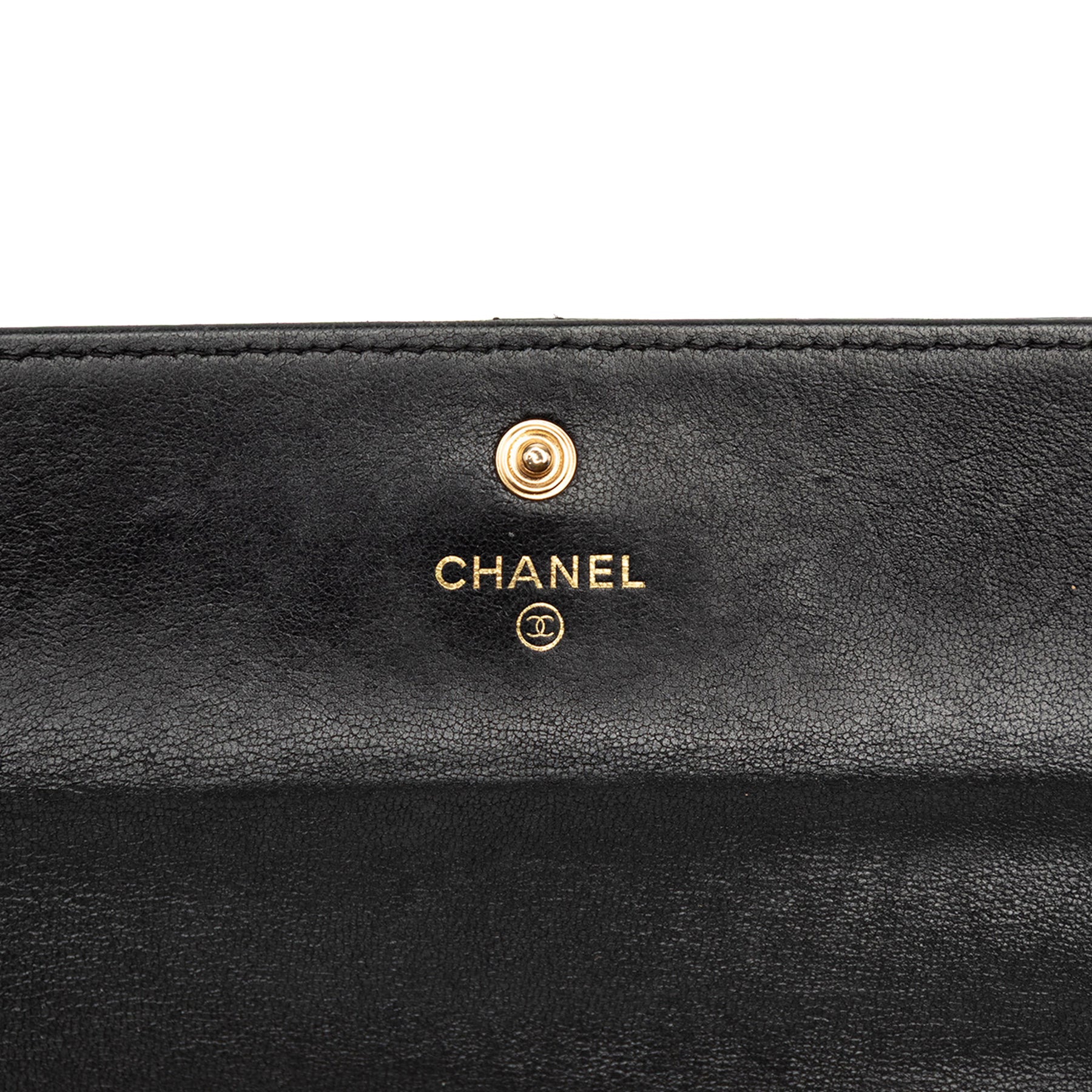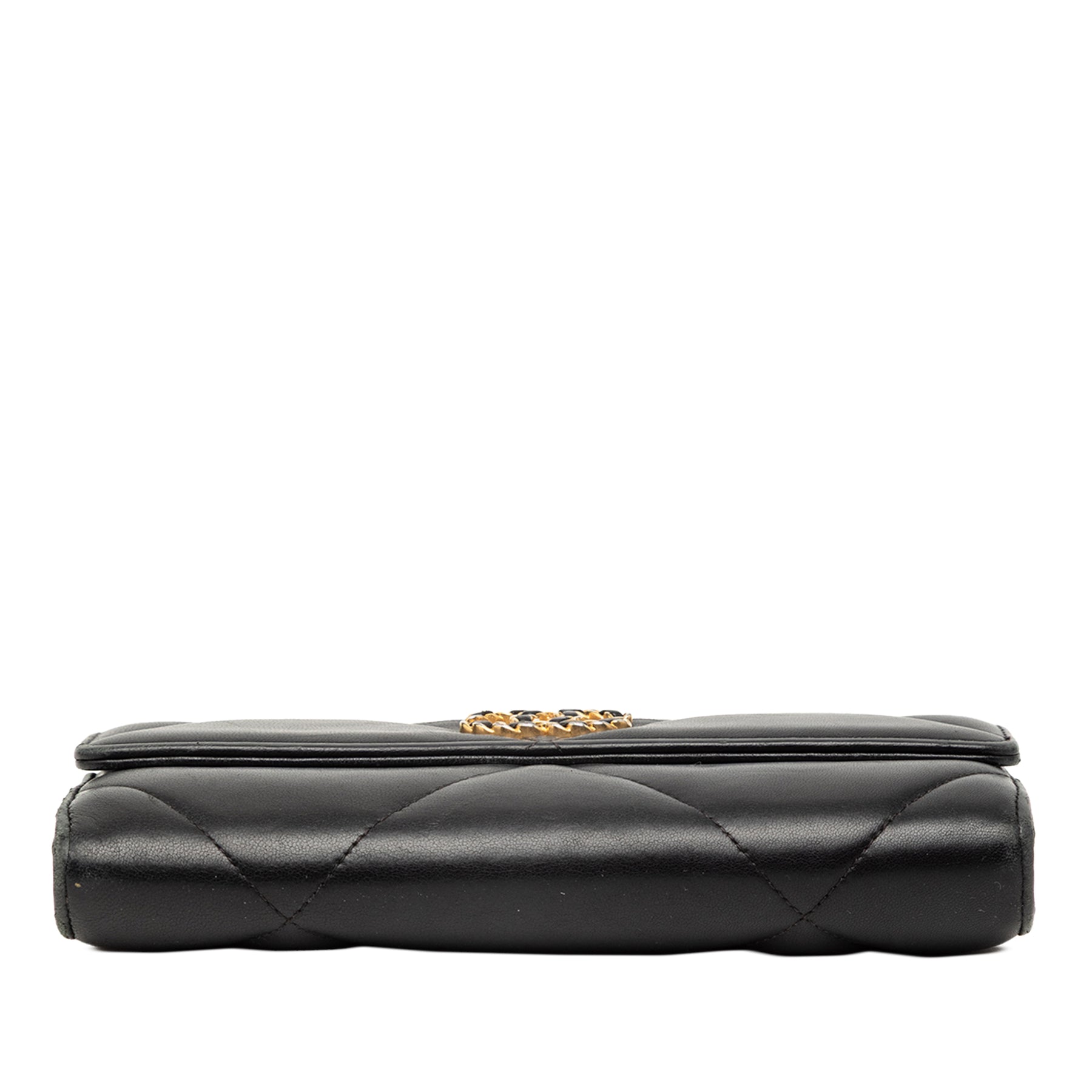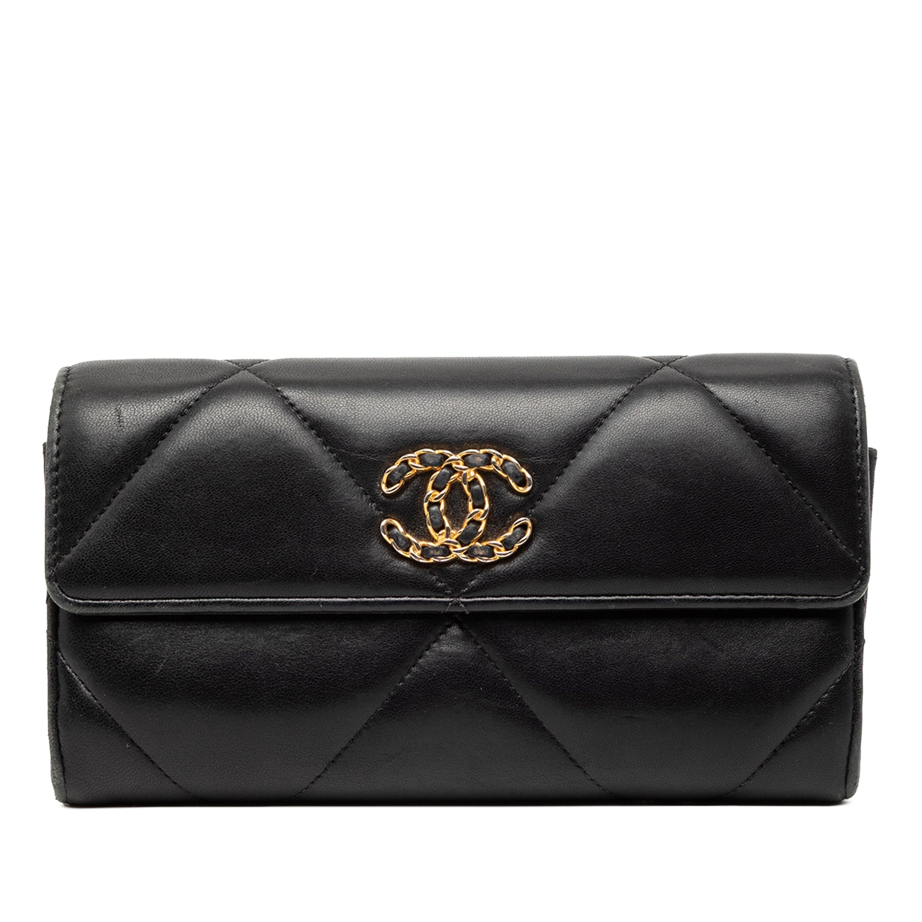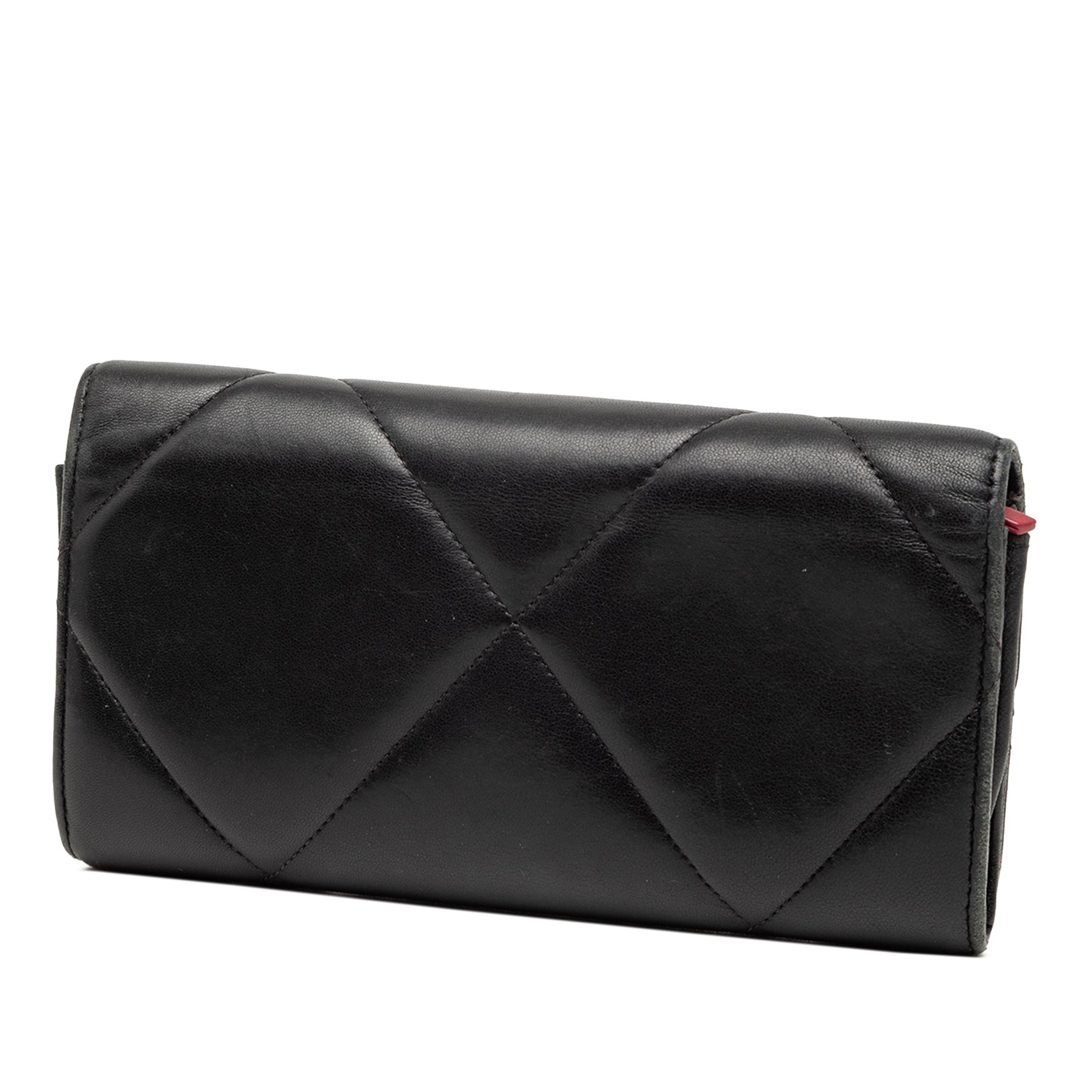 Ce portefeuille long est confectionné en cuir d'agneau matelassé et possède un rabat avant à fermeture pression, ainsi que des poches intérieures zippées et plaquées. Il est en bon état.