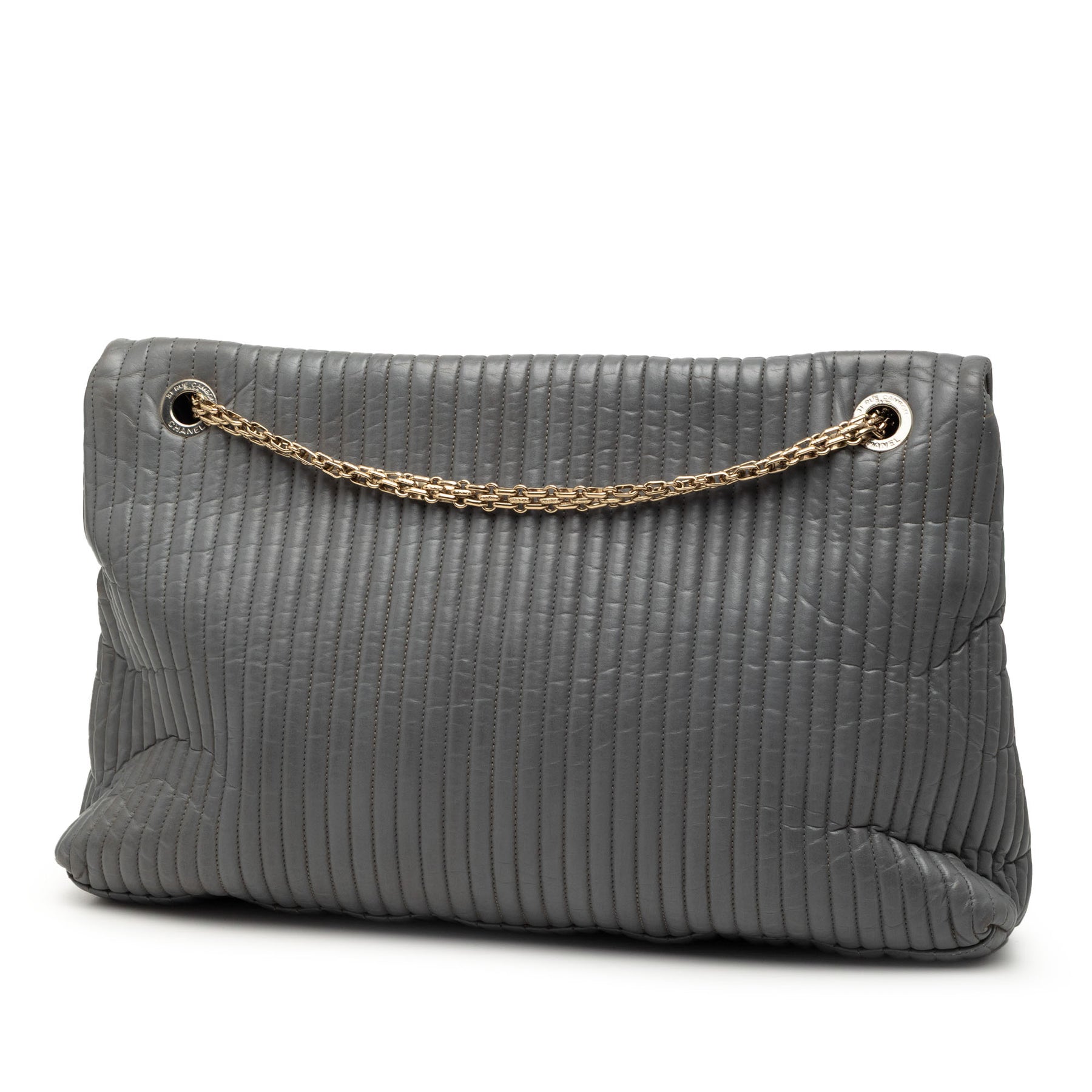 Ce sac bandoulière est confectionné en cuir de veau irisé, possède une bandoulière chaîne bijou, un rabat avant avec fermoir tourniquet, ainsi que des poches intérieures zippées et plaquées. Il est en bon état.