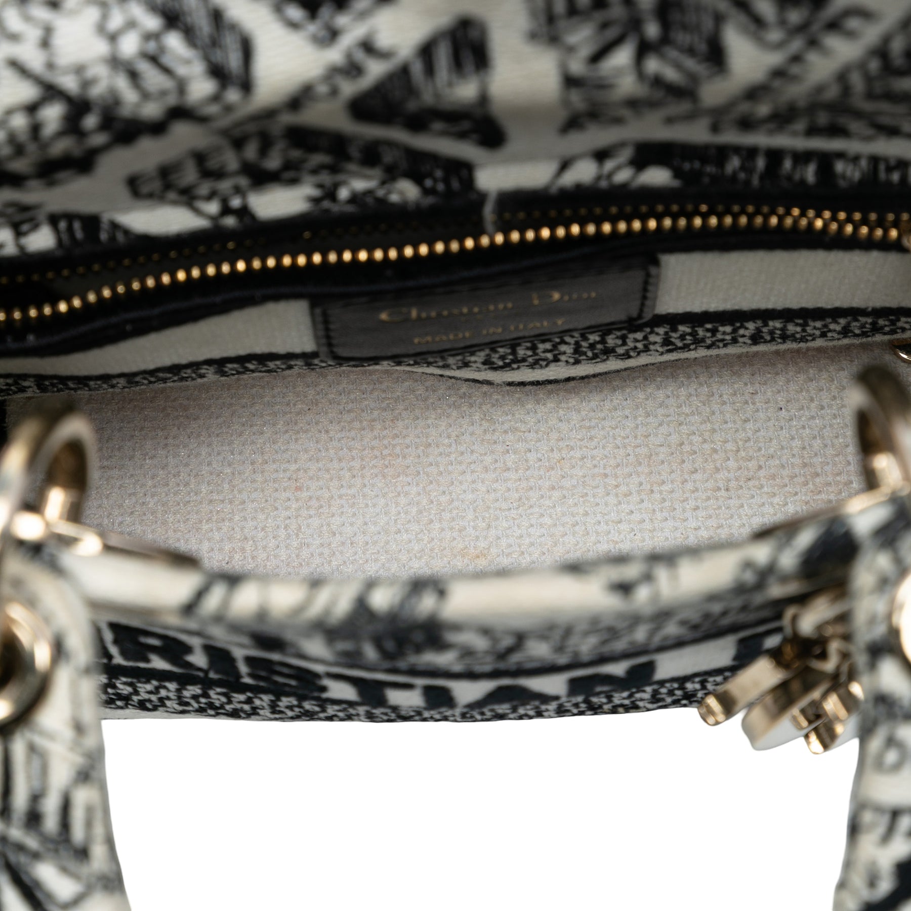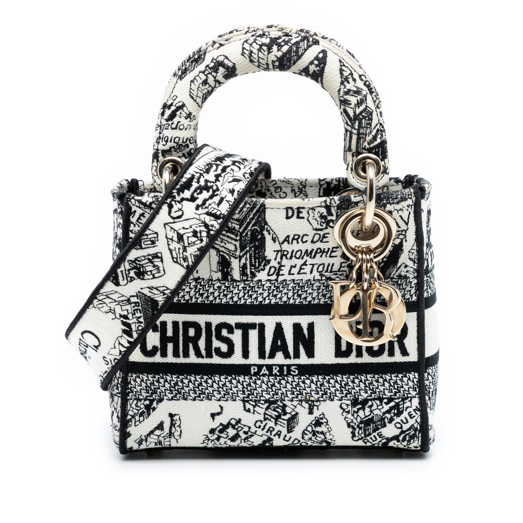 Le sac Lady D-Lite est confectionné en toile brodée et possède des anses structurées, une bandoulière plate amovible, une ouverture sur le dessus avec rabat et une poche intérieure zippée. Il est en bon état.