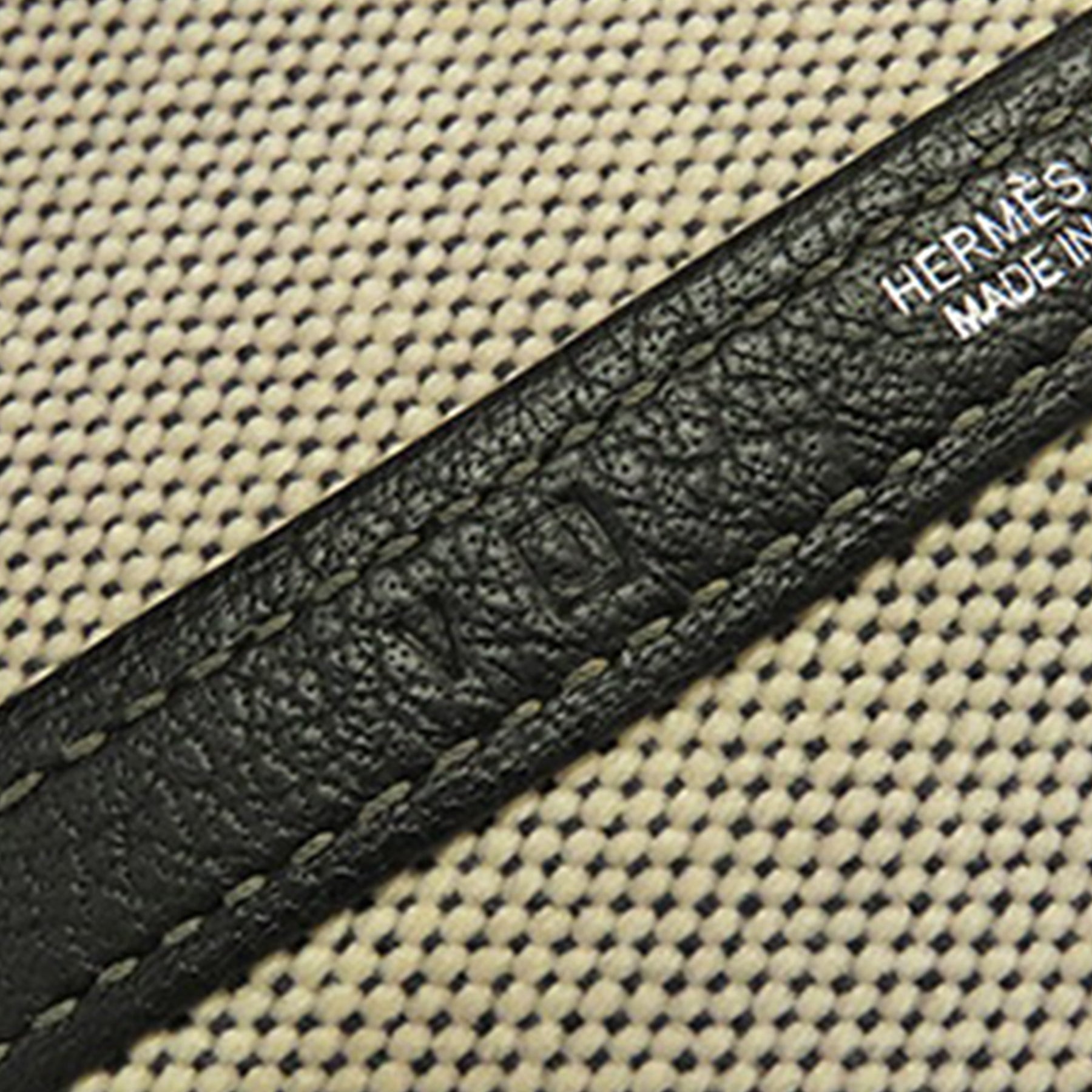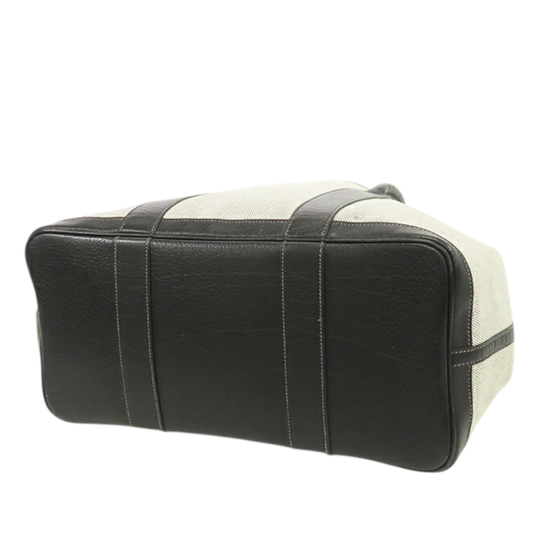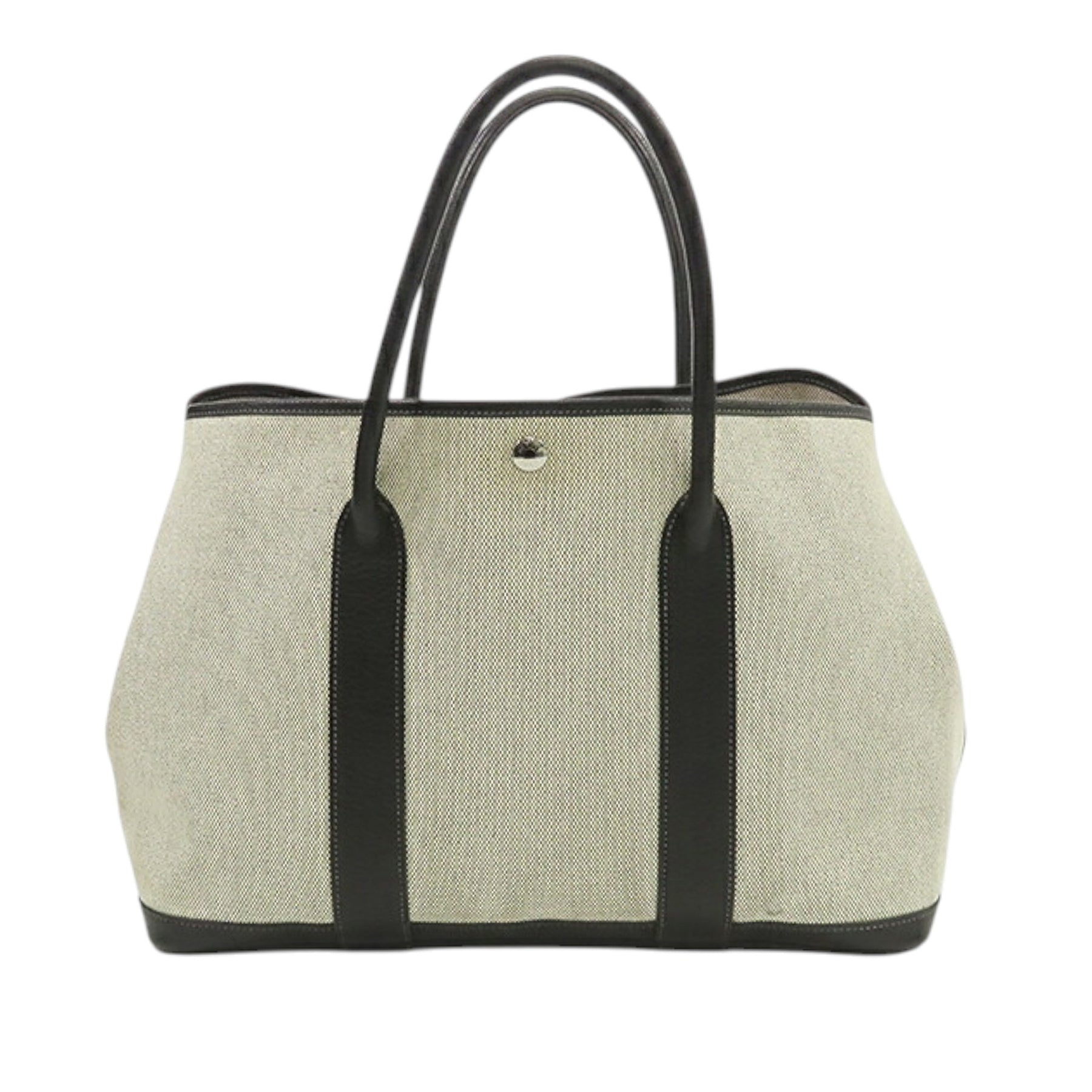 Le sac Garden Party 36 est confectionné en toile avec des finitions en cuir de buffle, des anses roulées en cuir et une ouverture sur le dessus avec fermeture à bouton-pression. Il est en excellent état.