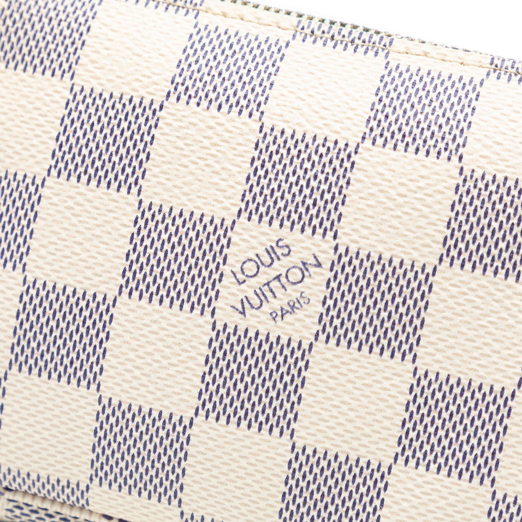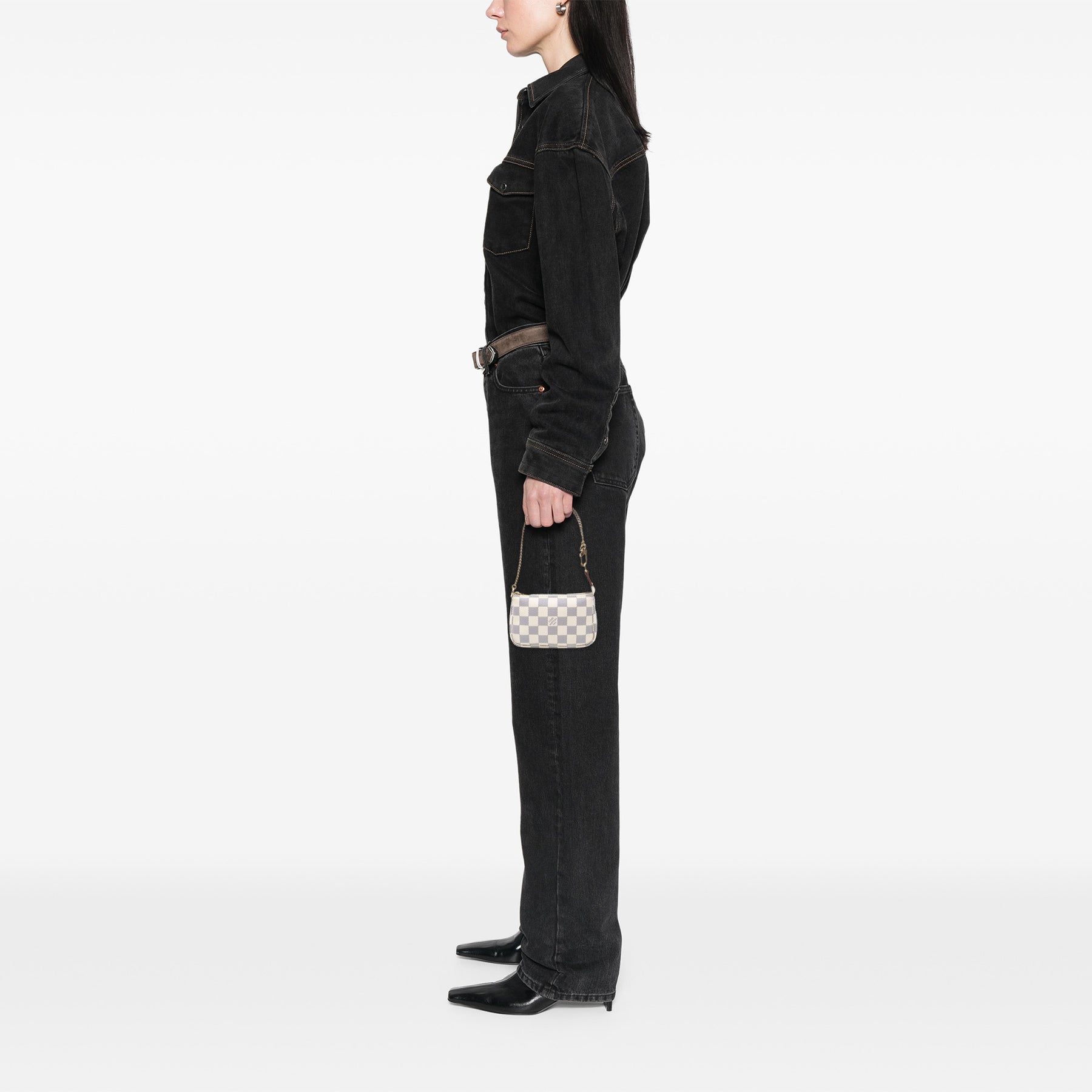 La Mini Pochette Accessoires est confectionnée en toile Damier, possède une bandoulière chaîne amovible et une fermeture zippée sur le dessus. Elle est en excellent état.
