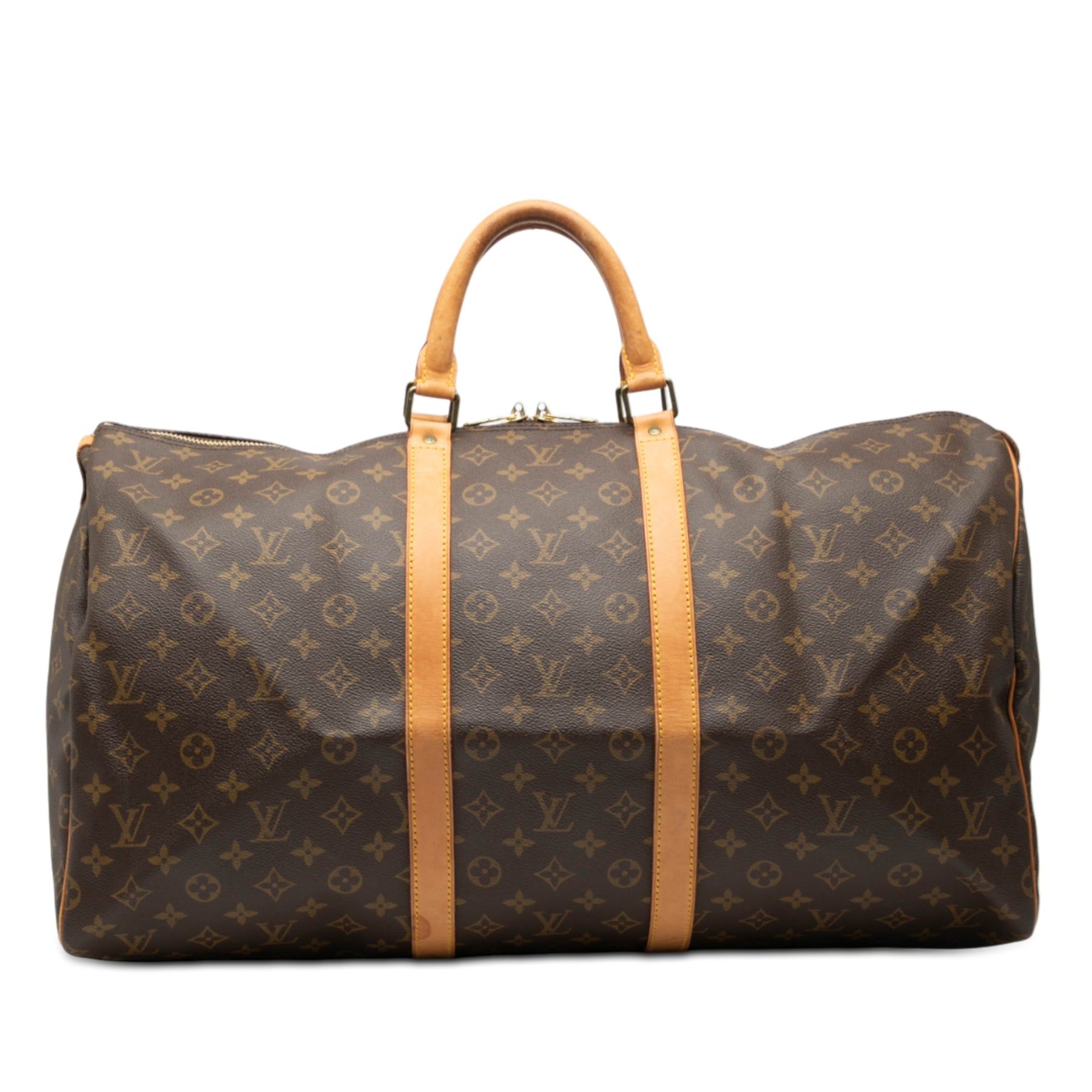 Le sac Keepall 55 est confectionné en toile monogrammée avec des finitions en cuir vachetta, des poignées roulées en cuir vachetta et une fermeture zippée sur le dessus. Son état est correct.