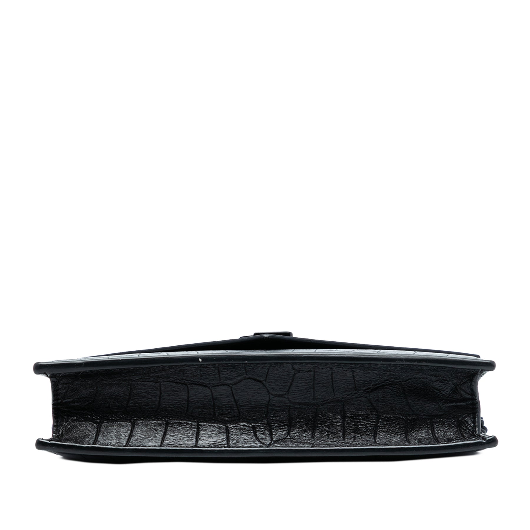 Ce portefeuille à chaîne est confectionné en cuir embossé et possède une bandoulière chaîne avec une lanière en cuir, un rabat avant à fermeture magnétique, ainsi que des poches intérieures zippées et plaquées. Il est en excellent état.