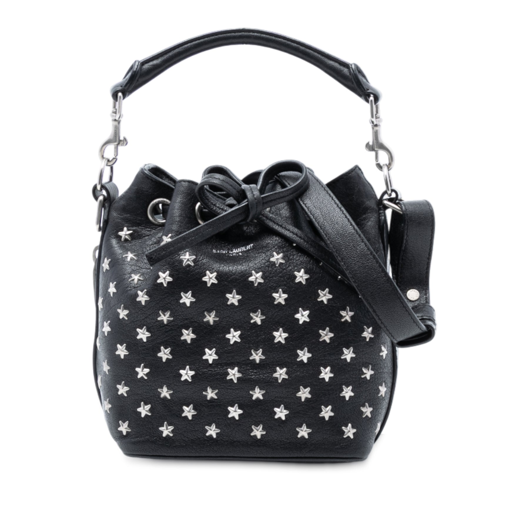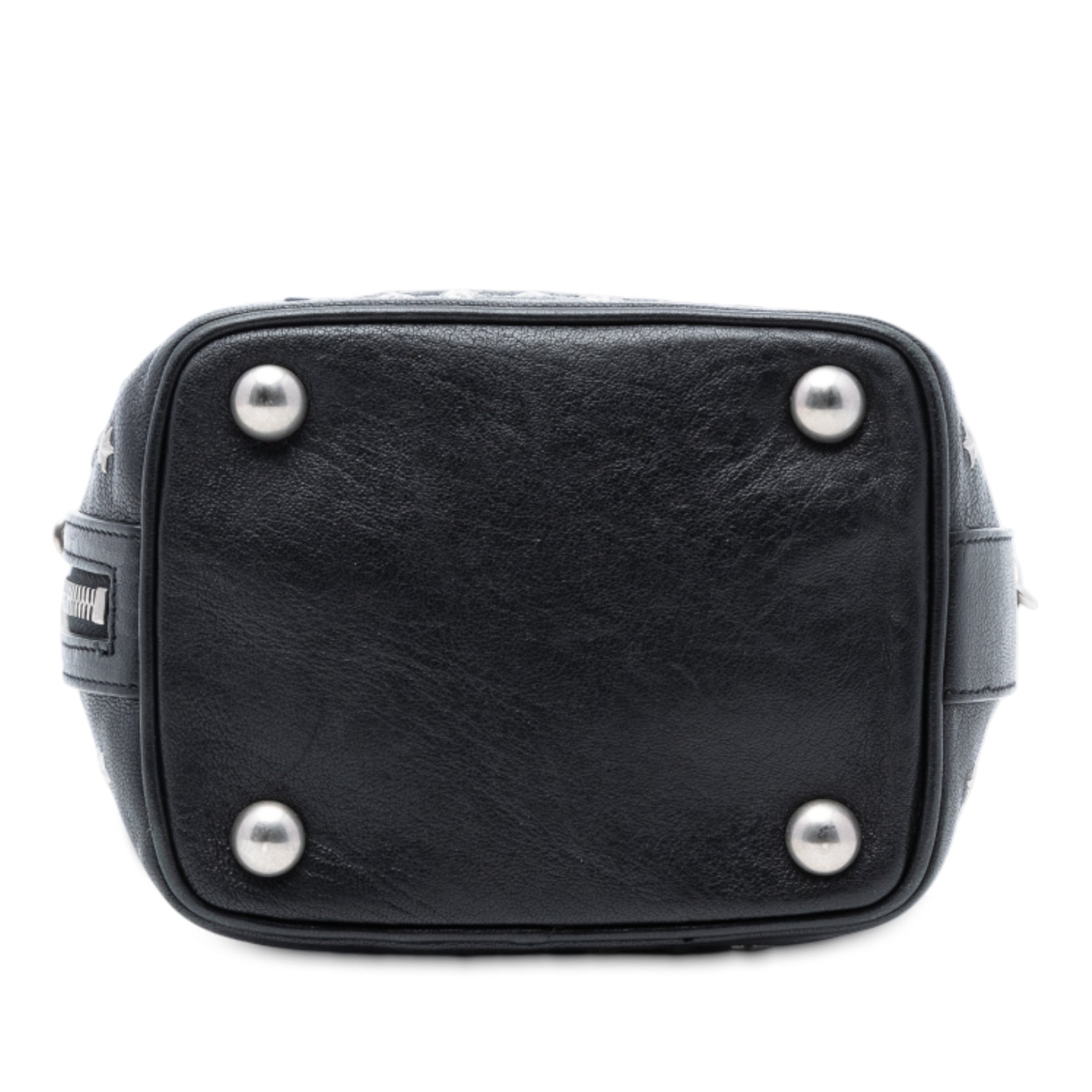 Le sac Emmanuelle est confectionné en cuir orné d'étoiles, possède une poignée supérieure amovible en cuir roulé, une bandoulière plate réglable en cuir et une ouverture sur le dessus avec fermeture à cordon. Il est en bon état.