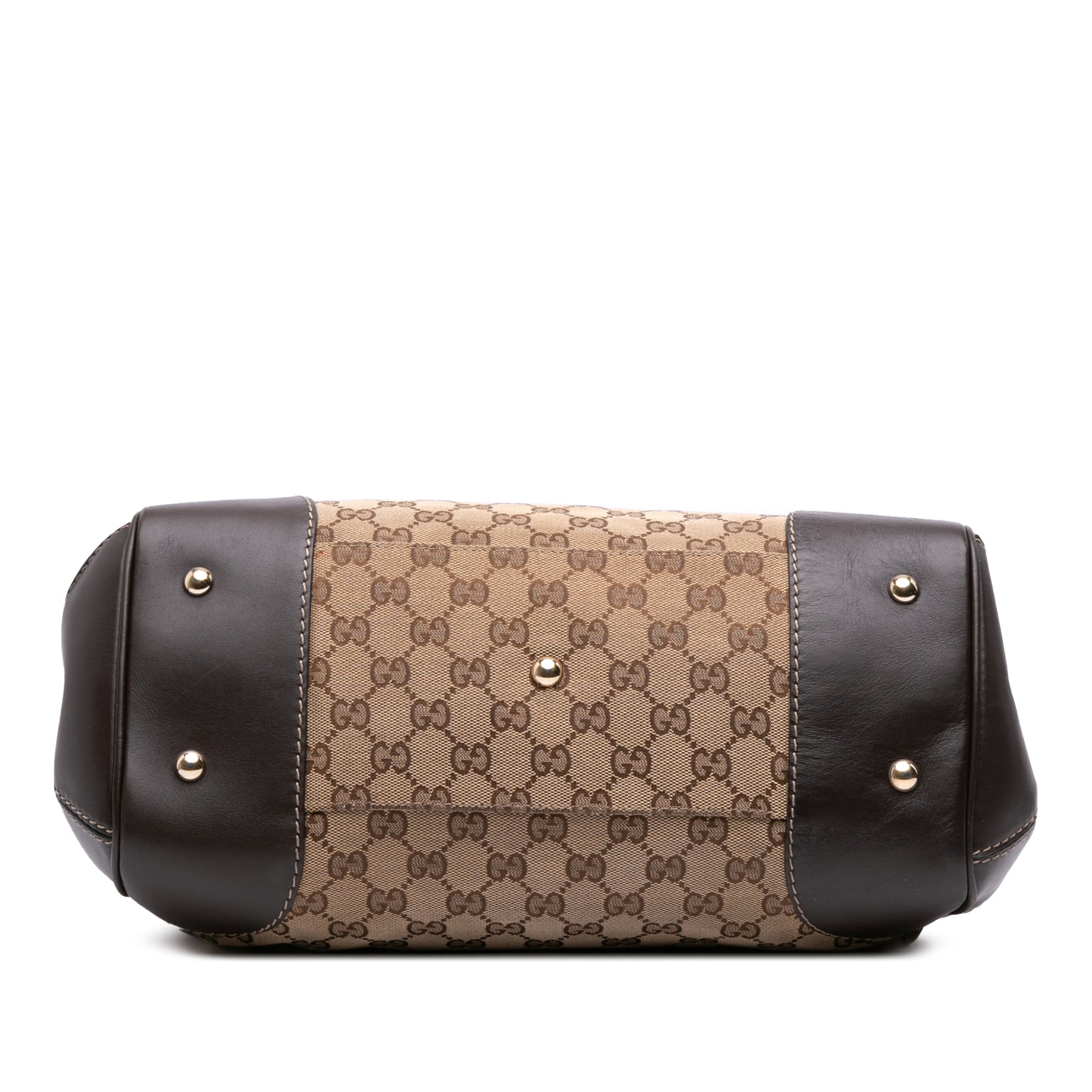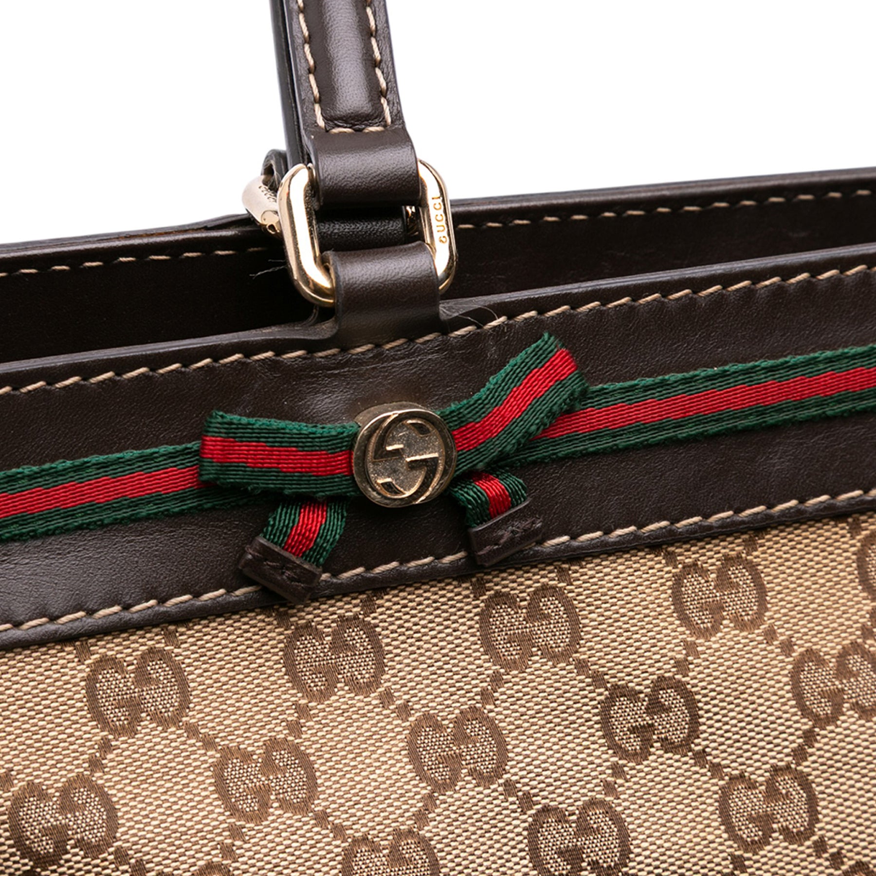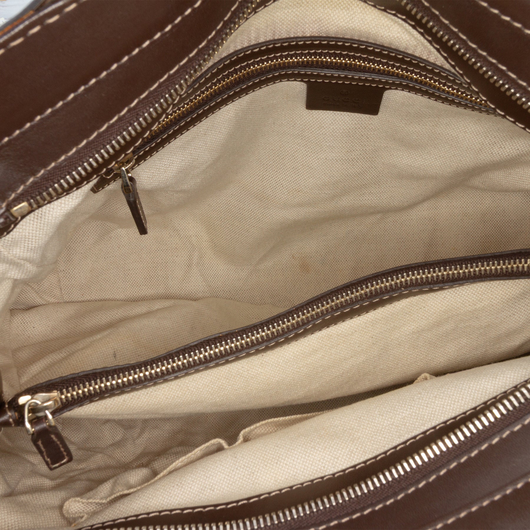 Ce sac cabas est en toile avec finitions en cuir, anses plates en cuir, fermeture zippée sur le dessus, compartiments intérieurs zippés et plaqués, et poches intérieures zippées et plaquées. Il est en bon état.