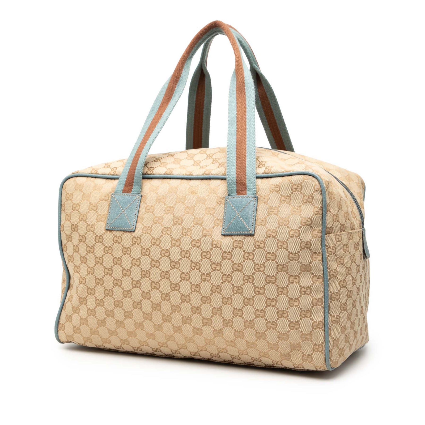 Ce sac de voyage est en toile avec des finitions en cuir, des poignées plates en toile, une fermeture éclair sur le dessus et une poche intérieure zippée. Il est en bon état.