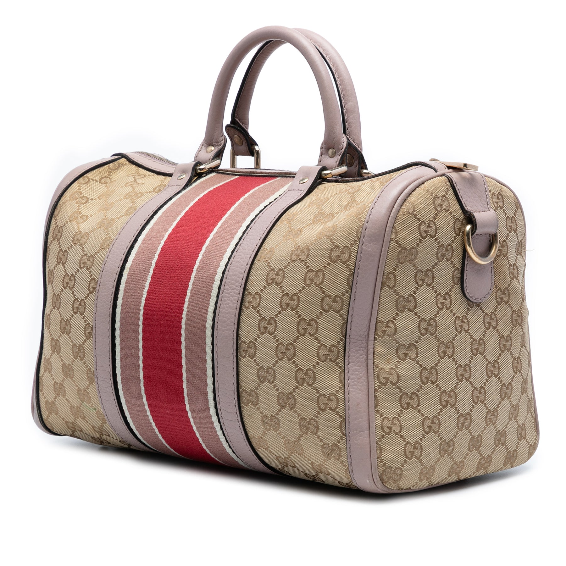 Ce sac à main est en toile avec des finitions en cuir, des poignées roulées en cuir, une bandoulière amovible en cuir, une fermeture zippée sur le dessus et des poches intérieures zippées et plaquées. Il est en bon état.
