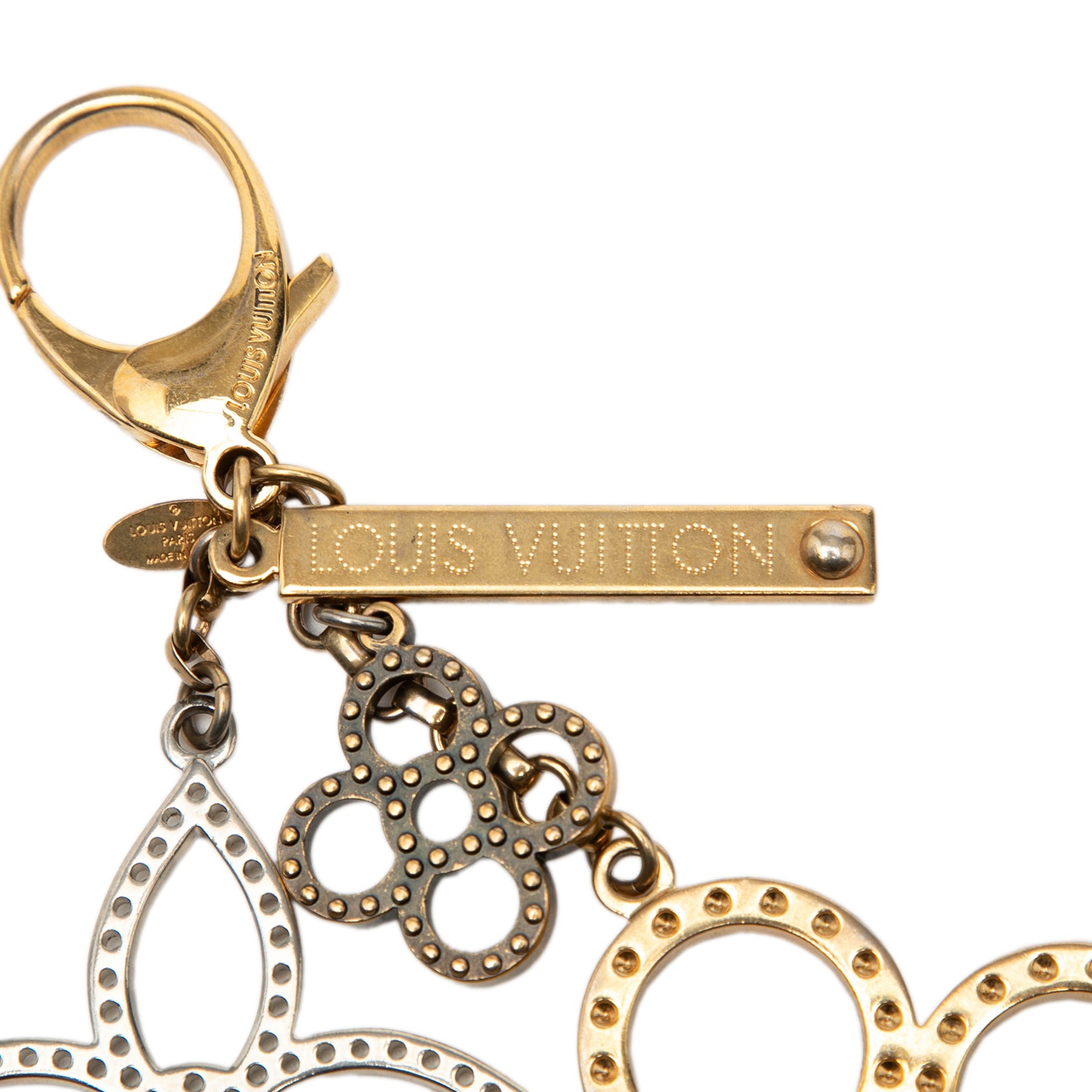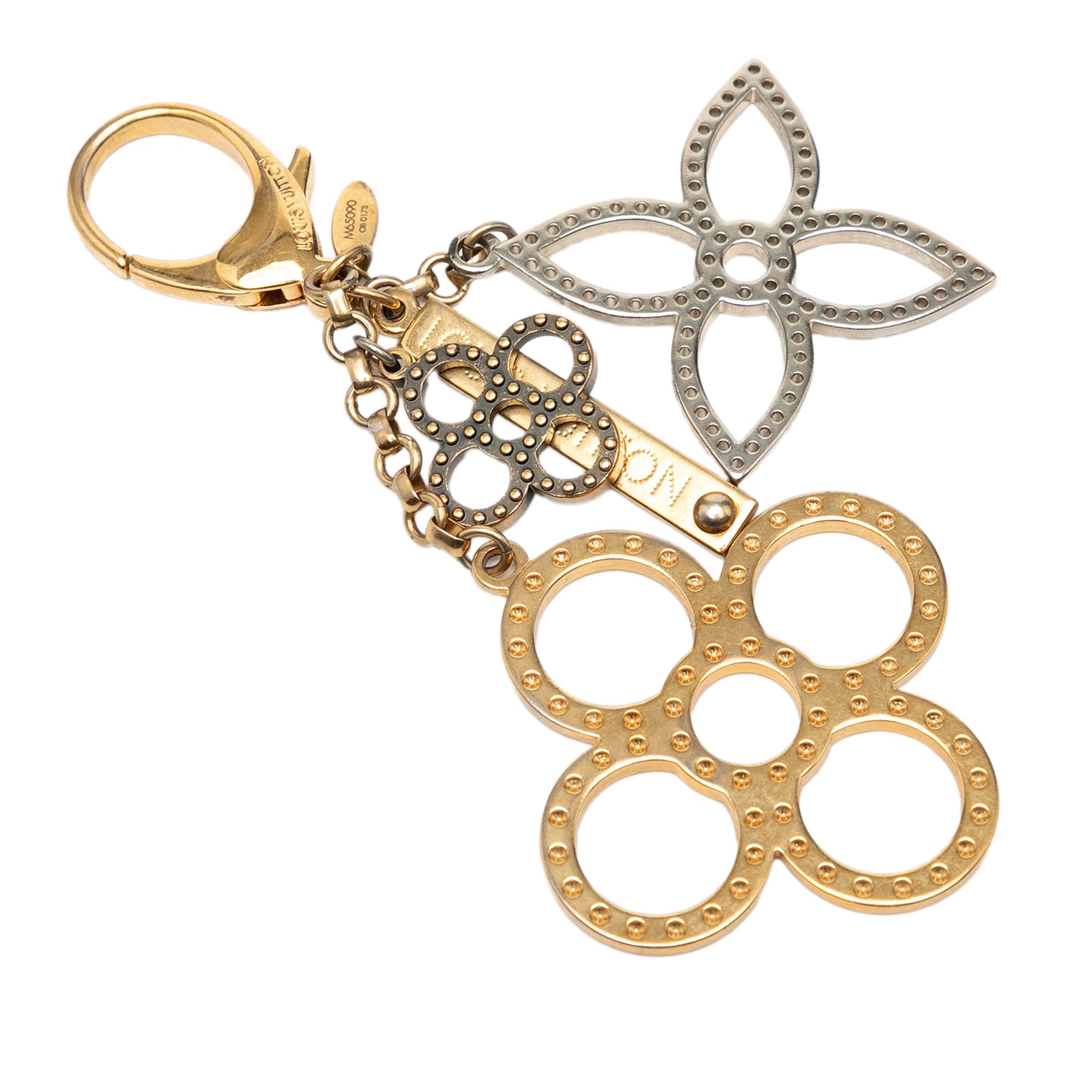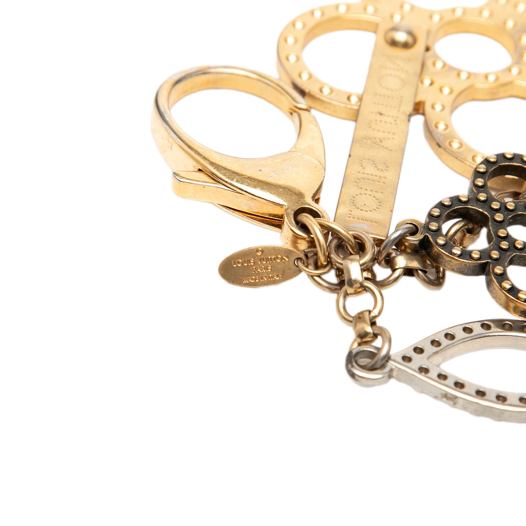 Ce porte-clés est composé d'un corps en métal doré et argenté et se ferme par un fermoir mousqueton. Il est en bon état.