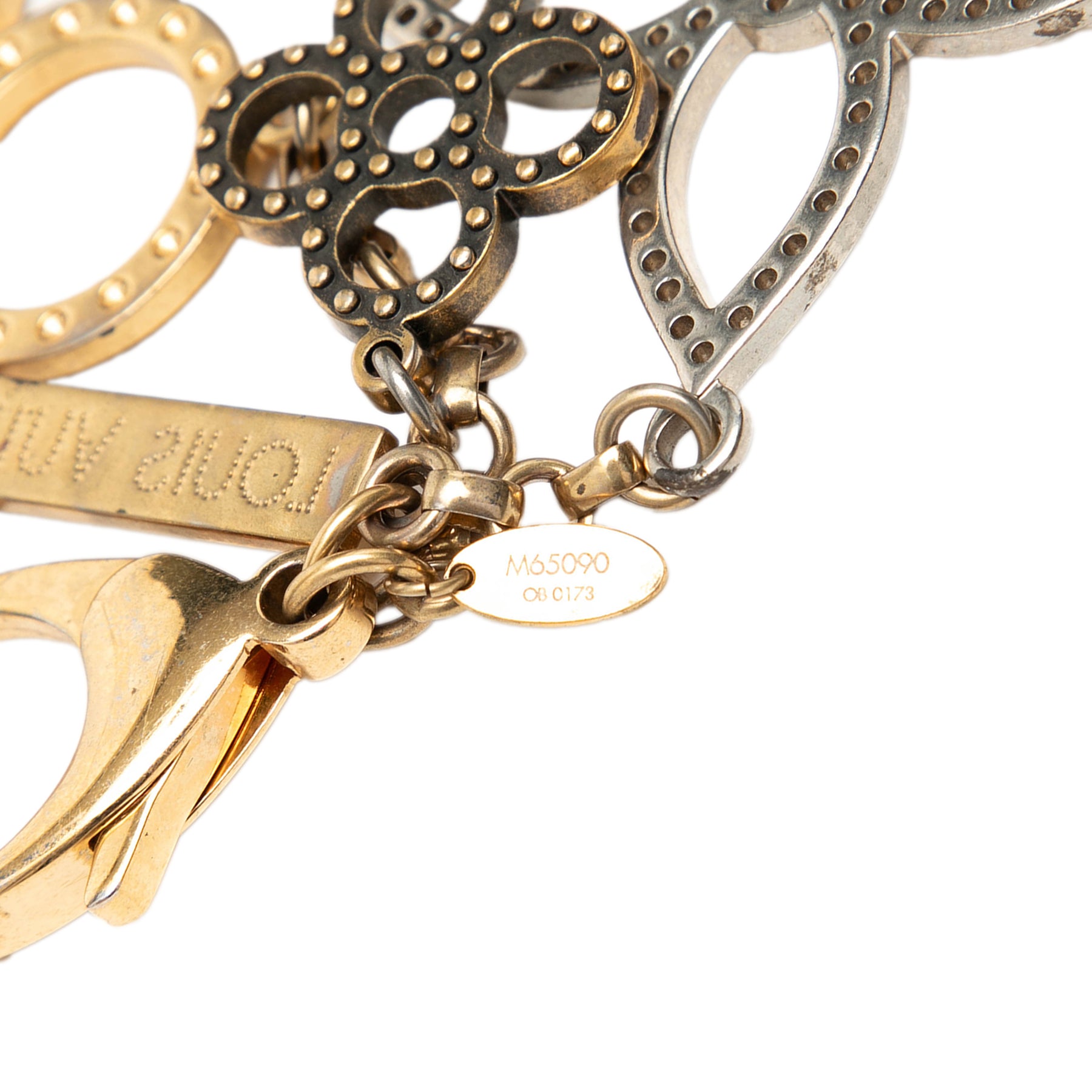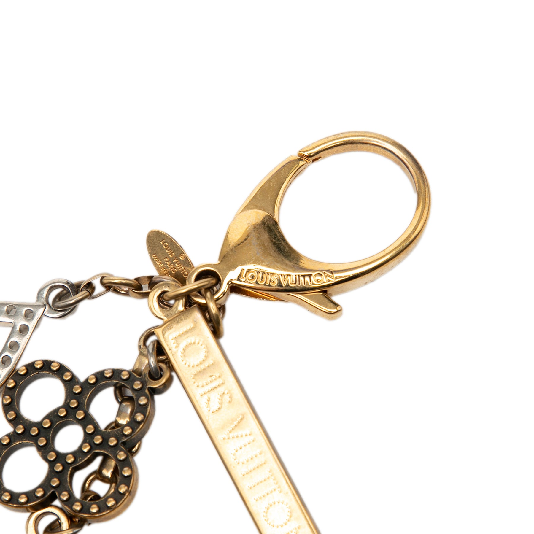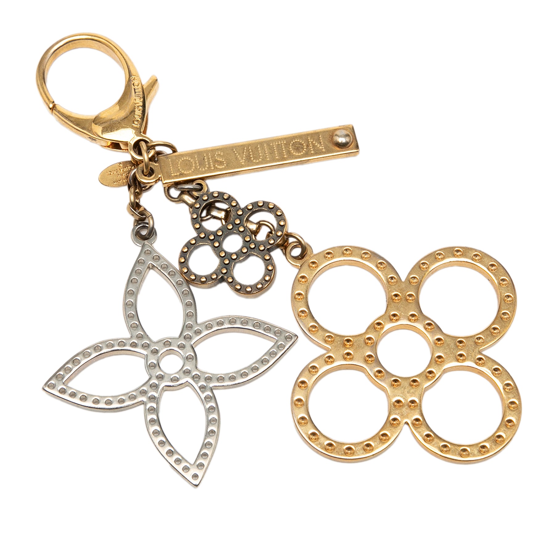 Ce porte-clés est composé d'un corps en métal doré et argenté et se ferme par un fermoir mousqueton. Il est en bon état.