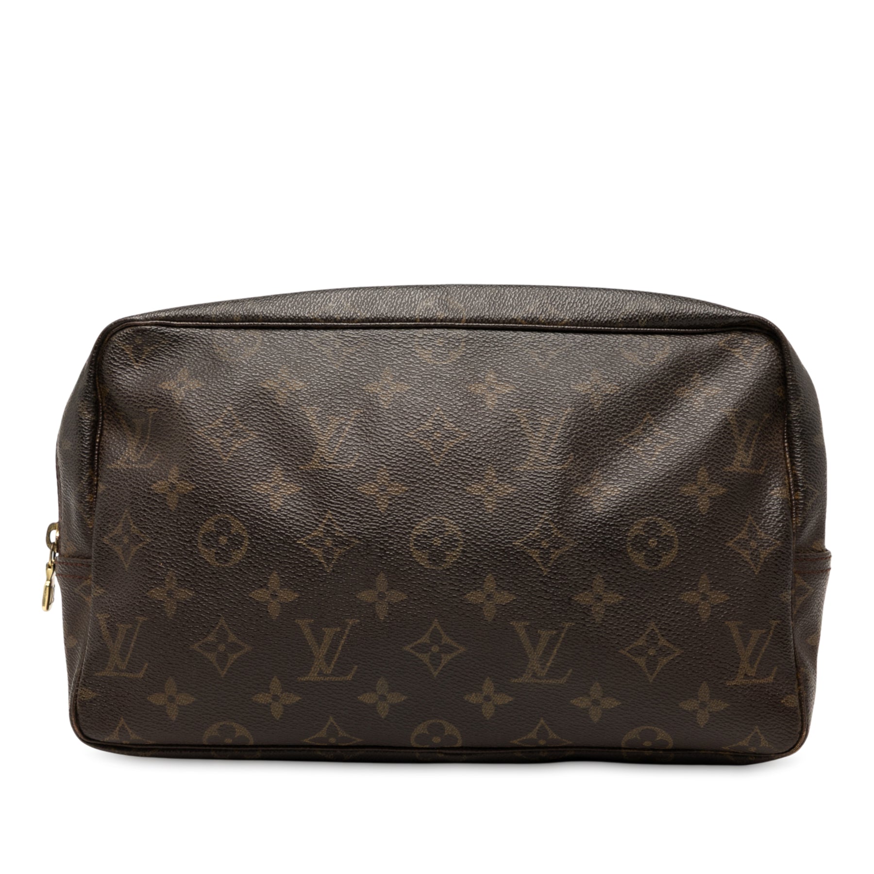 La trousse de toilette 28 est confectionnée en toile monogrammée, possède une fermeture zippée sur le dessus et une poche intérieure plaquée. Elle est en excellent état.