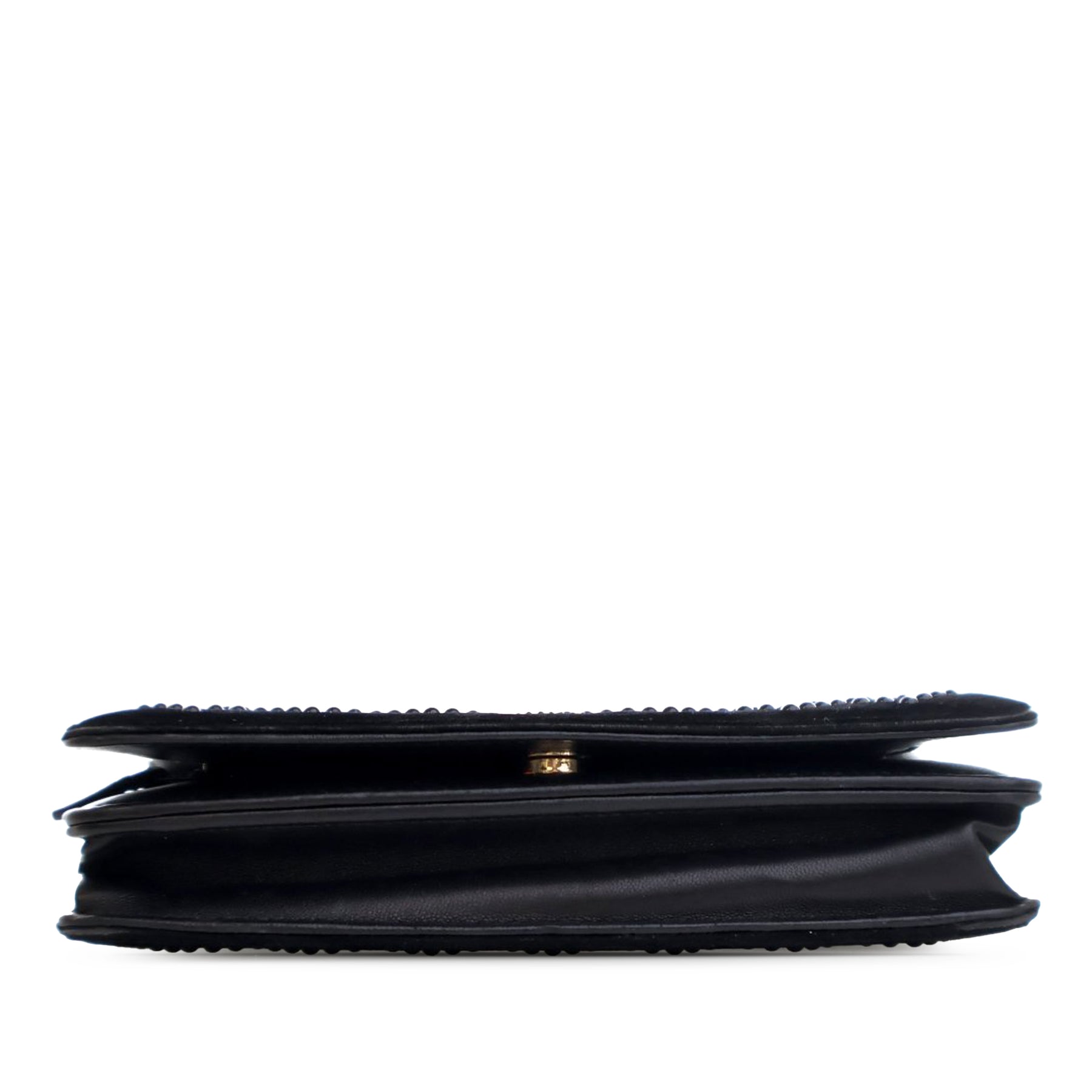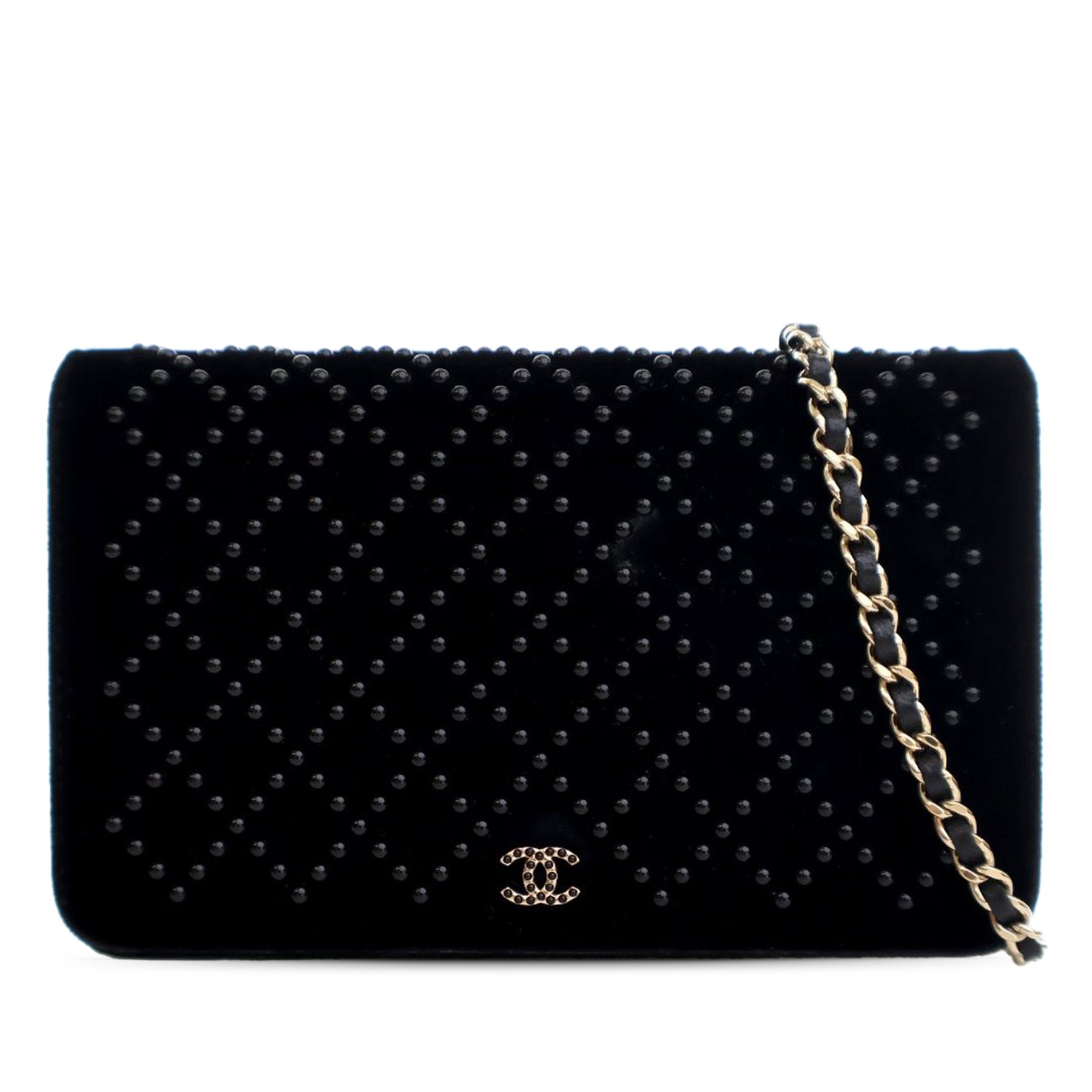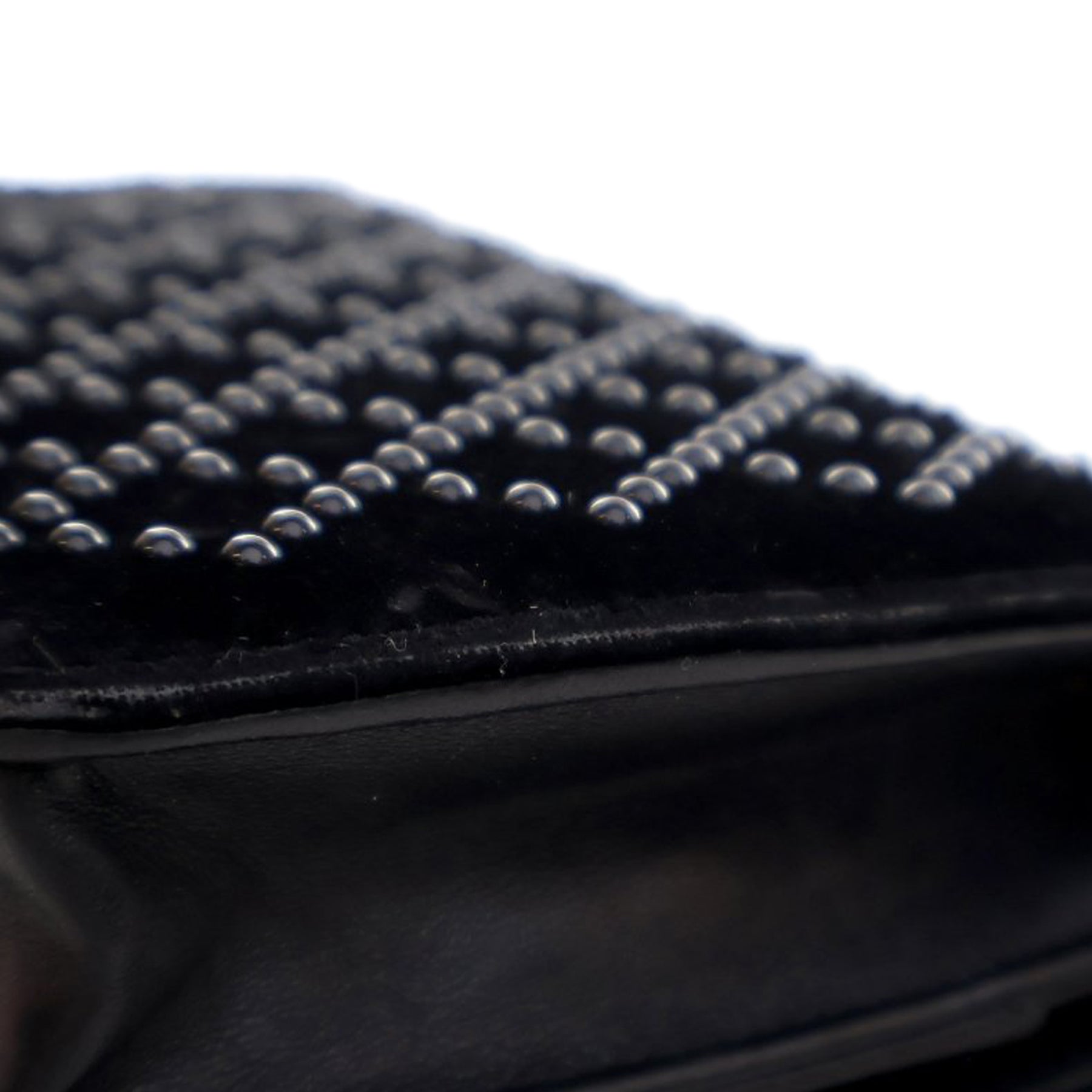 Ce portefeuille à chaîne est confectionné en velours orné de détails raffinés, possède une bandoulière en chaîne tressée de cuir, un rabat à bouton-pression, un compartiment intérieur zippé et des poches intérieures plaquées. Il est en excellent état.