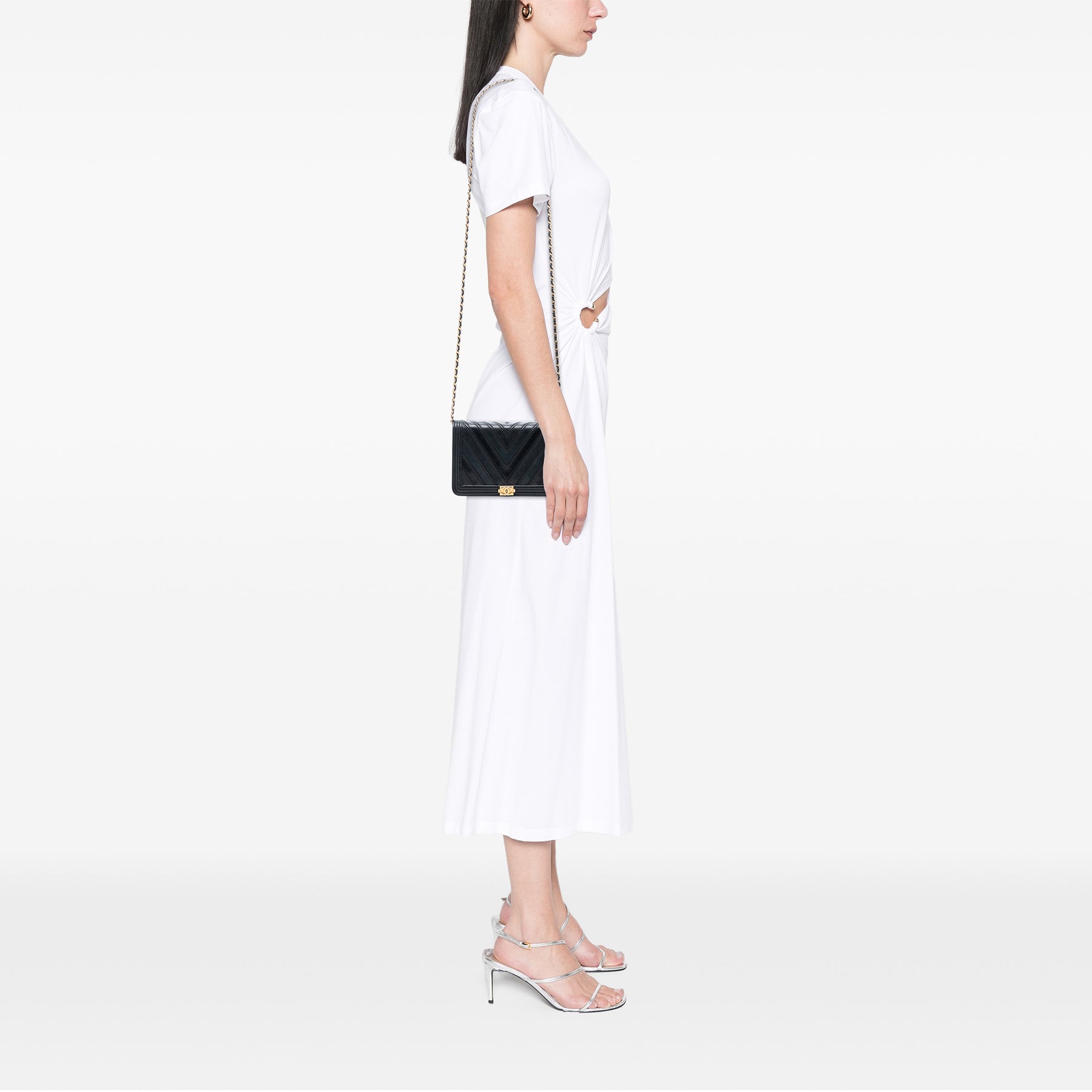Ce portefeuille à bandoulière chaîne est confectionné en cuir matelassé et mélangé, et possède une bandoulière chaîne en cuir tressé, un rabat avant avec fermeture à bouton-pression, ainsi que des poches intérieures zippées et plaquées. Il est en bon état.